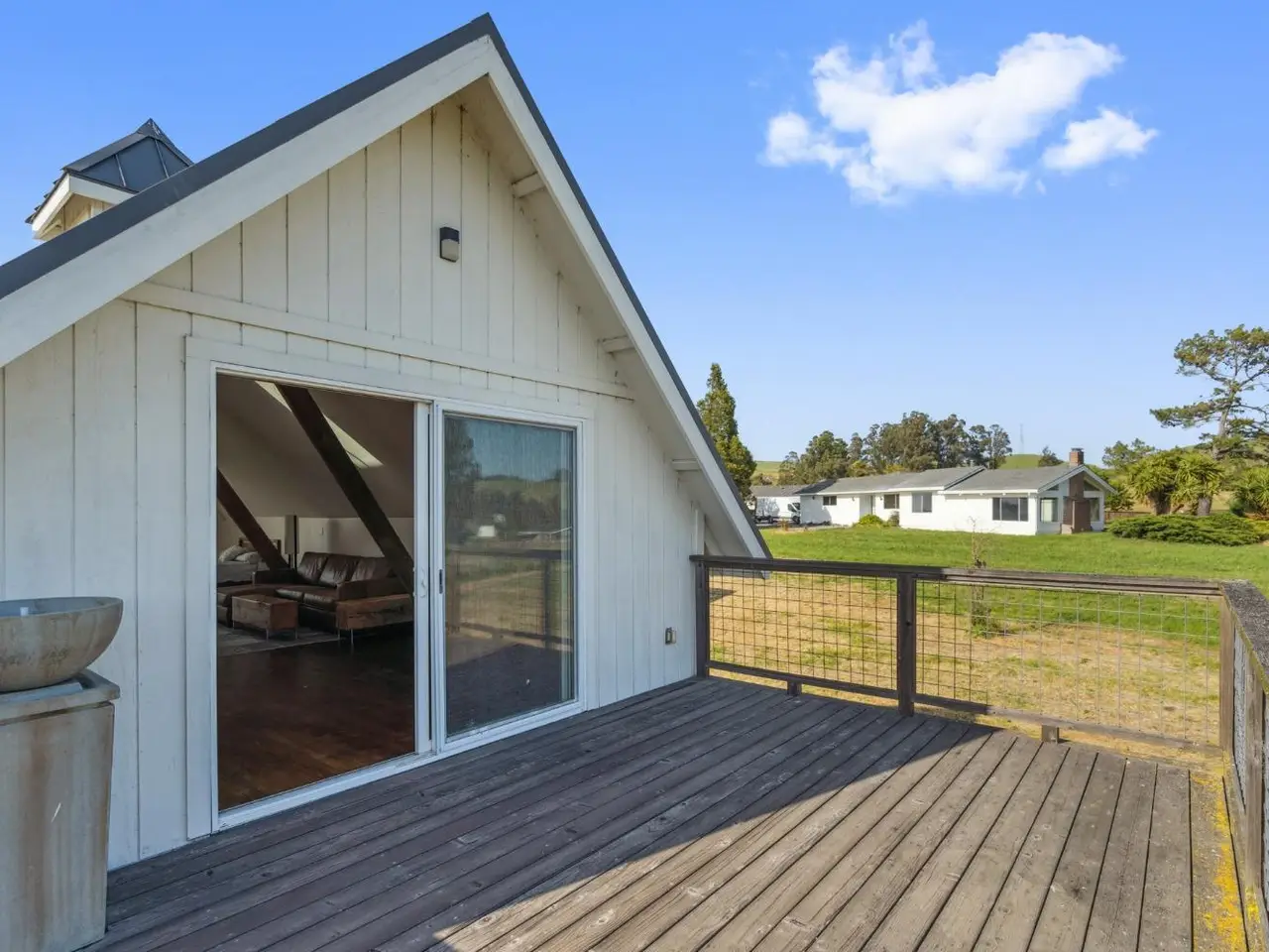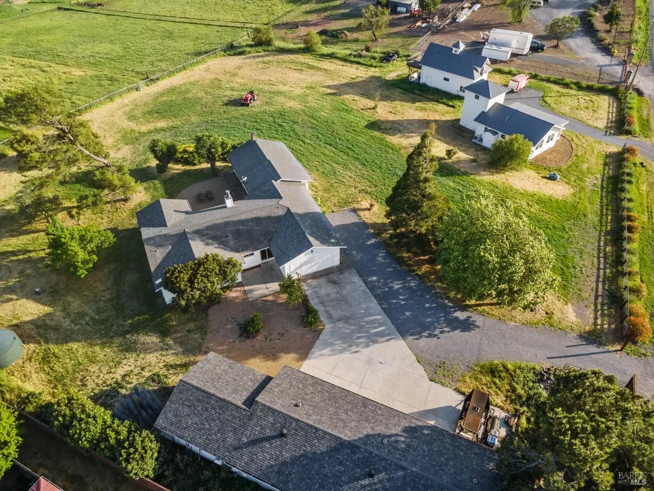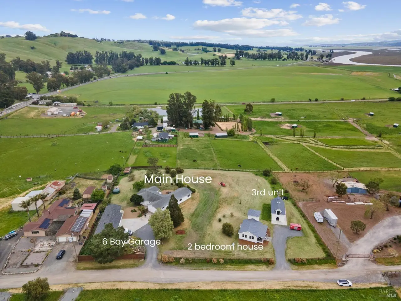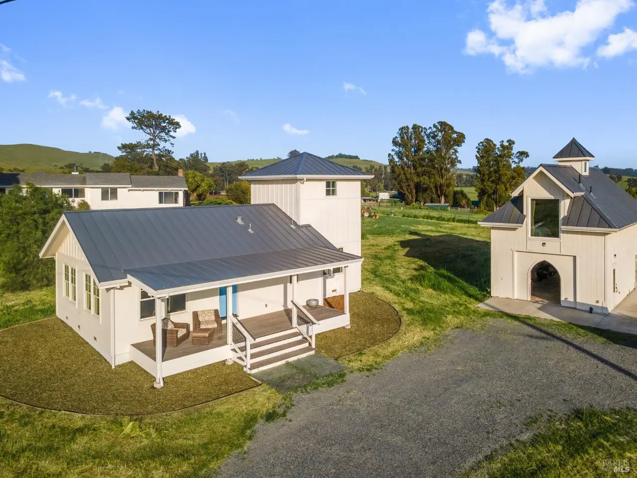 Live the way you want on this tucked-away 2.2-acre estate retreat featuring panoramic views, wide open space, and endless possibilities. Set back from the road for maximum privacy, with access from Nolalia Lane, this rare, multi-home property offers sweeping southern and western views where land, light and livability converge. Gaze out at Mt. Tam and the Petaluma River as the light shifts across the fields. Mature fruit trees dot the exterior; diverse agricultural zoning opens the door to a variety of uses. Neighboring a horse rescue, the setting is ideal for anyone seeking a deeper connection to nature. Main 3-bed, 2-bath residence has been thoughtfully updated with fresh paint, refreshed kitchen; converted garage offers extra living and workspace. Recently built 2-bed, 1-bath farmhouse-style secondary home features nearly 1,000 sq ft of modern simplicity and natural light, perfect for guests, multi-gen households, rental income. Iconic separate studio, modeled after an Icelandic schoolhouse, offers full bath, kitchenette and garage/storage space. Detached 6-bay garage provides space for hobbies, storage, projects. Each structure is positioned to maximize landscape views. Minutes to the city, yet a world away, this is a rare mix of privacy, functionality and natural beauty.