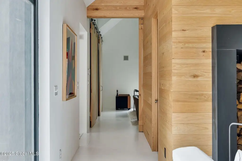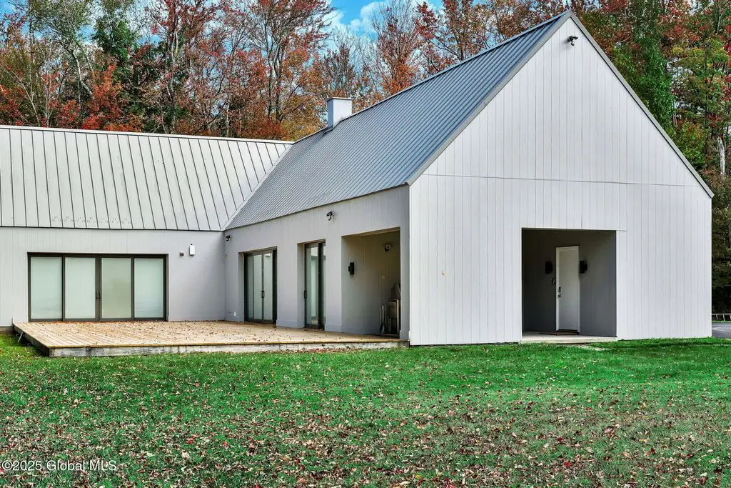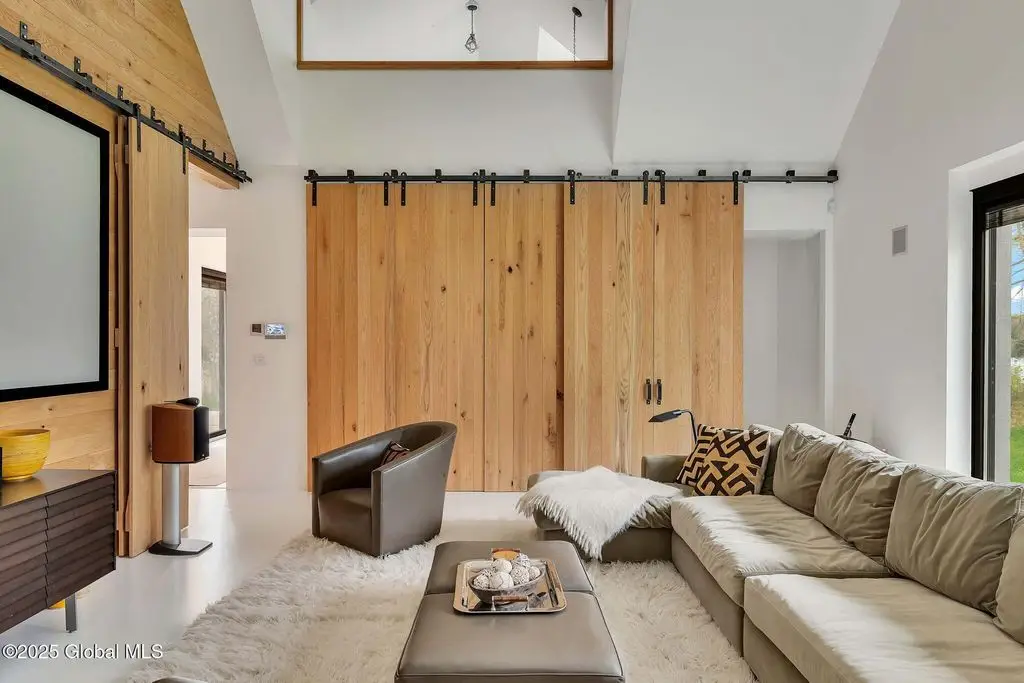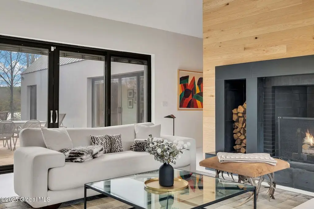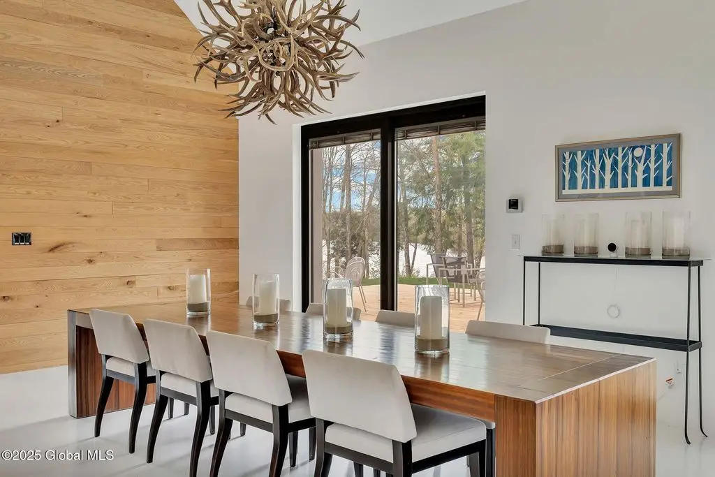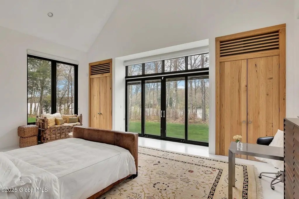 Introducing 500 Pond View Way, a bold modern retreat set on 700 feet of pristine lakefront on Dyken Pond. Designed by the internationally renowned firm Kallos Turin, this one-of-a-kind home blends dramatic architecture with serene waterfront living. It features soaring ceilings, white oak accents, and custom built-ins throughout. The Great Room offers a sleek modern kitchen, a spacious dining area, and a warm, inviting living space centered around a wood-burning fireplace. Walls of sliding glass doors frame peaceful views of the lake from nearly every room, and the primary suite is thoughtfully positioned to capture stunning water views. A separate two-bedroom guest house provides privacy for visitors, making it ideal for extended stays or rental potential. Enjoy quiet evenings or entertaining on the expansive lakeside deck. Residents may enjoy boating on this private 134-acre lake. There are no known restrictions for short-term rentals, making this a perfect opportunity for Airbnb. A beach permit is active for 500 Pond View, and the water depth is approximately four feet at the end of the dock. Sophisticated, peaceful, and perfectly in tune with nature, this is modern lakefront living at its finest.