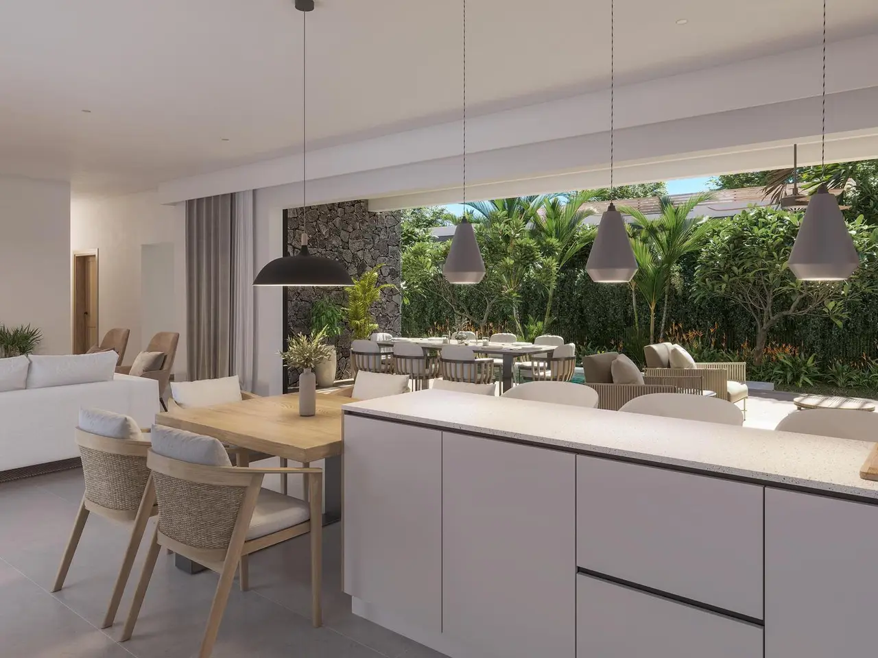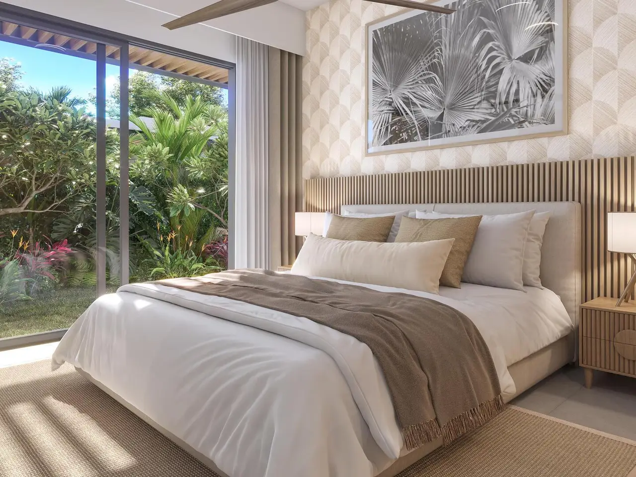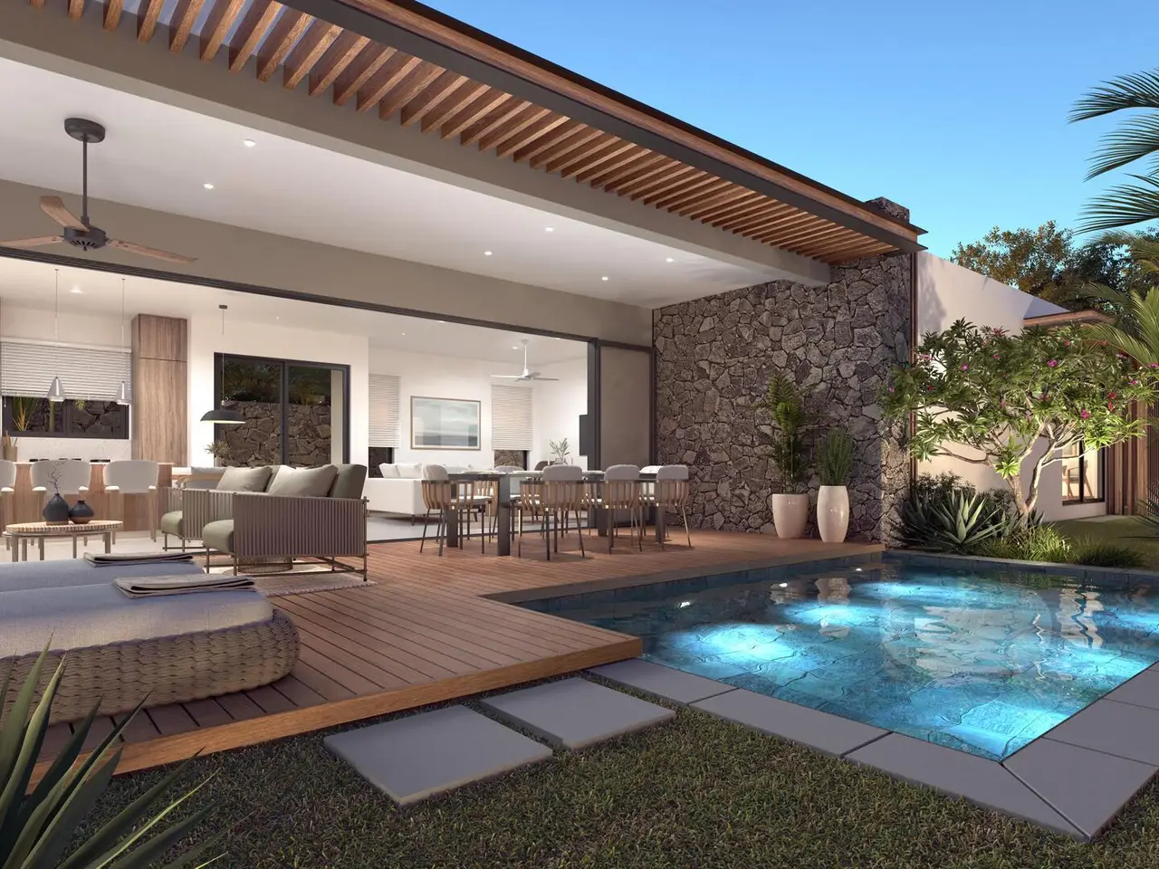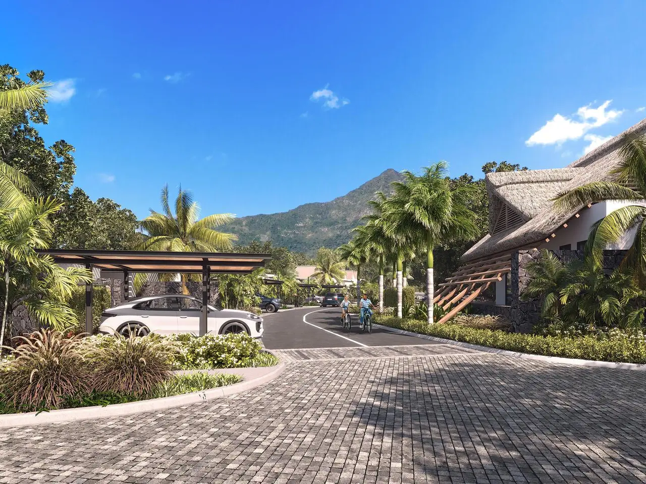 The three Baie Rose villas boast generous dimensions and a privileged westerly aspect, allowing you to take full advantage of the magnificent sunsets over Rivière Noire. These villas offer an incomparable living environment thanks to their meticulous architecture, which encourages relaxation and conviviality. Each villa has a spacious living room with lounge, dining room and open-plan kitchen leading directly onto a covered terrace and private swimming pool. The generously proportioned interior spaces include three en suite bedrooms offering comfort and serenity. The master suite, complete with dressing room and outdoor shower, is a haven of peace and privacy. The Baie Rose villas promise an exceptional quality of life in a natural setting of rare beauty. Interior living space: 141.3 m² Total built area: 269.2 m² Land: from 626 to 750 m² Residents have access to a private clubhouse with an air-conditioned gym, a swimming pool and a spacious deck for entertaining events, such as barbecues with friends. An ideal living environment all year round Palmaris enjoys optimum sunshine all year round, providing the ideal setting for leisure activities and a relaxed lifestyle. Owners also benefit from privileged access to a prestigious 18-hole golf course in the immediate vicinity. Palmaris, living naturally, quite simply.