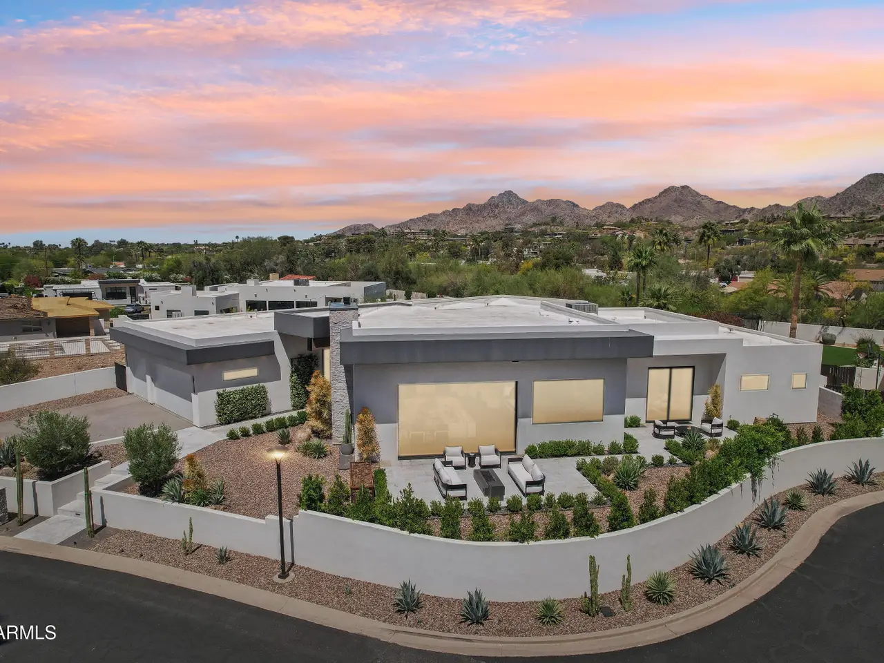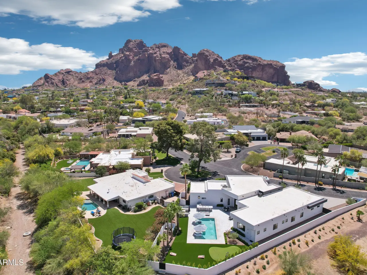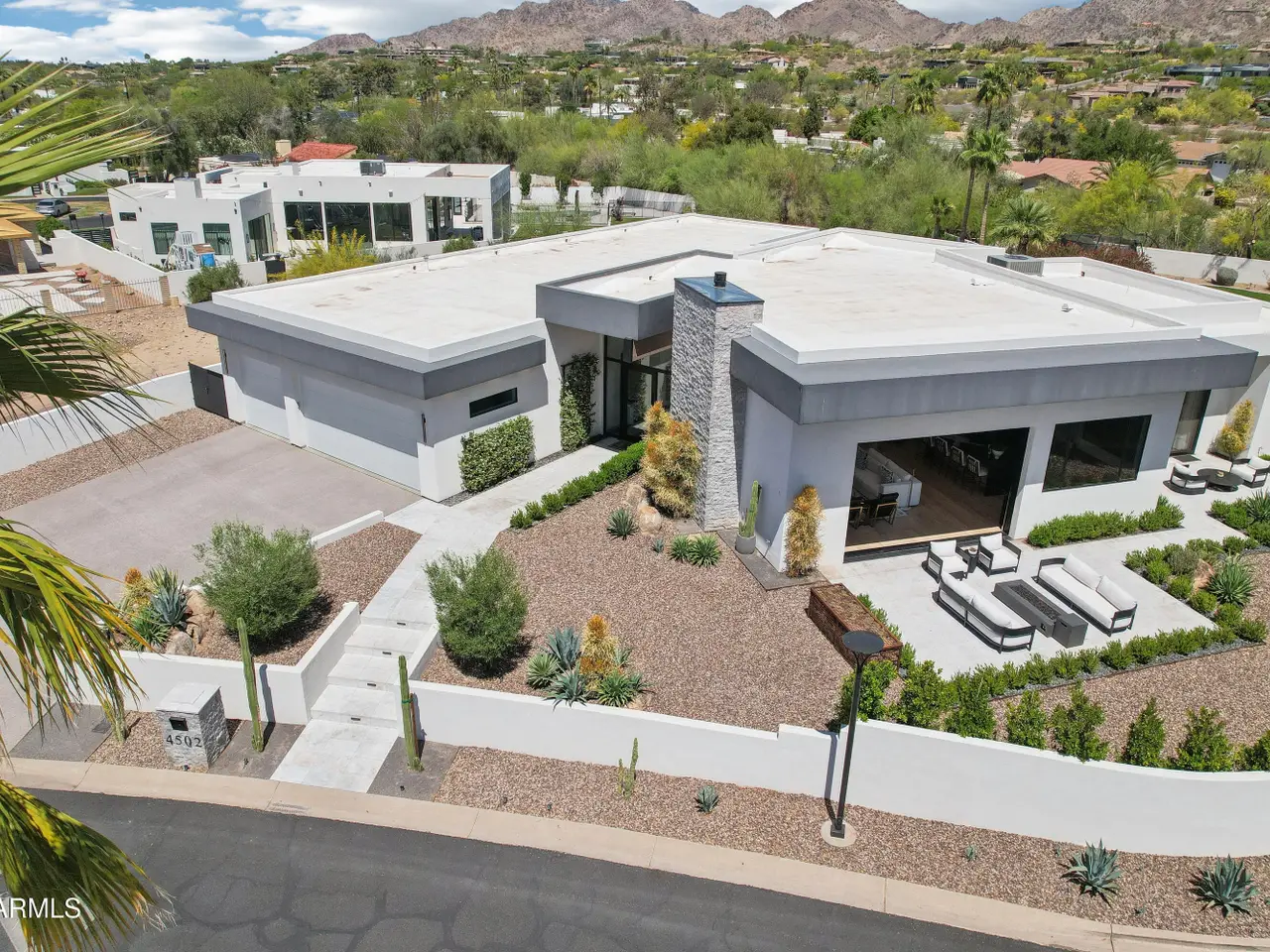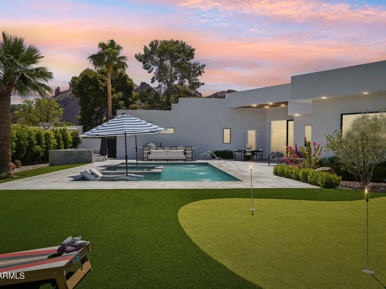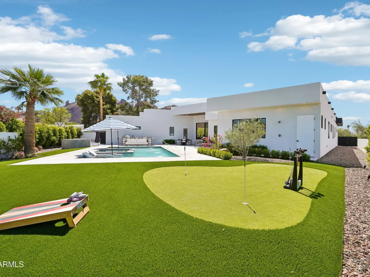 Built in 2023, this exquisite home is nothing short of stunning! Situated in the area of Paradise Valley/Arcadia at the base of Camelback and Mummy Mountains, this home offers 4357 square feet of luxurious yet easy living. Thoughtfully designed with 5 bedrooms and 5.5 bathrooms (includes an exterior pool bath and shower) The chef's kitchen is a true highlight, featuring dual dishwashers, double kitchen sinks, 48-inch dual fuel Monogram appliances, and a large butler's pantry with a second refrigerator, extra storage, and room for food preparation. Gorgeous finishes and features, further enhanced by homeowner, include natural wood and stone floors, designer lighting, surround sound throughout, Taj Mahal stone fireplace, synthetic grass and putting green, outdoor kitchen and speakers, steam shower in master bath, walk in closets, extra storage closets, storage racks in garage, Dry Cleaning Closet, and a secret safe room/closet. Also the home has many high-efficiency and smart home features, including foam insulation, north/south exposure, natural gas, saltwater pool system, Lutron lighting that automatically adjusts based on the sunset and sunrise, security features, thermostatic control, and a home automation system with a color touch screen for easy access and control. Experience views from every room in the house while enjoying the resort living lifestyle. This home is a must see, you are sure to fall in love!