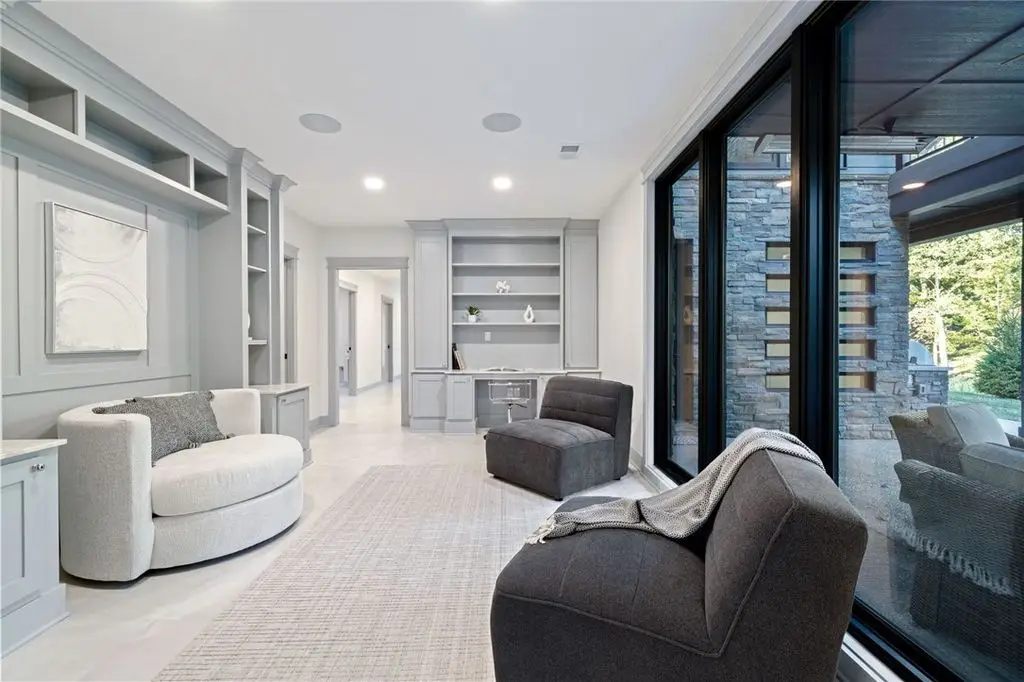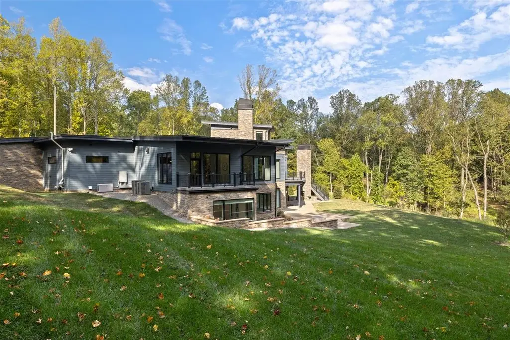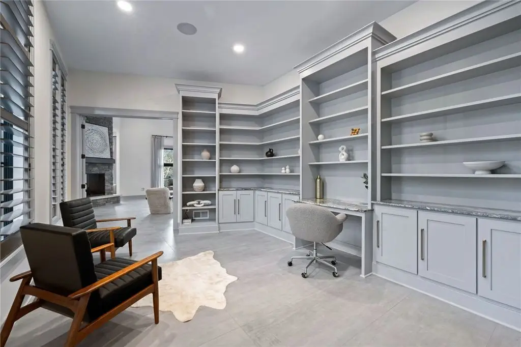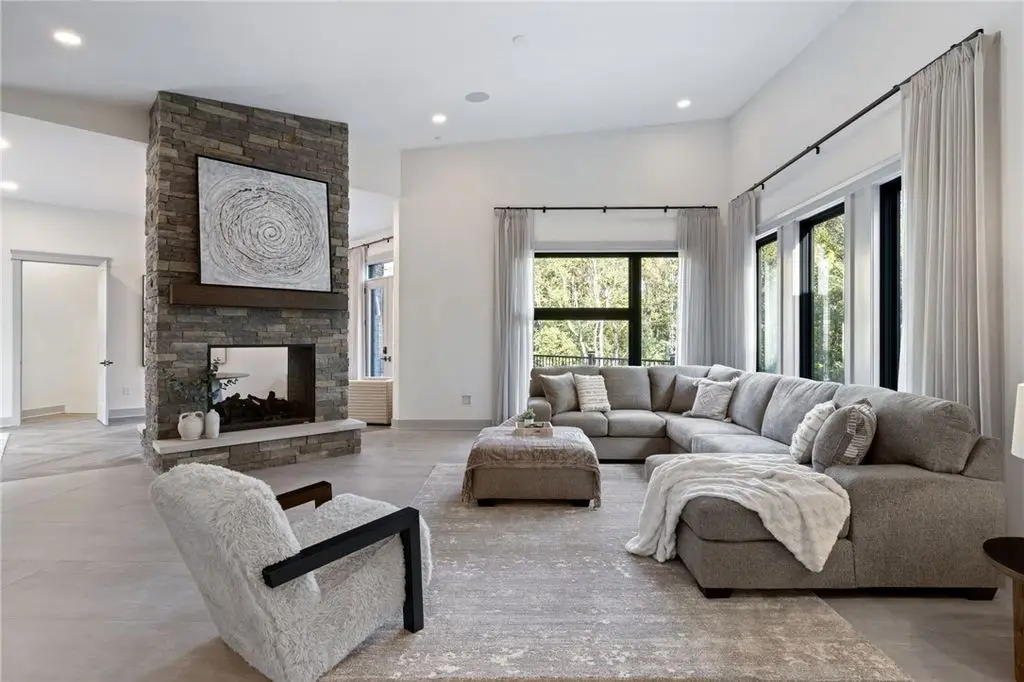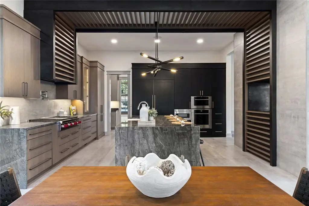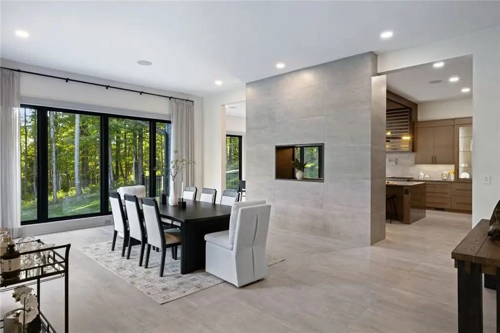 Welcome to a custom-designed home nestled in nature. This home offers privacy and stunning tree-lined views, all just minutes from modern conveniences. Step inside to a stone fireplace that connects the entry and living room. The oversized dining room is ideal for hosting, while the gourmet kitchen is a chef's dream - featuring Sub-Zero refrigerator, Wolf appliances and granite waterfall countertops. The main level also includes a prep kitchen. an office with custom built-ins and plantation shutters, a spacious media room, and owner's suite. Upstairs is a private ensuite bedroom. Smart home technology and radiant in-floor heating. The lower level is a second home, complete with its own gourmet kitchen, prep kitchen, living room, office, bedrooms, laundry, and full-size windows for lots of natural light. Sliding doors open to a covered patio with gas fireplace and kitchen. For the hobbyist or professional, a detached workshop includes a bathroom. Private gated drive and multiple garages.