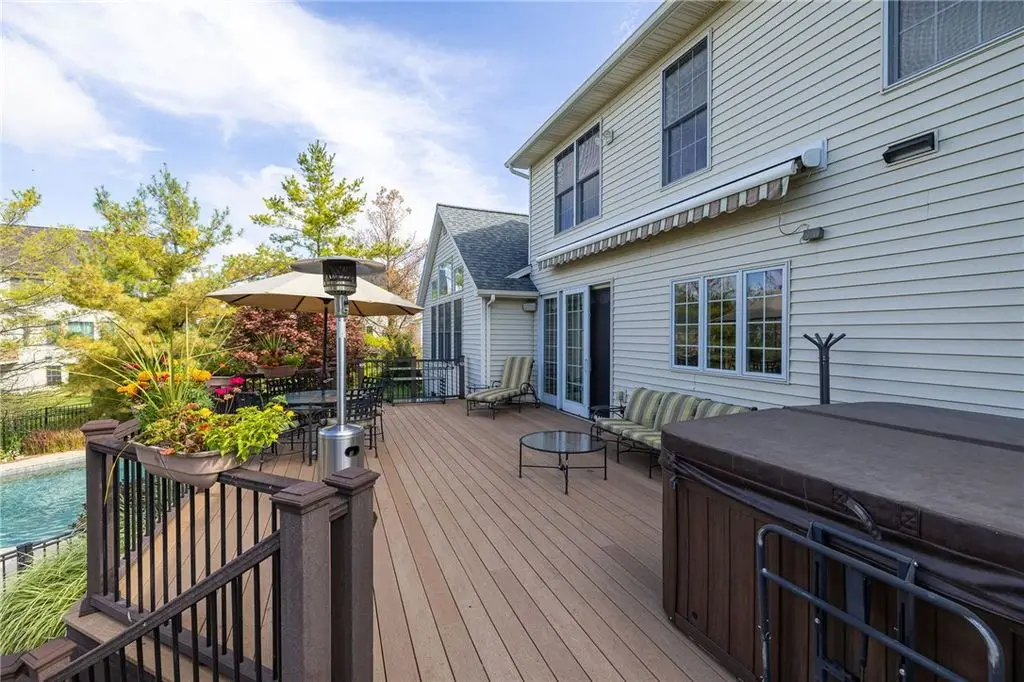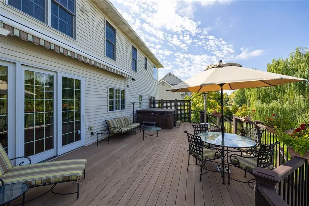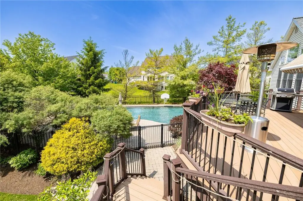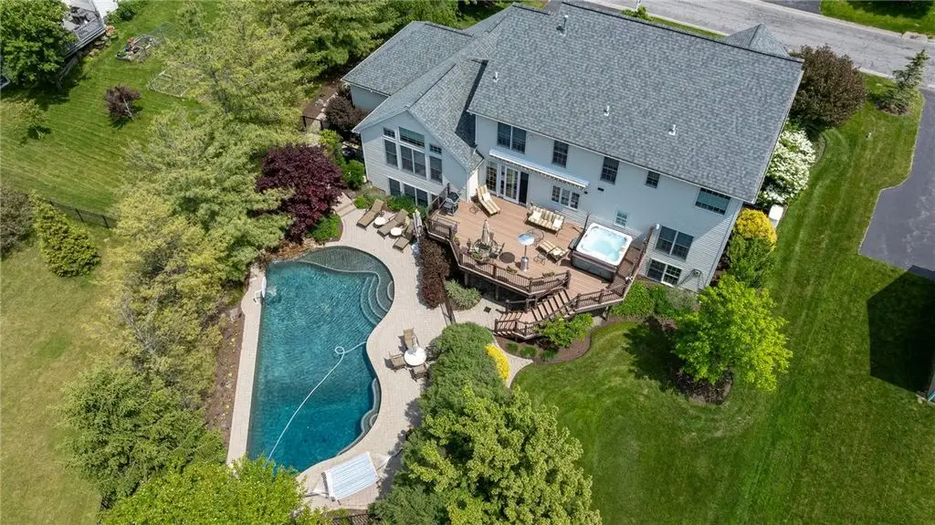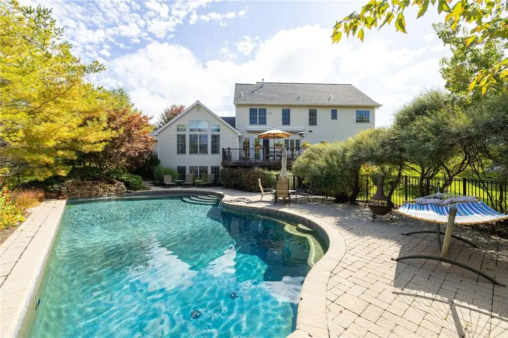 This custom Spall-built home strikes just the right balance between luxury lifestyle and traditional quality that's simply hard to find these days. It's impossible to miss the striking brick exterior and gardens bursting with a color and texture, but wait until you see the interior! This center-entrance colonial will sweep you off your feet, with gorgeous hardwoods, floor-to-ceiling windows and custom detailing throughout. The open layout makes for easy living and entertaining. A bright, updated kitchen opens to the expansive deck overlooking the built-in Gunite pool, gorgeous landscaping and view of the pond and natural surroundings. Take in dinner, drinks or lounge in the hot tub on the deck...or go pool side to take a dip, maybe nap in the hammock, or read a book while listening to the waterfall. Living here is literally like being on vacation in your own home. Extras include custom built-ins, storage galore, 3 car garage, 1st floor laundry, 2 gas fireplaces, huge finished lower level with a professionally finished fitness area, a huge rec room and the potential for an additional bedroom if an egress window were added. Built-in generator 2016. Whole-house Sonos system. Roof 2019. H20 2015. HVAC 2013.