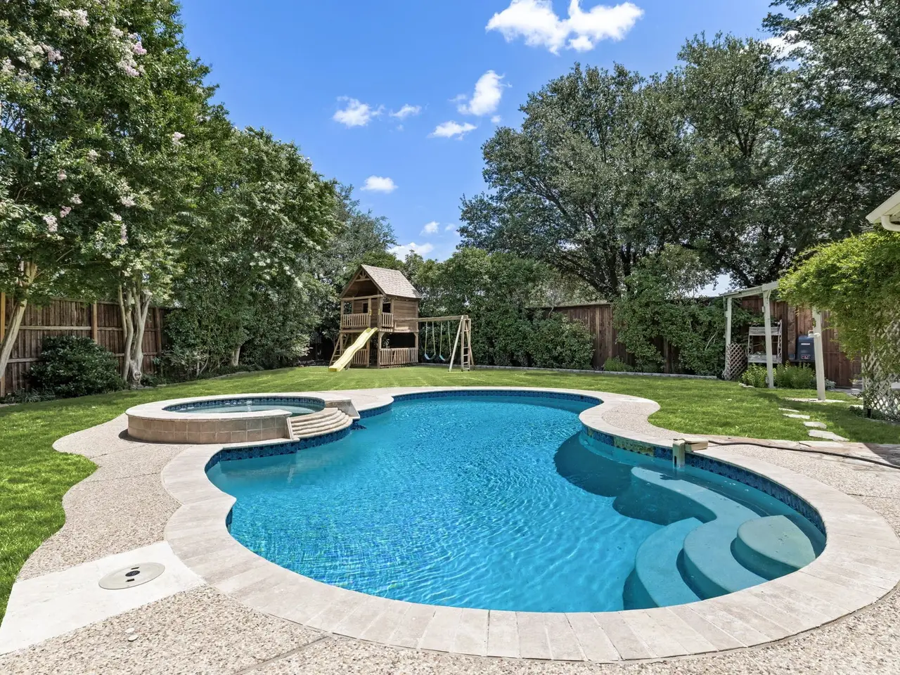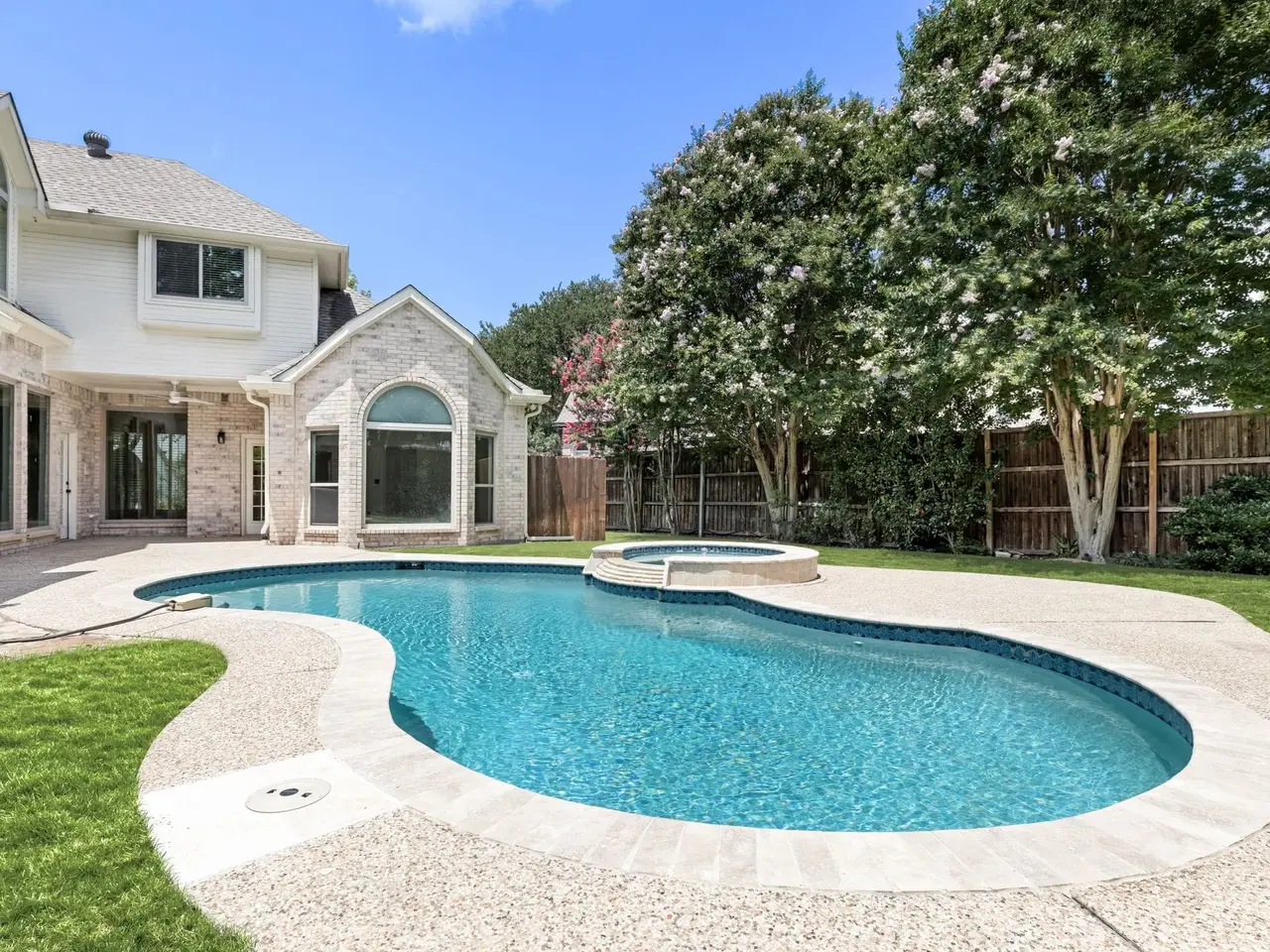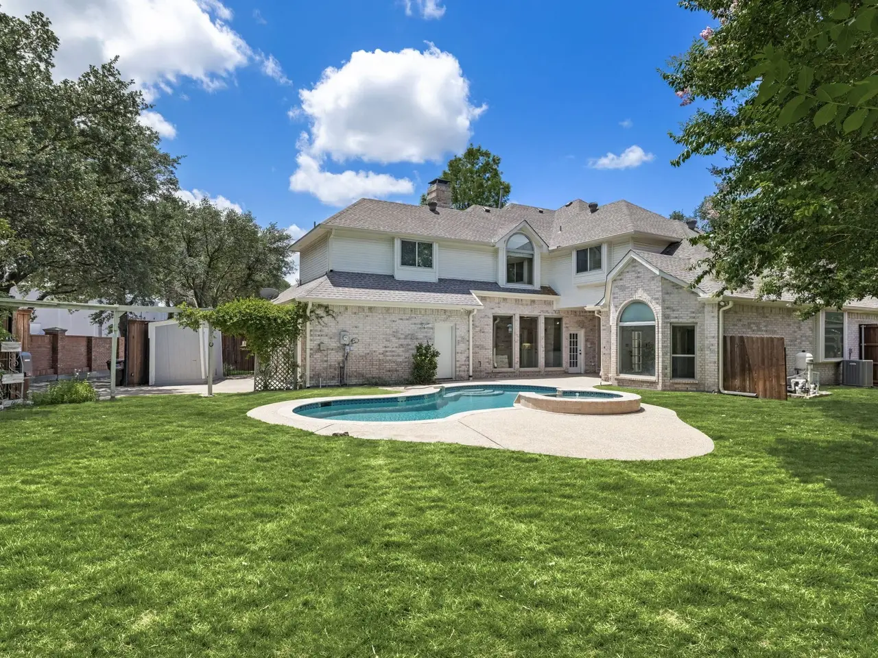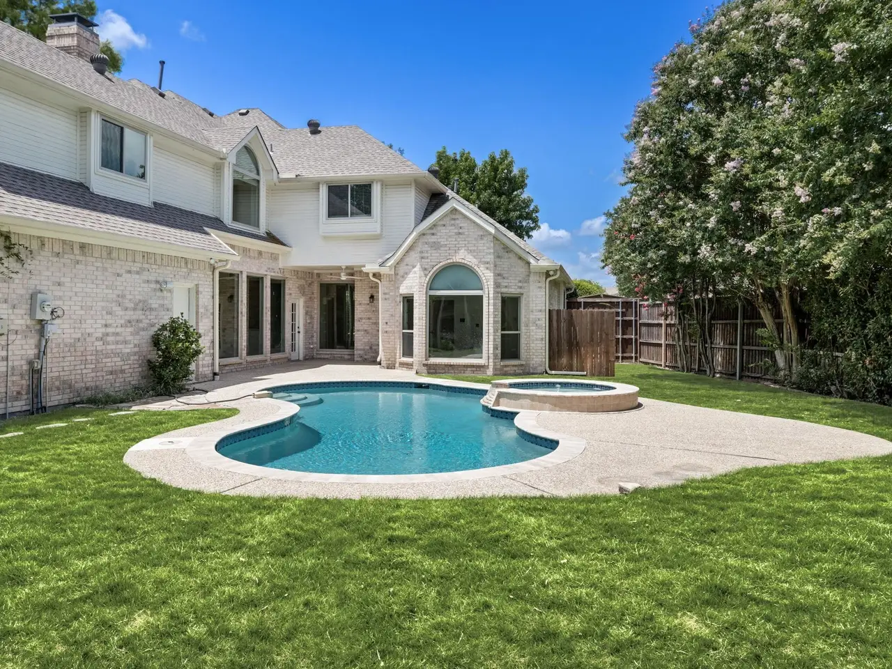 Need a 3-car garage? Need a BIG BACKYARD with a POOL and SPA? Welcome to 5001 Hudson Drive: an elegant, beautifully maintained home tucked into a quiet cul-de-sac in the heart of West Plano. This 5-bedroom, 4.5-bath property offers a versatile and expansive floor plan ideal for both everyday living and upscale entertaining. The primary suite is conveniently located on the main floor, featuring serene views of the backyard and direct access to the pool and spa. A thoughtfully designed pool-bath or powder-room provides easy access for guests. The main level also includes two generous living areas, a dedicated study, and a formal dining room, creating a seamless flow throughout the home. The kitchen opens to the den for an airy, connected feel and showcases hardwood floors, ample cabinetry, and new windows that fill the space with natural light. Upstairs, you'll find additional bedrooms, including a flexible nanny or in-law suite, perfect for multi-generational living. Outdoors, enjoy a large backyard with a sparkling pool, spa, a charming play fort and a spacious side yard complete with a Monarch butterfly garden. The three-car garage is accessed via dual electric gates, offering security and extra play space. Located near Preston Road, with unbeatable access to shopping, dining, and grocery stores, and minutes from PGBT and Dallas North Tollway, this home is a rare combination of comfort, space, and location. Close to Prince of Peace School, Church. George Bush and Dallas North Tollways just down the street. Windows are newer. Great walkability with grocery stores and restaurants on every corner.