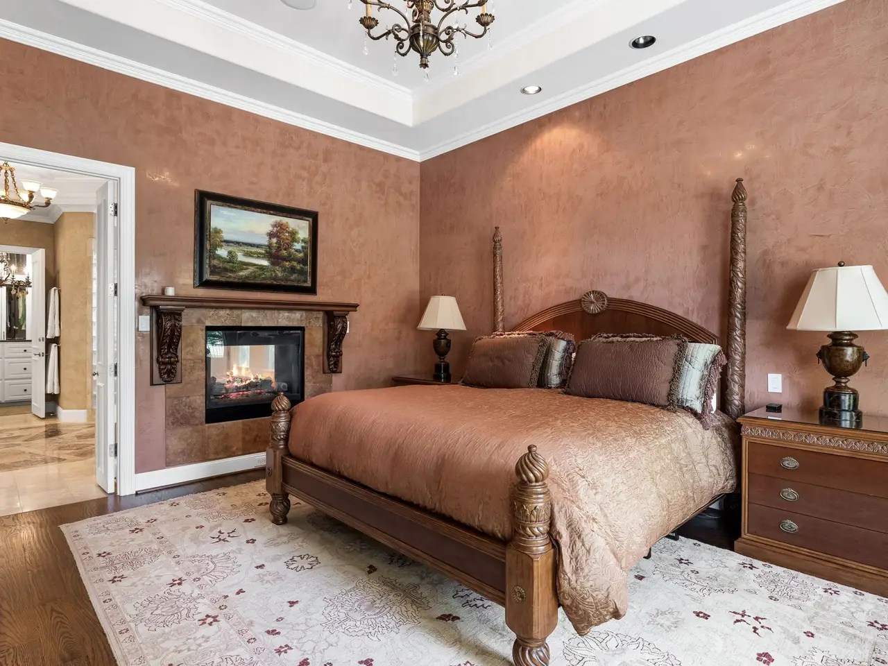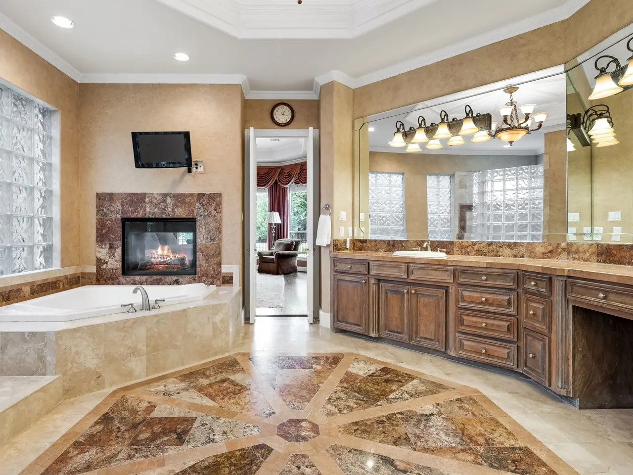 Spa-like primary bath with see-through fireplace