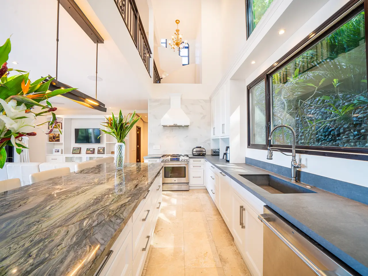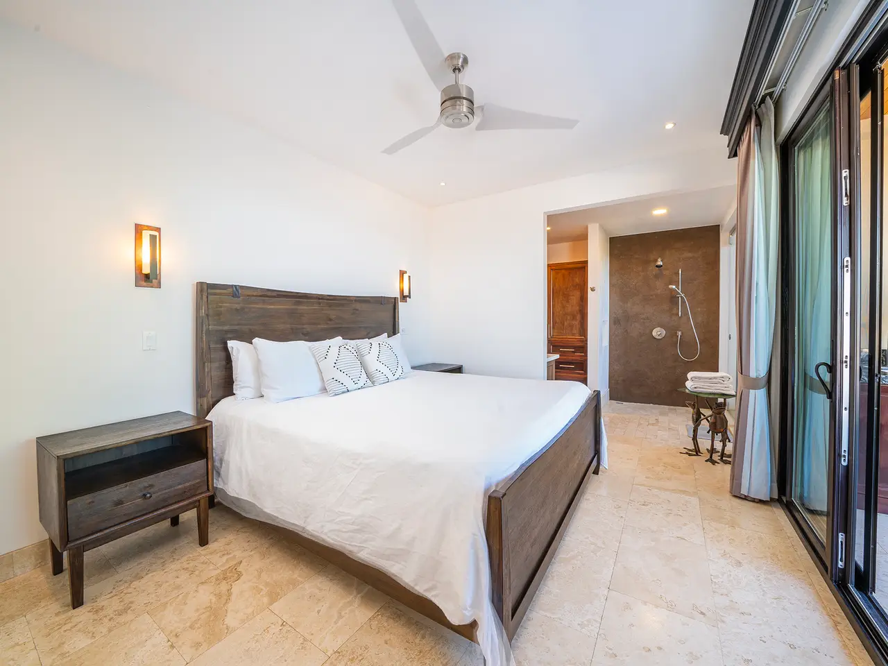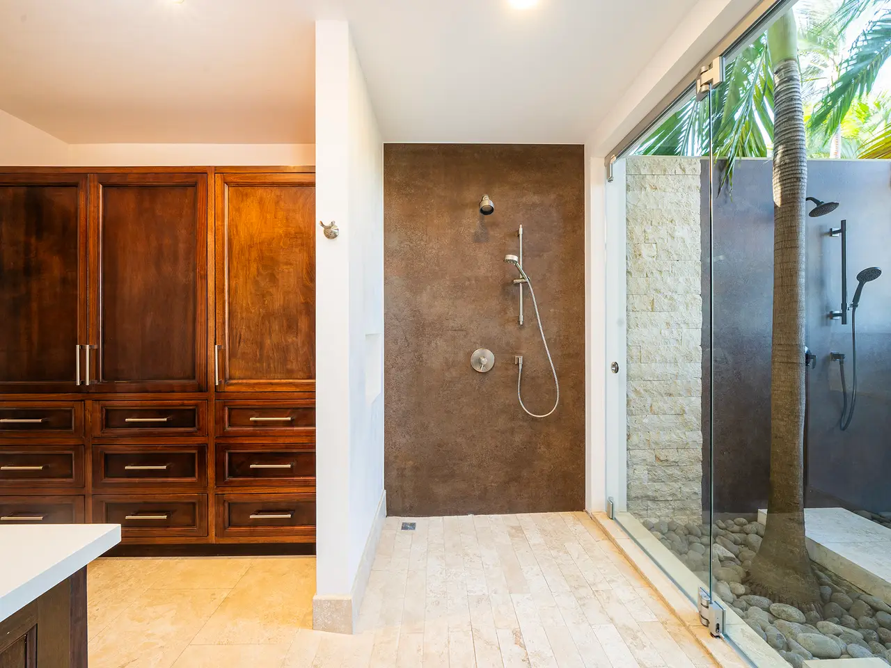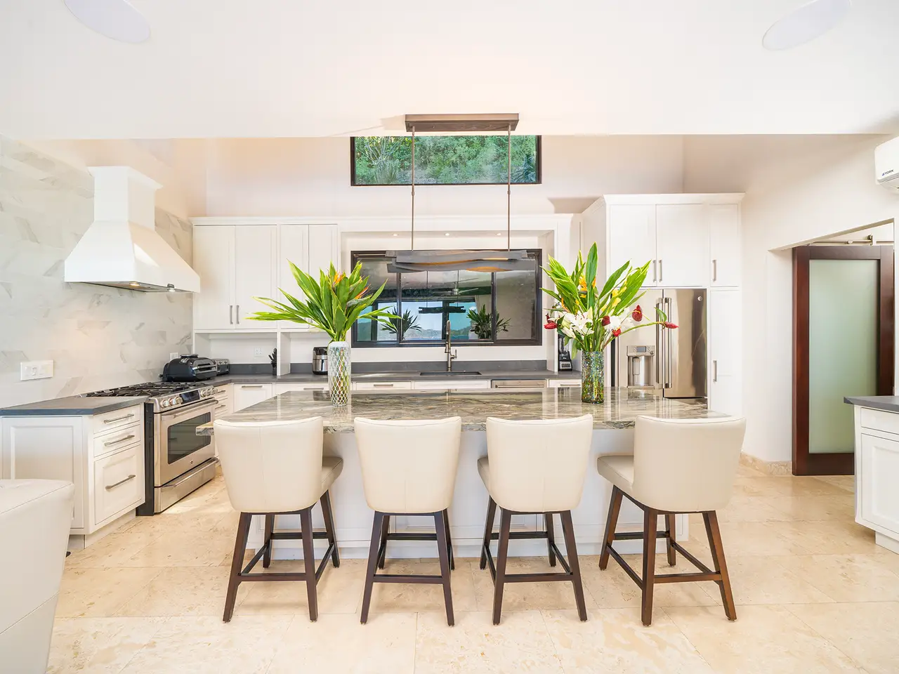 Welcome to Casa Todo Bien and Guest House, a masterpiece of luxury living nestled into the prestigious Southridge mountainside of Playa Flamingo. This opulent estate boasts an expansive main home with 4 bedrooms, and 4.5 baths. The property also includes a luxury guest house, featuring 1 bedroom and 1 bath, a full kitchen, a private plunge pool, and a floatation spa suite with an additional 1.5 baths. With a total construction spanning 7500 sq ft, this residence is a testament to elegance and sophistication. This home has some of the best views in the area and is so close to the beach, you will hear the crashing surf. Best of all, it’s just a short, ten-minute walk down to the beach! The views from the property include the beautiful white sands of Playa Flamingo, the brand new Flamingo Marina, the bay of Potrero all the way north to Las Catalinas, and even the mountain ranges of Nicaragua. As you enter the main house, Venetian plaster walls, travertine floors, a sculptural curved stairway, and a custom-made Italian hand-blown glass chandelier set the tone for the grandeur that awaits. Hand-forged lighting fixtures, imported from Vermont, illuminate the space, creating a timeless ambiance throughout the home. Oversized sliders allow an expansive view of the zero-edge, saltwater lap pool with a Jacuzzi and LED lighting. An outdoor shower is conveniently located nearby the pool. The pool deck area also features custom cabinetry housing a five-burner Cal-Flame barbeque grill. A granite countertop and sink round out the outdoor kitchen. The main house is spread over three levels. The first level includes an open living and kitchen area. The ceiling dramatically soars two stories over the cooking space, with a large, arched window that fills the living environment with natural light. The gourmet kitchen is equipped with GE’s Café line of stainless-steel appliances and includes a five-burner stove with two full ovens. The beverage center resides along a side wall of the kitchen, providing easy access to a wet bar with a mini-fridge and kegerator. A custom pantry, laundry room with dog wash, powder room, and two-story “loftice” (office with loft) are also included on the main level. Custom woodwork in the office includes a desk, cabinetry, window seat, and bookcases. The office loft is accessible by ladder – or a hidden entrance on the second floor. A dumbwaiter just off the kitchen provides a convenient way to deliver drinks, meals, or luggage to the second and third floors. Audio zones in the kitchen, pool terrace, office, and third-floor suite add the perfect touch that makes this home an amazing setting for entertaining. All four of the home’s bedrooms are designed as primary suites and can comfortably accommodate king-size beds. Each suite has ocean views from the bedroom AND the bathroom. The main level includes the Garden Suite, with a bidet and two showers – one of which is outdoors, flanked by palm trees, with a view overlooking the bay of Potrero, with its fishing boats and catamarans. The king bed faces the view of the pool, ocean, mountains, and marina. The second floor includes two more primary bedrooms with ensuites. These bedrooms share a spacious balcony to enjoy the incredible ocean and mountain views that only get better with each floor. The Marble Suite bath highlights Carara marble on the walls and vanity. Step outside to the elegant soaking tub, and sip a glass of wine while enjoying the most incredible sunset view in all of Flamingo. An additional second-floor suite is currently used as an art studio. A large mirror on the bedroom wall conceals a surprise – a secret door to the loft in the office. The loft area includes tigerwood floors, a television, and one of the home’s four audio zones. It’s a great spot to escape and relax. This suite also features the most spacious bathroom in the house, with a huge shower and window with an ocean view. The third-floor Penthouse Suite is the largest of the home’s four bedrooms. The views are expansive and breathtaking. The bathroom includes a shower system with shower head, wand, and wall jets – and again, those ocean views! With a stunning granite accent wall, and a huge full-wall mirror, this bathroom is an extravagant, spa-like retreat. There are two outdoor spaces in the suite: The balcony includes a built-in bench and a custom beverage center with mini-fridge. An additional spacious deck is the perfect place to practice yoga, enjoy sunset drinks, or spend a romantic evening stargazing. Among the many thoughtful touches in this home are a professionally installed alarm system, six outdoor security cameras, high-speed fiber optic internet (up to 200 Mbps), and wifi boosters. A whole-house Generac generator engages automatically in the event of power outages. The Guest House is a fully independent haven with its own pool, ocean views, full kitchen with dishwasher, single-stall garage, and private laundry room on the first floor with a large-capacity washer and dryer. This home is built with the same level of luxury and quality as the main house. Natural stone highlights of granite, slate, and travertine are found throughout the home. The private, infinity-edge plunge pool includes both a spill-through waterfall and a weeping wall, which creates the soothing ambiance of a gentle rainfall. A beautiful laurel wood ceiling and a relaxing soaking tub with a pool view make the bedroom suite feel extraordinarily romantic. The guest house has plenty of space to host extended family, or provide a separate and private space for rental income. Another exclusive feature of this property is the flotation spa, located on the first level of the guest house. Flotation therapy is a deeply relaxing experience. Floating in complete darkness and silence, buoyed by 1,200 pounds of dissolved Epsom salt, provides a super-infusion of magnesium that is absorbed transdermally. This vital mineral helps to improve muscle function, redu