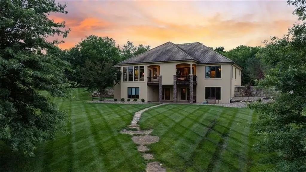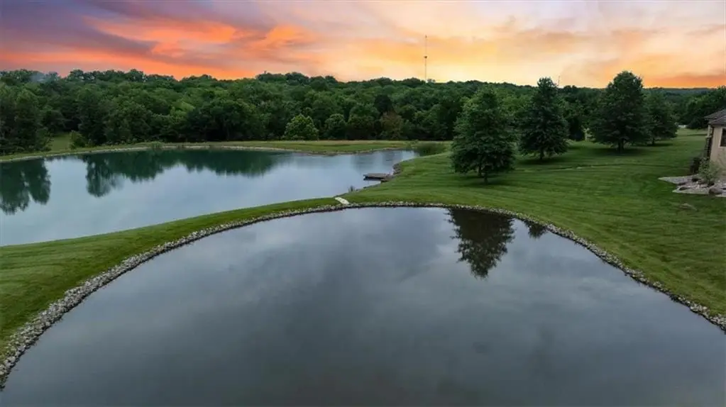 Tucked away in a serene, park-like setting, this stunning custom-built estate offers a rare blend of privacy, luxury, and breathtaking natural beauty. Perfectly positioned on just over 10 acres, the home overlooks picturesque, fully stocked ponds surrounded by mature trees, meticulously maintained grounds, and a backdrop of nature. A covered deck with an outdoor fireplace provides the perfect place to unwind while enjoying the peaceful views, and expansive windows throughout the home bring the beauty of the outdoors in. Inside, you'll find high-end finishes, an open-concept layout ideal for entertaining, and a walkout lower level that leads to a private patio and dock. The thoughtfully designed layout allows plenty of space to add a pool, garden, or additional outdoor features to truly make this your own. A detached 36x48 outbuilding provides the perfect space for a workshop, storage, or hobby area. Whether you're sipping coffee on the deck, casting a line from the dock, or enjoying an evening under the stars, this property is designed for both relaxation and entertainment. With convenient access to Raymore, Lees Summit, and Kansas City, it offers the best of both worlds - secluded countryside living with city amenities just minutes away. This one-of-a-kind property is a rare opportunity - schedule your private tour today!