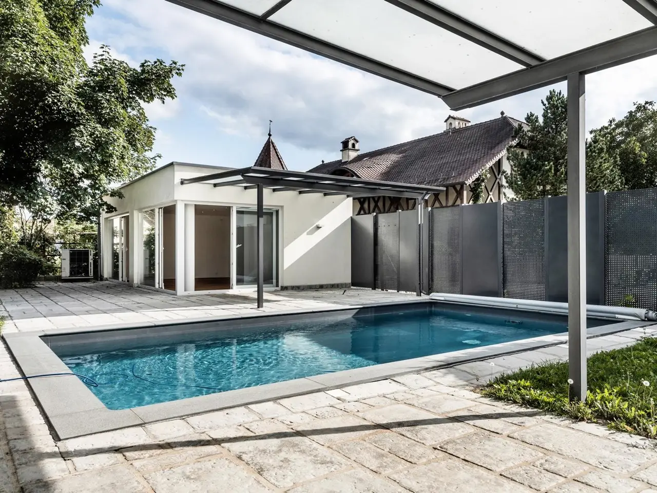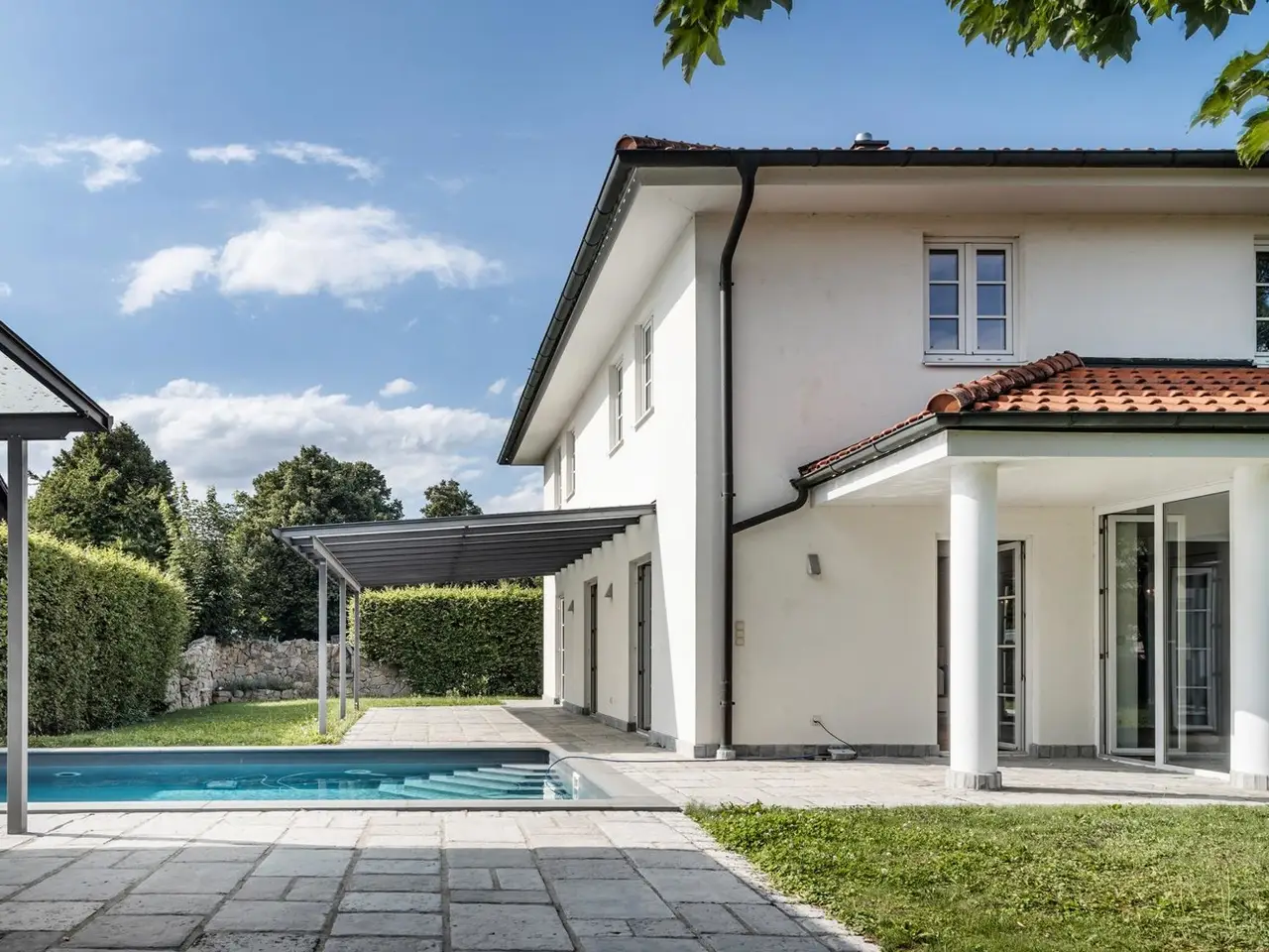 Welcome to a property that combines the lifestyle of Tuscany with the demands of modern living. This prestigious, detached villa with approx. 260 m² of living space offers you a stylish retreat - completely ready to move into and available immediately. Here you can expect not only well thought-out architecture, but also numerous amenities such as a heated outdoor pool, a light-flooded fitness pavilion, a spacious double garage, high-quality materials and a garden to relax and feel good. Even at first glance, the villa impresses with its harmonious, Tuscan-inspired design: Two full storeys under an elegant tent roof lend the house presence and timeless beauty. The classic façade design is complemented by natural stone terraces and a spacious driveway - here you can reside in style. The heart of the property is undoubtedly the open-plan living, cooking and dining area as the communicative center of the house. More than 80 m² of pure space, flooded with natural light thanks to numerous floor-to-ceiling windows. An ornate brick-built stove provides cozy warmth, which extends through the open gallery to the upper floor. The stylish bay window in the dining room opens up a picturesque view of the garden - a special treat at any time of year. From here you have direct access to the spacious south and west-facing terraces. The south-facing terrace in particular, with its modern glass and steel roofing, invites you to enjoy unforgettable summer evenings - outdoor living at the highest level. The kitchen is open-plan yet discreetly separated - perfect for anyone who enjoys entertaining guests or cooking together with the family. Every amateur chef's heart beats faster here: high-quality appliances, gas hob, Teppan Yaki and a well thought-out storage space concept plus pantry leave nothing to be desired. A practical utility room with direct access to the cellar, a guest WC and a stylish vestibule with checkroom round off the first floor in functional terms. The upper floor impresses with its full room height and offers a well thought-out room program: - Master bedroom with walk-in dressing room and direct access to the luxurious master bathroom - Free-standing bath, floor-level shower, two washbasins and separate WC - Two spacious, bright children's or guest rooms - Further bathroom with shower - Study with custom-made fitted wardrobes - perfect for a home office An absolute highlight is the fitness pavilion built in 2010, which can just as easily be used as an office, master bedroom or guest area: With two glazed sides and generous sliding doors, this creates a room that can be used all year round with fantastic views of the pool, garden and house. The adjoining L-shaped terrace is covered and, with water and electricity connections, provides the perfect setting for a hot tub or outdoor kitchen. The 8 x 4 m heated pool blends harmoniously into the garden design - a place for relaxation, sport and joie de vivre. The ensemble is framed by high-quality natural stone terraces that offer a variety of uses - whether sun loungers, lounging or dining in the open air. Perfectly thought out - inside and out: - Completely level plot with wide driveway - Double garage & additional outdoor parking spaces - Professionally landscaped garden with automatic irrigation & own well - Two covered terrace areas for comfort regardless of the weather Another advantage that you can use in the foreseeable future: Currently, traffic from the nearby but invisible B12 is occasionally perceptible in the garden area - a factor that will improve considerably in the near future, however: With the ongoing expansion of the A94 highway further away, which directly connects Munich, Passau and Austria, this route will take over the majority of through traffic in the future. For you, this means: a value-enhancing location development thanks to fast connections, especially to Munich, and significantly more peace and quiet in your own garden in just one to two years' time. Conclusion: A villa for people with a sense of aesthetics and quality of life. This exceptional property is perfect for anyone who wants to combine Mediterranean flair, functional design and exclusive furnishings. Whether as a stylish family home, a prestigious domicile for couples or as a retreat with vacation character - this villa is far more than just a house: it is a lifestyle.