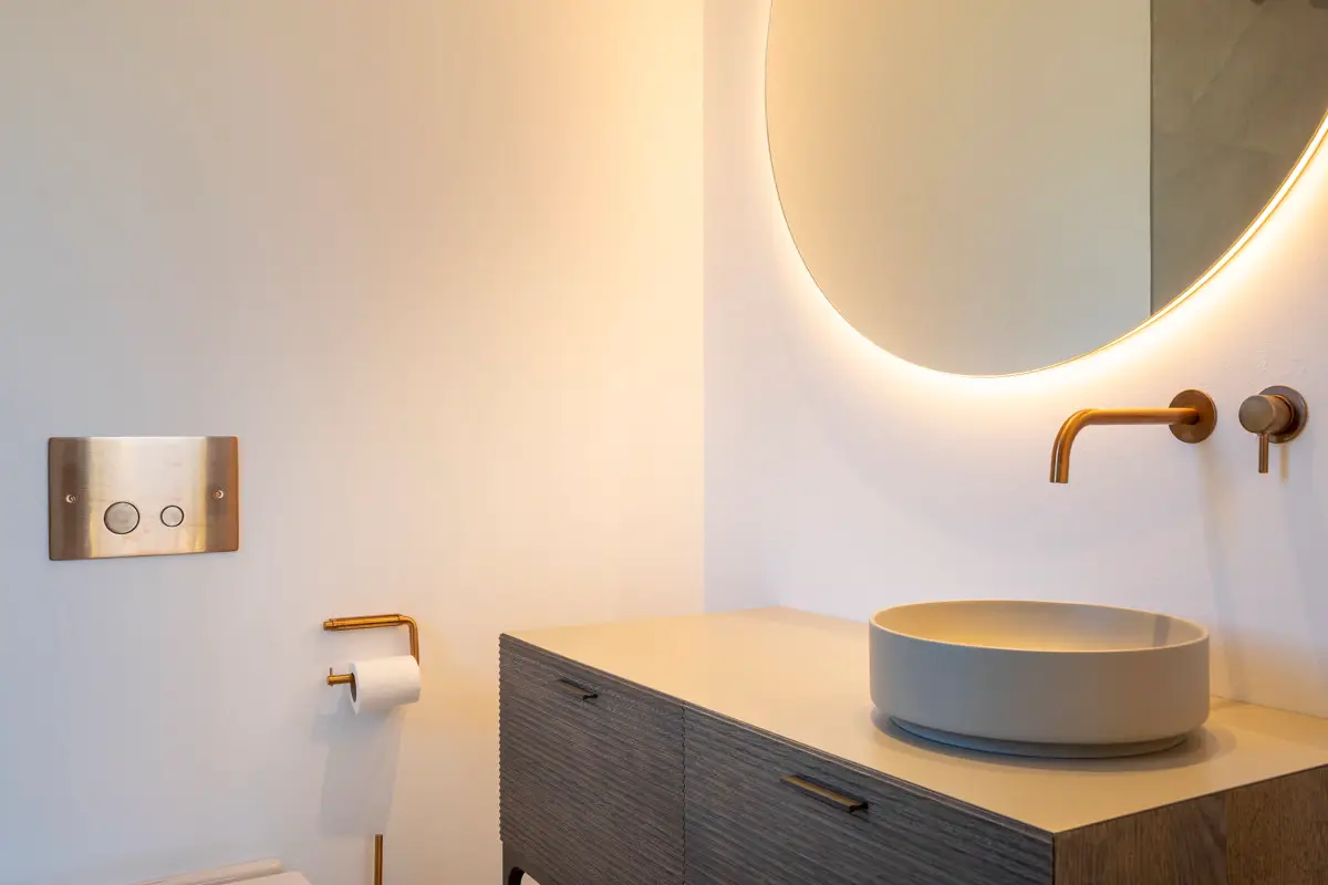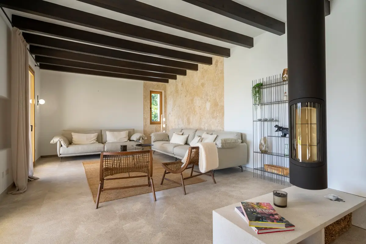 Welcome to "Ca'n Marina" - a luxurious house on a stunning plot near the historic town of Pollensa, in the north of Mallorca. The property extends over a living space of approximately 405 m² and is located on a spacious plot of approximately 14,121 m². With five rooms, four bedrooms and five bathrooms, this property offers enough space for a large family or guests. The construction of the house meets the highest standards in terms of design and technical equipment. The main focus was to perfectly integrate the property into its natural surroundings and offer panoramic views over the surrounding landscape. Inside the house you will find a spacious and well thought out layout. The high entrance hall leads into a bright living room with an adjustable fireplace that separates the dining and living areas. The tailor-made kitchen is an absolute highlight and has high-quality fittings. An en suite bedroom with access to a private terrace, a utility room and a cloakroom complete the ground floor. The first floor houses two further bedrooms with bathrooms as well as a magnificent master suite with dressing area and sauna. From here you have a wonderful view of the surrounding landscape. Two of the bedrooms have direct access to the large balcony which overlooks the garden and pool area. A fully equipped basement with natural stone floors provides additional space for various uses such as a home theater, gym or wine cellar. An outbuilding on the property serves perfectly as a storage or multifunctional room. The impressive property is insulated and has underfloor heating on all three floors, integrated air conditioning and a smart ventilation system. The outdoor area is a true oasis of relaxation. With a swimming pool, several open and covered terraces and a variety of Mediterranean plants, the property invites you to spend time outdoors. The location of the finca is ideal. It is located just half an hour from the city of Palma and the airport, but far enough away to enjoy the peace and privacy of rural life in Mallorca. If you would like further information about this property, please contact us and we will send you our detailed property brochure.