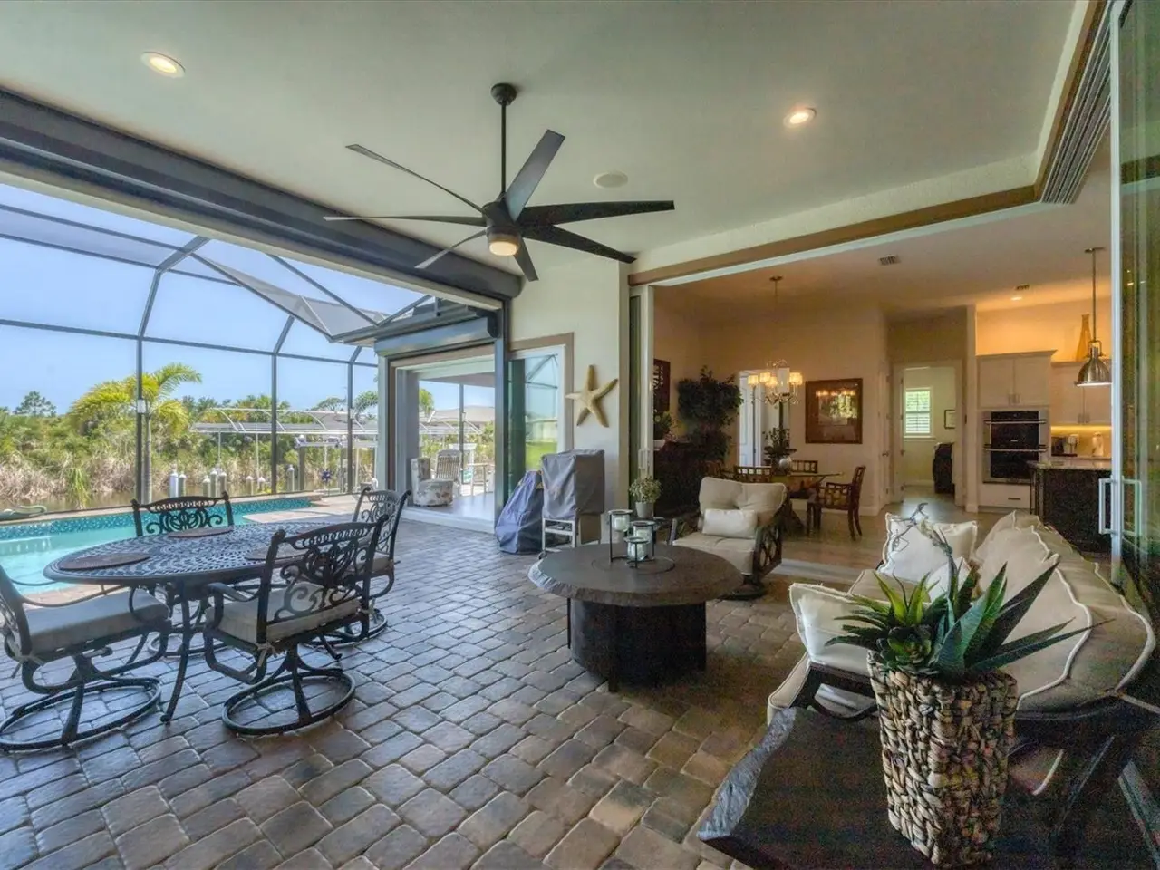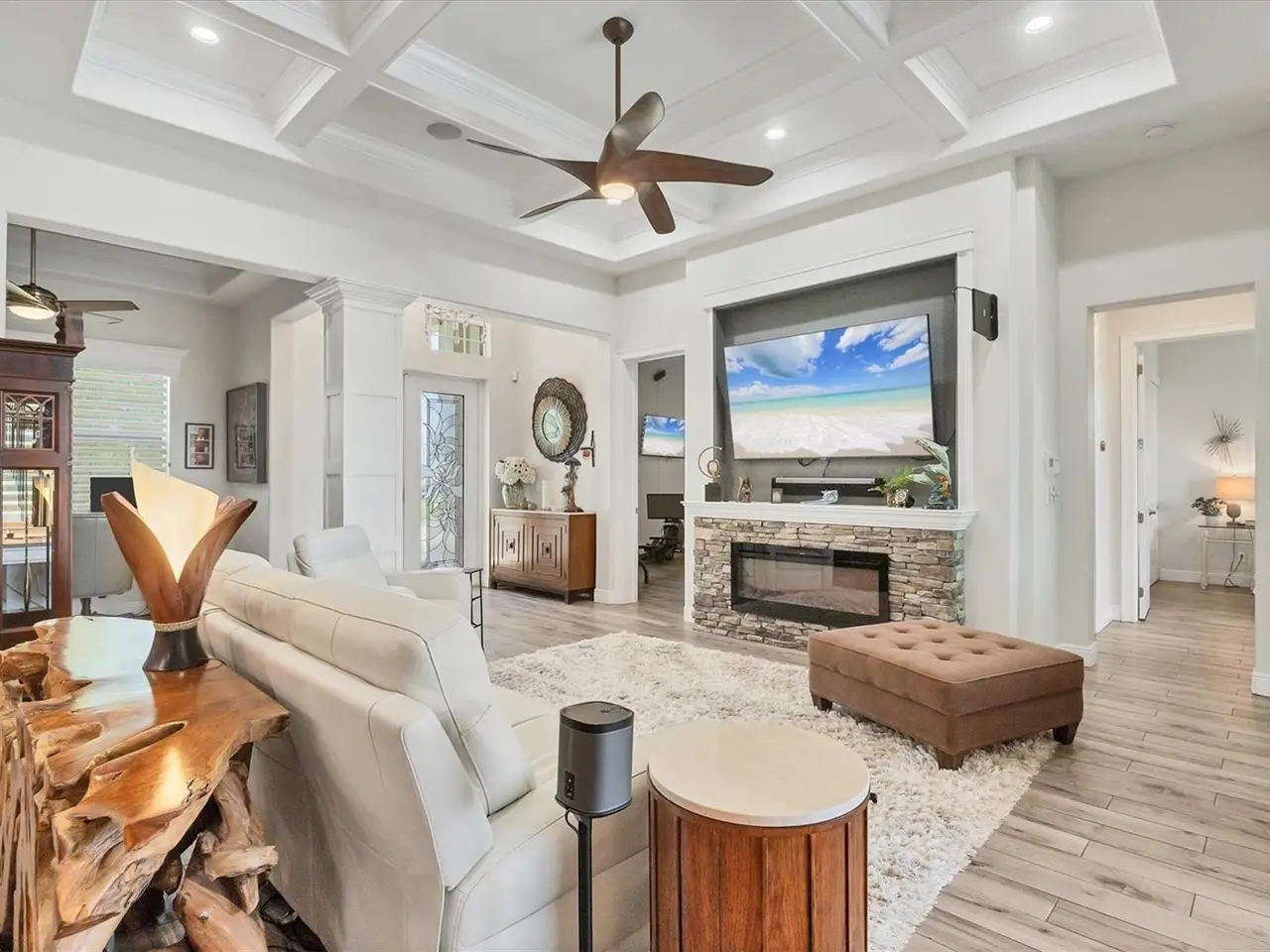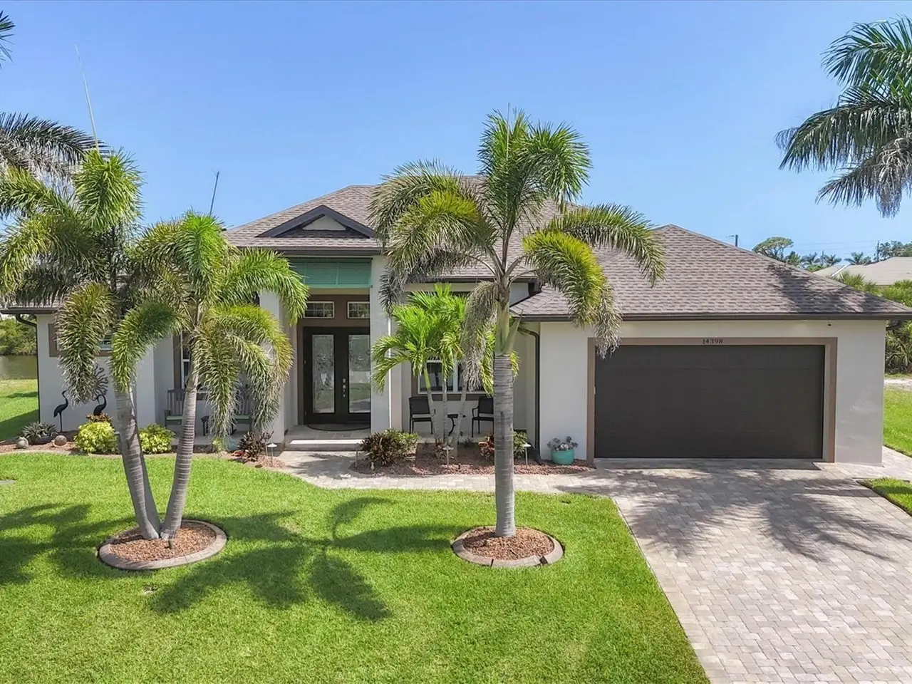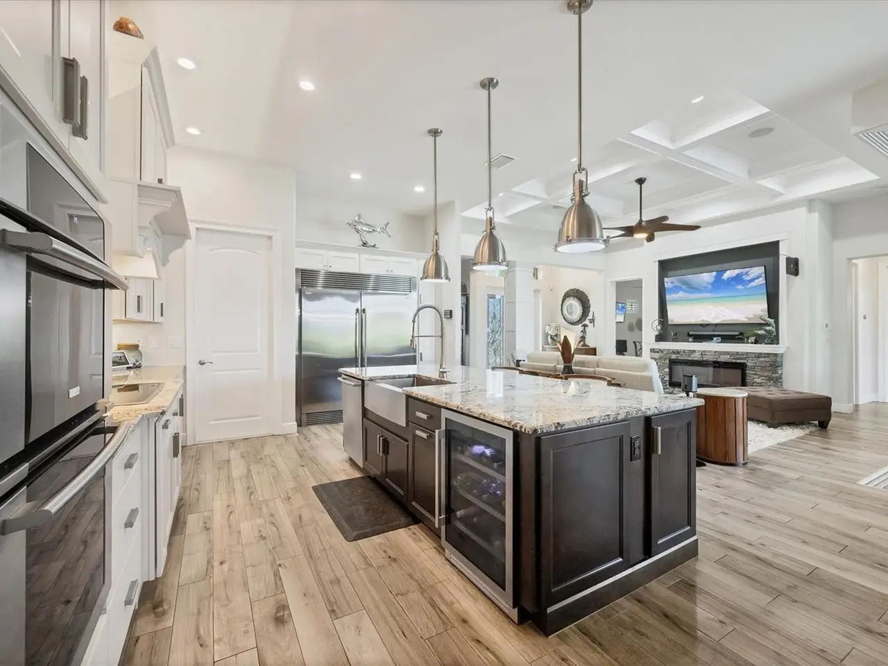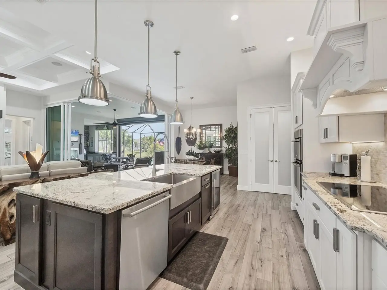 Tucked in a serene Florida waterfront community, this elegant 3-bedroom, 2-bath custom home is the perfect blend of luxury, comfort, and smart design. From the moment you arrive, it’s clear that every inch of this property has been thoughtfully crafted—from the paver driveway and travertine entrance to the gorgeous etched glass double doors that make a striking first impression. Inside, you’re greeted by rich wood-look tile flooring, custom tray ceilings, and a welcoming open layout that flows effortlessly from room to room. The living space is bright and open, with oversized sliders framing stunning water views that never get old. Whether you’re hosting a holiday party or simply relaxing by the electric fireplace with family, this home makes it easy to live beautifully. And the kitchen? It’s a chef’s dream. With a massive 9-foot quartz island, an Electrolux 5-burner induction cooktop, wall ovens, an oversized refrigerator/freezer, and high-end fixtures, cooking becomes a joy — not a chore. You’ll find yourself gathering here often, whether for morning coffee or sunset hors d'oeuvres. The primary suite is a peaceful retreat. Wake up to water views and step directly out to the lanai. The spa-style en-suite bathroom features an oversized walk-through shower, dual vanities, and a 13x8 walk-in closet so spacious it could be its own room. Across the home, two guest bedrooms ensure privacy and comfort for family or visitors. Step out onto the lanai and your private resort awaits. A heated saltwater pool with a soothing water feature invites you in for a dip. Entertain at the fully equipped summer kitchen with a Webber Summit grill and expansive bar space—perfect for laid-back evenings with friends. New pool screens installed in 2023 keep everything fresh and beautiful. And when a storm rolls in? Just press a button—automatic hurricane shutters protect everything, no need to move a single chair. As the sun sets, stroll down the lighted captain’s walk to your private 16-foot composite dock, complete with water and electric hookups and a walk-around 10,000 lb. boat lift—making every boat day easy and effortless. This home is not just beautiful, it’s built for peace of mind. From impact-resistant glass and electric shutters to Icynene insulation, Nest smart home features, and a newly painted exterior (2023), it’s as smart and secure as it is stunning. There are too many extras to list—but one walk through will show you: this is more than a home, it’s a lifestyle. Schedule your private tour today and experience the very best in Florida luxury living.