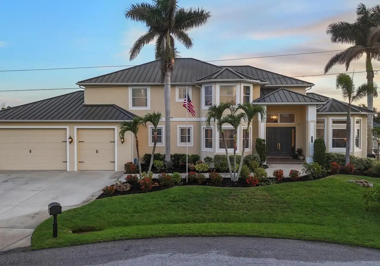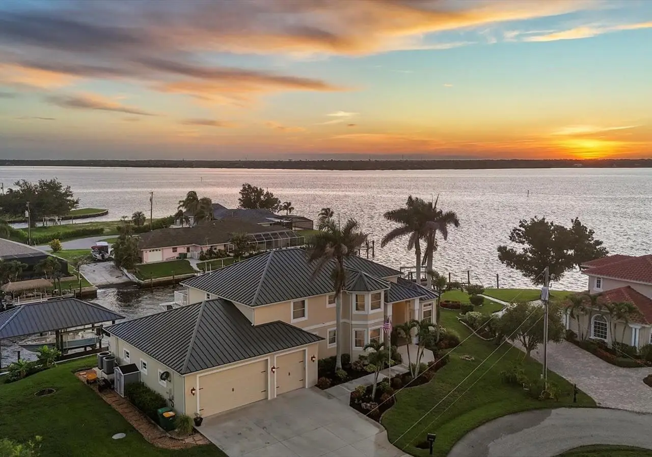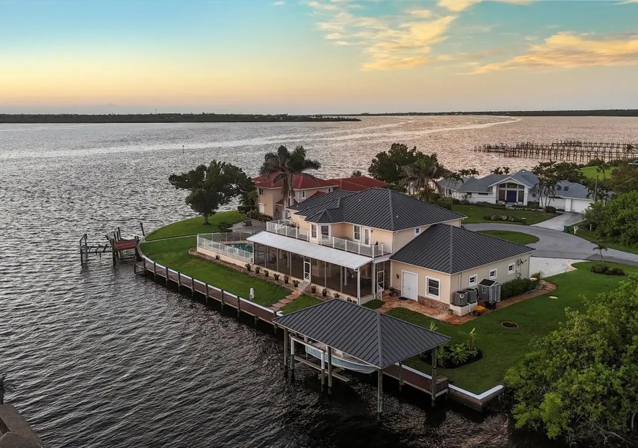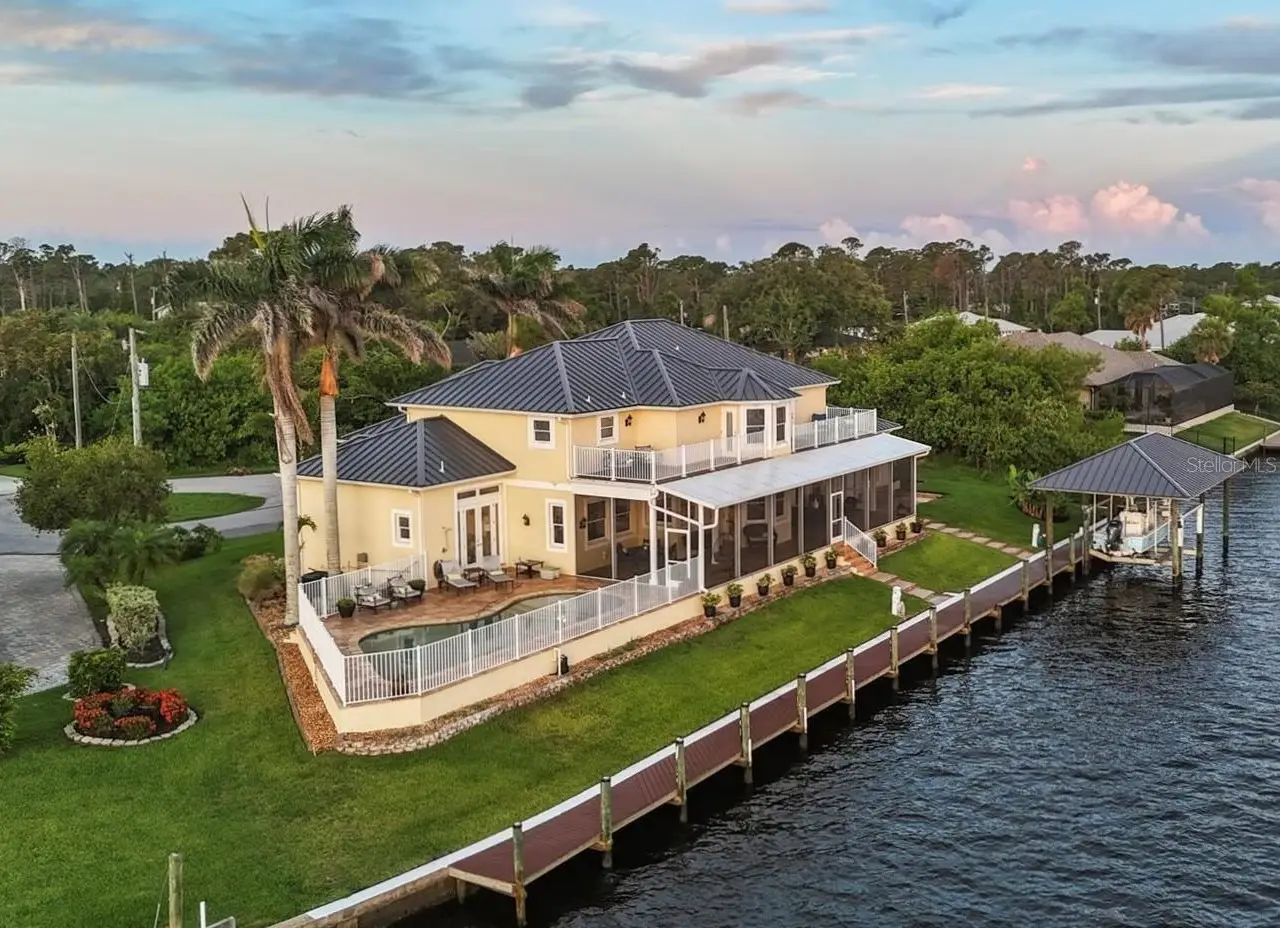 Introducing "River Breeze at Paradise Point" the whimsical name of this breathtaking property, affectionately bestowed by the current owners. This stunning waterfront estate, stretching across 0.39 acres, is perched along the Myakka River with quick access to Charlotte Harbor and a 30-minute boat ride to the Gulf. It's every boater's dream to the best fishing in Southwest Florida, featuring 185 feet of concrete seawall, a 167-foot captain's walk, and a 2023 metal-roofed boathouse with a 16,000 lb remote-controlled boat lift. Enjoy dolphin, manatee, and bald eagle sightings, or cast a line for record snook, world-renown tarpon, and redfish all from your backyard. The home offers 3,825 sq ft of living space and a spacious, well-organized 1,327 sq ft 4+ car garage with 10.5-foot ceilings. Inside, the soaring 20-foot foyer with a sweeping staircase leads into a bright music room with 12-foot bamboo tray ceiling, and an entertainer's dream kitchen featuring a massive quartz island, updated cabinetry, stainless appliances, and three built-in dishwashers. The kitchen flows seamlessly into the dining and bar areas and out to a 56-foot screened patio and extended lanai perfect for year-round indoor-outdoor living. Step out to the heated saltwater pool, surrounded by open-air lounge space ideal for relaxing in the Florida sunshine. The primary suite is a private retreat with a sitting area, two walk-in closets, a luxurious 14x14 bathroom with a 5x7 glass shower, and direct access to a private waterfront balcony. The primary guest suite also features a private balcony and river views. Every bedroom is en suite, ensuring comfort and privacy for guests. Throughout the home, enjoy travertine and engineered wood flooring with porcelain tile in 2nd level bathrooms, detailed crown molding, and abundant storage including multiple custom closets. Additional recent upgrades include a new standing seam metal roof (house and boathouse), two new A/C units with whole-home UV filtration, spray foam insulation, PECS plumbing system, impact-resistant windows and doors throughout, and fresh interior/exterior paint. The pool features a new heat pump, chlorine generator, and variable-speed pump, while rebuilt decks and upgraded kitchen and baths further elevate the home's quality and style. Tucked away in Gulf Cove, a hidden gem community known for its quiet streets, friendly neighbors, and walkable, bike-friendly atmosphere, this exceptional home offers luxury, comfort, and breathtaking water views delivering unmatched waterfront living in a peaceful coastal setting.