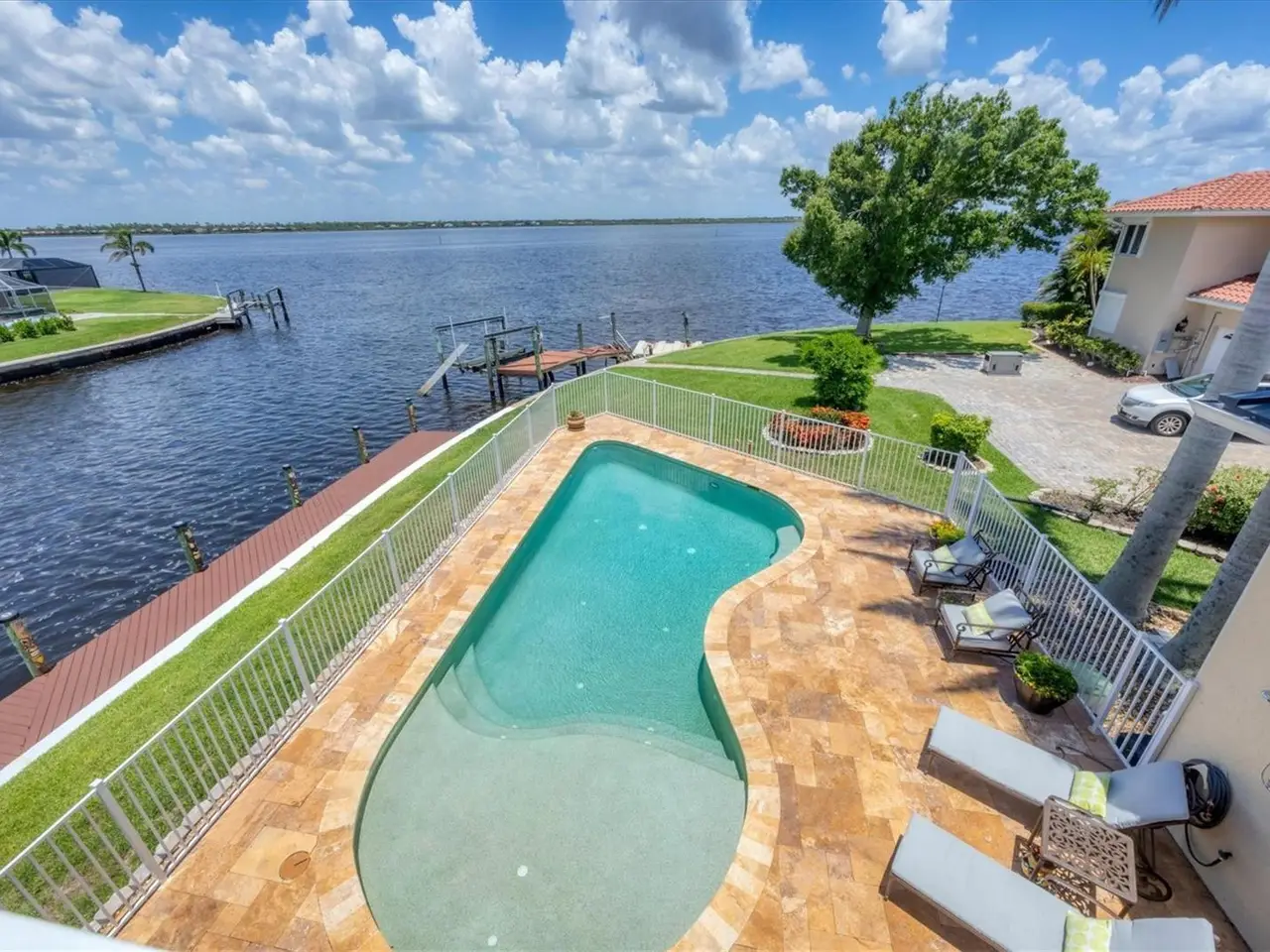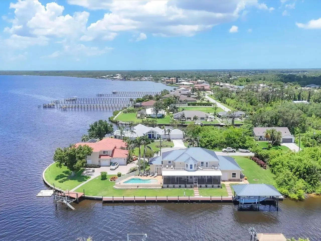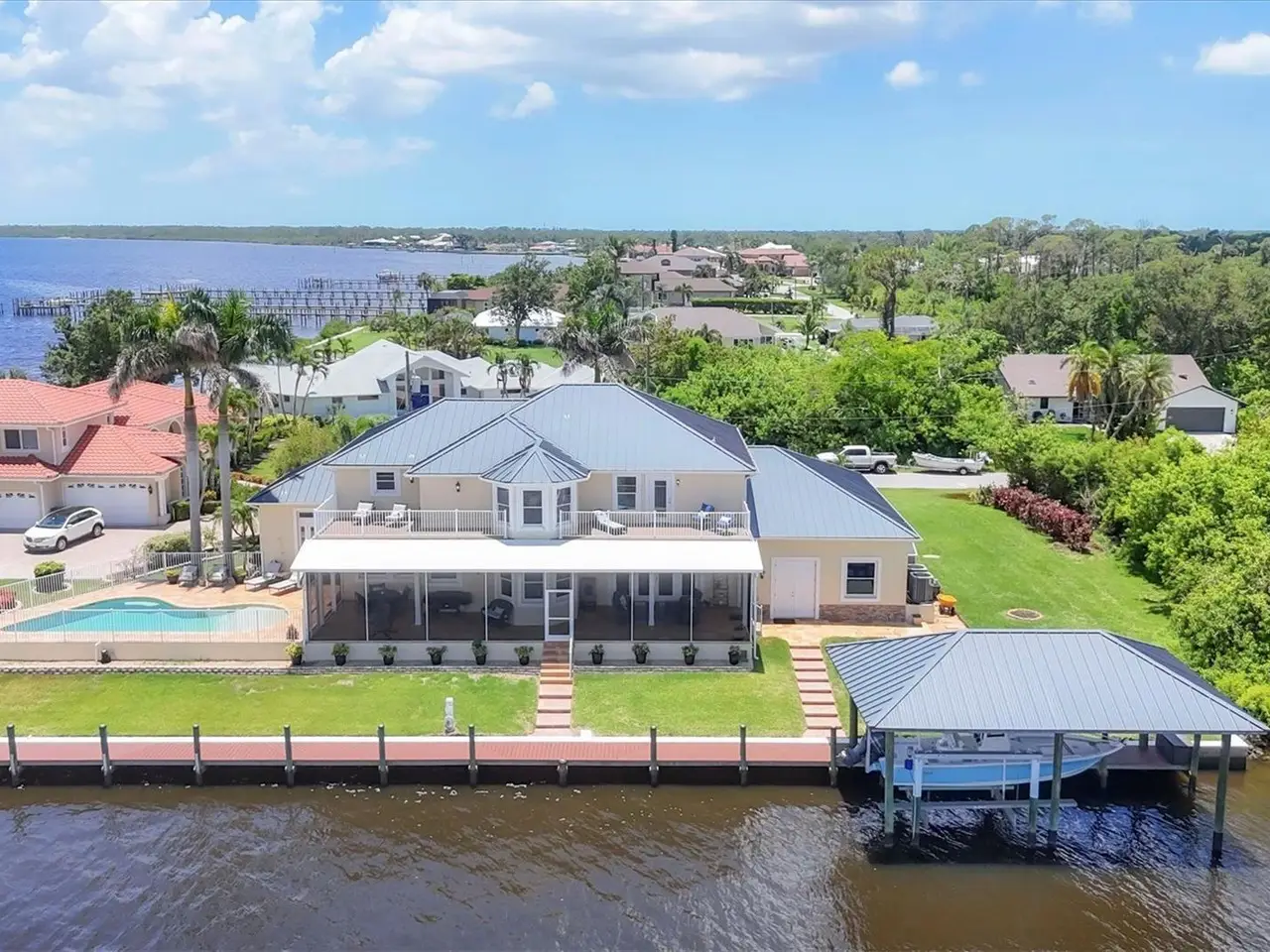 Introducing "River Breeze at Paradise Point" the whimsical name of this breathtaking property, affectionately bestowed by the current owners. This stunning waterfront estate, stretching across 0.39 acres, is perched along the Myakka River with quick access to Charlotte Harbor and a 30-minute boat ride to the Gulf. It's every boater's dream to the best fishing in Southwest Florida, featuring 185 feet of concrete seawall, a 167-foot captain's walk, and a 2023 metal-roofed boathouse with a 16,000 lb remote-controlled boat lift. Enjoy dolphin, manatee, and bald eagle sightings, or cast a line for record snook, world-renown tarpon, and redfish all from your backyard. The home offers 3,825 sq ft of living space and a spacious, well-organized 1,327 sq ft 4+ car garage with 10.5-foot ceilings. Inside, the soaring 20-foot foyer with a sweeping staircase leads into a bright music room with 12-foot bamboo tray ceiling, and an entertainer's dream kitchen featuring a massive quartz island, updated cabinetry, stainless appliances, and three built-in dishwashers. The kitchen flows seamlessly into the dining and bar areas and out to a 56-foot screened patio and extended lanai perfect for year-round indoor-outdoor living. Step out to the heated saltwater pool, surrounded by open-air lounge space ideal for relaxing in the Florida sunshine. The primary suite is a private retreat with a sitting area, two walk-in closets, a luxurious 14x14 bathroom with a 5x7 glass shower, and direct access to a private waterfront balcony. The primary guest suite also features a private balcony and river views. Every bedroom is en suite, ensuring comfort and privacy for guests. Throughout the home, enjoy travertine and engineered wood flooring with porcelain tile in 2nd level bathrooms, detailed crown molding, and abundant storage including multiple custom closets. Additional recent upgrades include a new standing seam metal roof (house and boathouse), two new A/C units with whole-home UV filtration, spray foam insulation, PECS plumbing system, impact-resistant windows and doors throughout, and fresh interior/exterior paint. The pool features a new heat pump, chlorine generator, and variable-speed pump, while rebuilt decks and upgraded kitchen and baths further elevate the home's quality and style. Tucked away in Gulf Cove, a hidden gem community known for its quiet streets, friendly neighbors, and walkable, bike-friendly atmosphere, this exceptional home offers luxury, comfort, and breathtaking water views delivering unmatched waterfront living in a peaceful coastal setting.