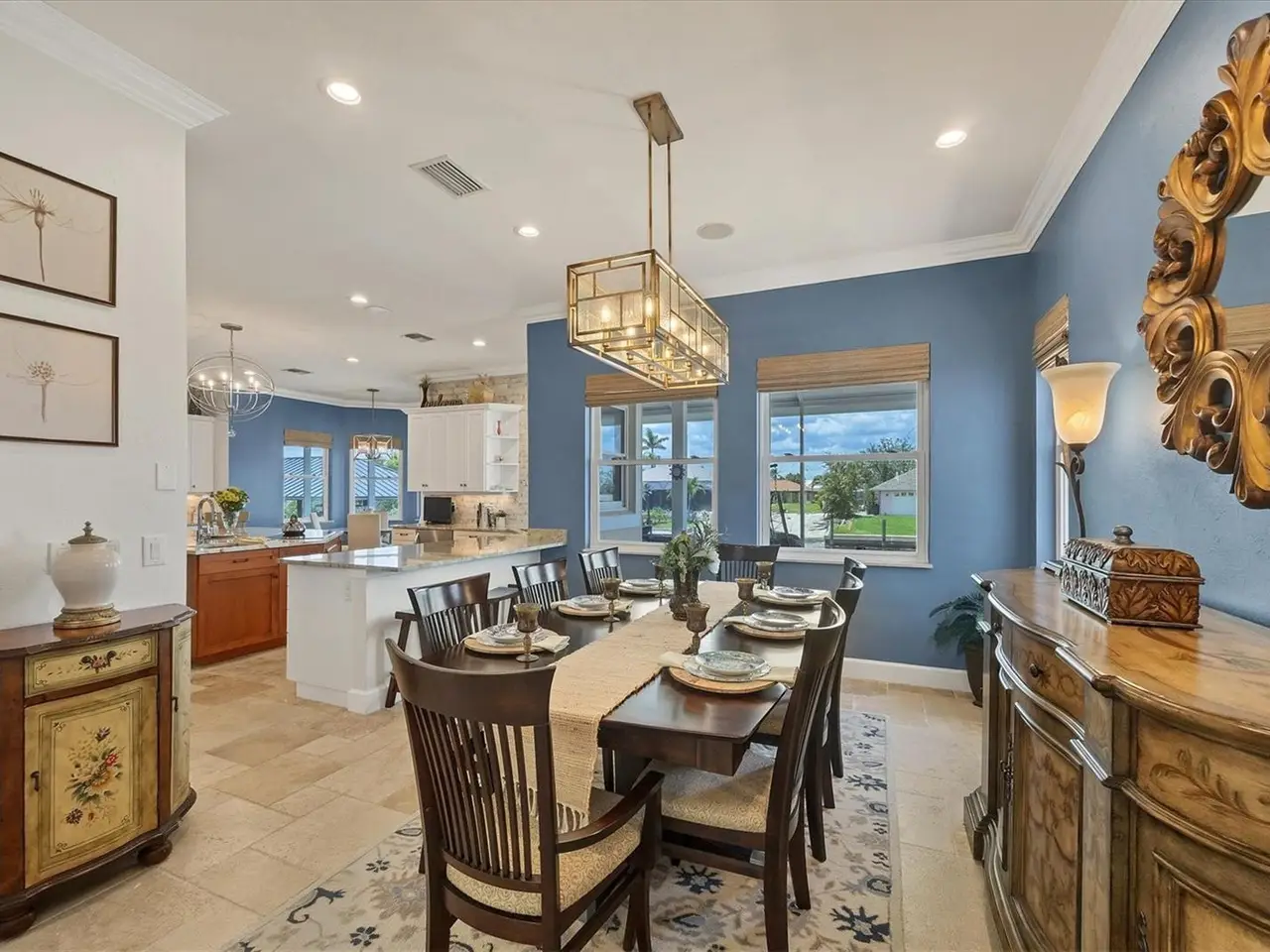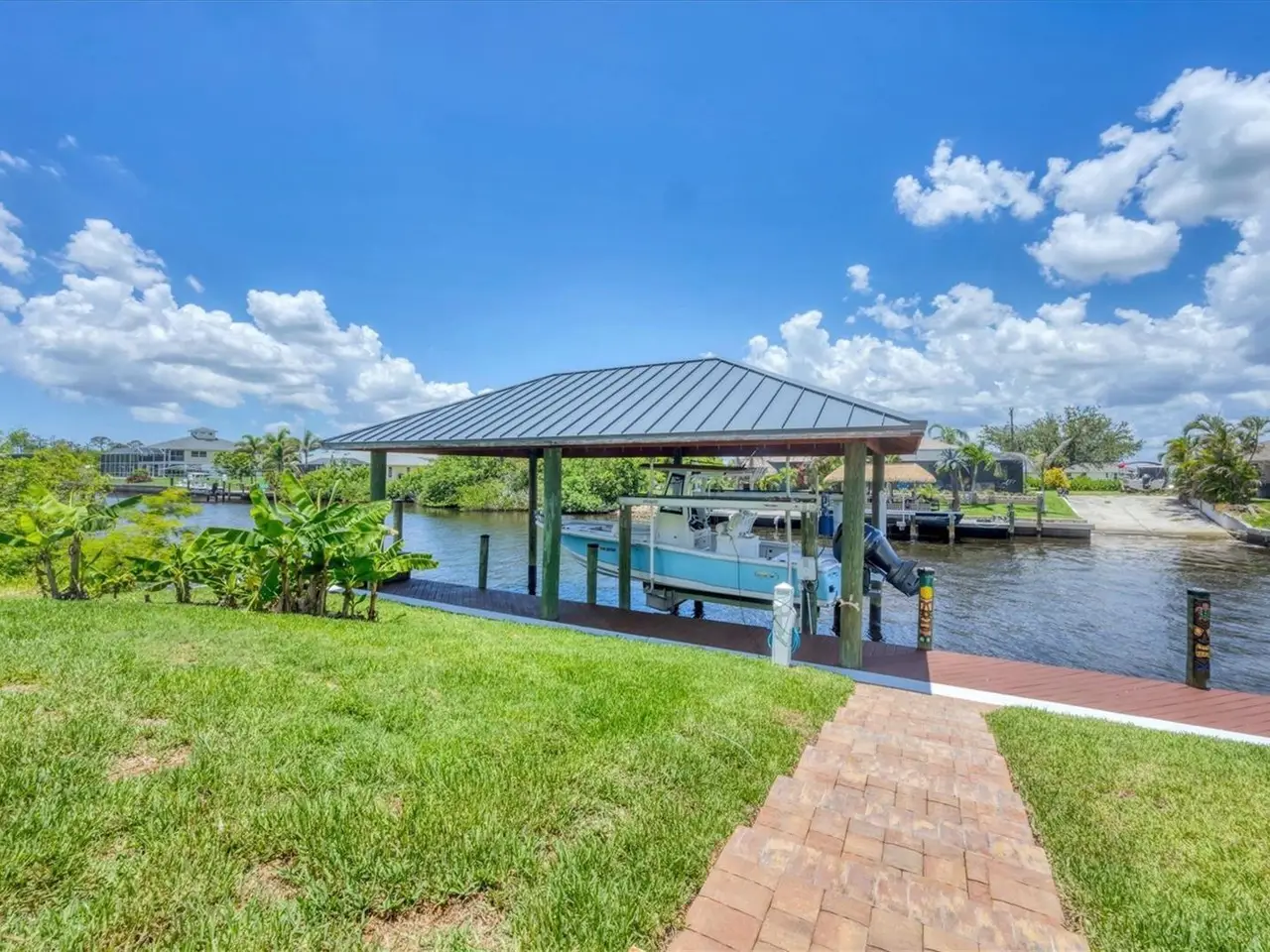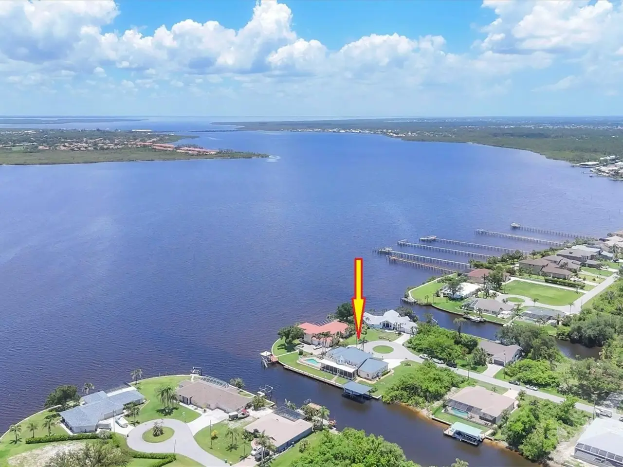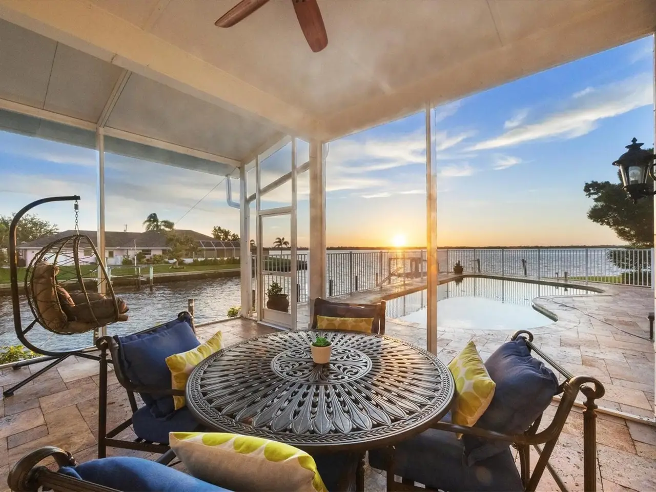 Introducing "River Breeze at Paradise Point" the whimsical name of this breathtaking property, affectionately bestowed by the current owners. This stunning waterfront estate, stretching across 0.39 acres, is perched along the Myakka River with quick access to Charlotte Harbor and a 30-minute boat ride to the Gulf. It's every boater's dream to the best fishing in Southwest Florida, featuring 185 feet of concrete seawall, a 167-foot captain's walk, and a 2023 metal-roofed boathouse with a 16,000 lb remote-controlled boat lift. Enjoy dolphin, manatee, and bald eagle sightings, or cast a line for record snook, world-renown tarpon, and redfish all from your backyard. The home offers 3,825 sq ft of living space and a spacious, well-organized 1,327 sq ft 4+ car garage with 10.5-foot ceilings. Inside, the soaring 20-foot foyer with a sweeping staircase leads into a bright music room with 12-foot bamboo tray ceiling, and an entertainer's dream kitchen featuring a massive quartz island, updated cabinetry, stainless appliances, and three built-in dishwashers. The kitchen flows seamlessly into the dining and bar areas and out to a 56-foot screened patio and extended lanai perfect for year-round indoor-outdoor living. Step out to the heated saltwater pool, surrounded by open-air lounge space ideal for relaxing in the Florida sunshine. The primary suite is a private retreat with a sitting area, two walk-in closets, a luxurious 14x14 bathroom with a 5x7 glass shower, and direct access to a private waterfront balcony. The primary guest suite also features a private balcony and river views. Every bedroom is en suite, ensuring comfort and privacy for guests. Throughout the home, enjoy travertine and engineered wood flooring with porcelain tile in 2nd level bathrooms, detailed crown molding, and abundant storage including multiple custom closets. Additional recent upgrades include a new standing seam metal roof (house and boathouse), two new A/C units with whole-home UV filtration, spray foam insulation, PECS plumbing system, impact-resistant windows and doors throughout, and fresh interior/exterior paint. The pool features a new heat pump, chlorine generator, and variable-speed pump, while rebuilt decks and upgraded kitchen and baths further elevate the home's quality and style. Tucked away in Gulf Cove, a hidden gem community known for its quiet streets, friendly neighbors, and walkable, bike-friendly atmosphere, this exceptional home offers luxury, comfort, and breathtaking water views delivering unmatched waterfront living in a peaceful coastal setting.
