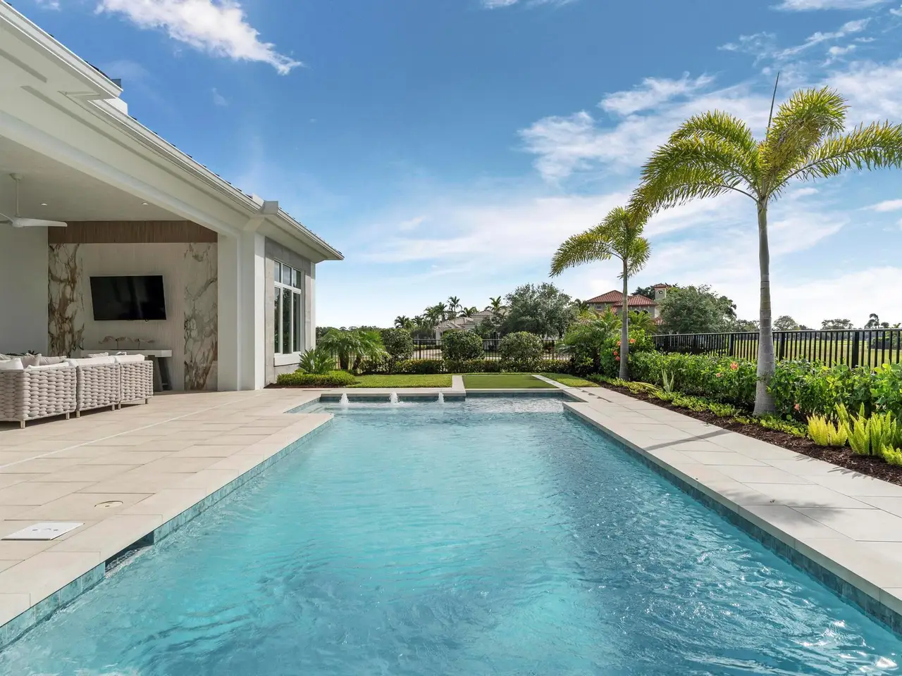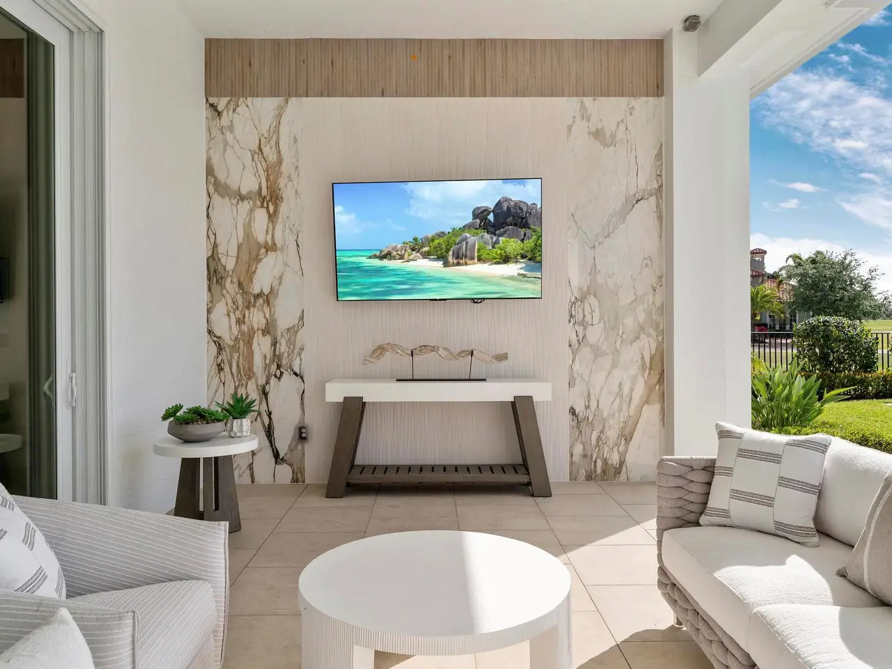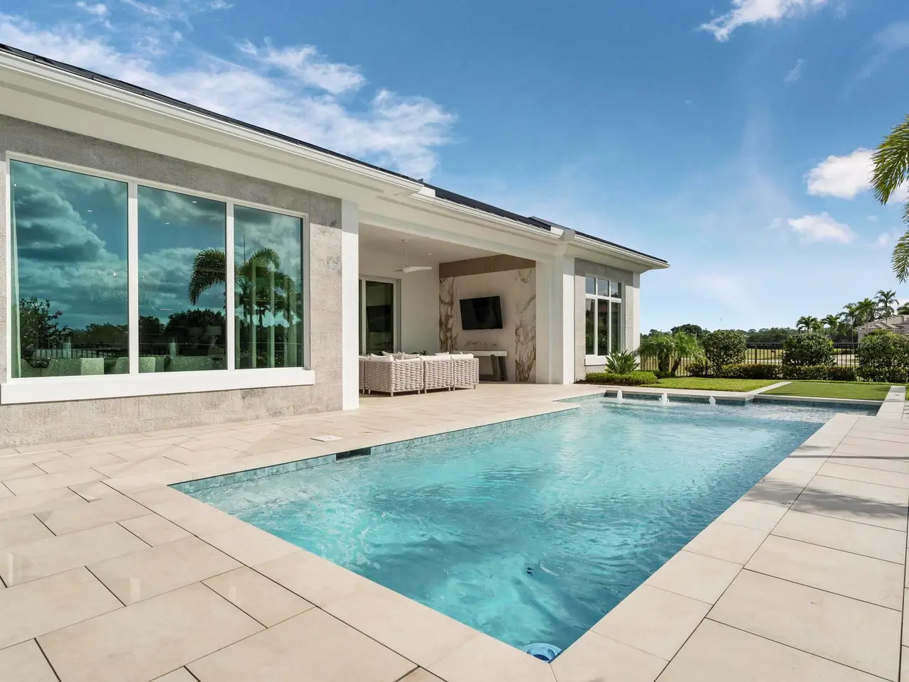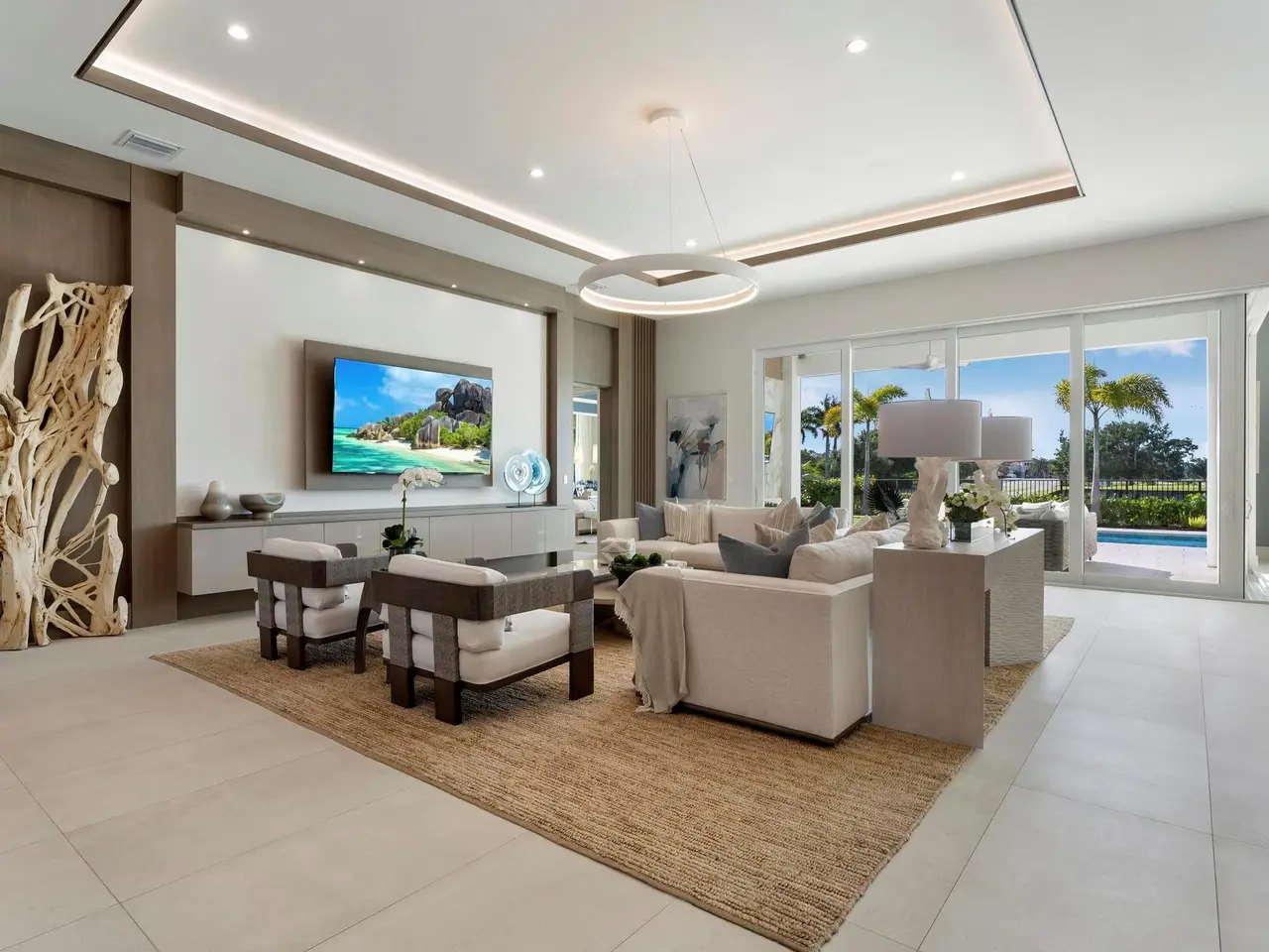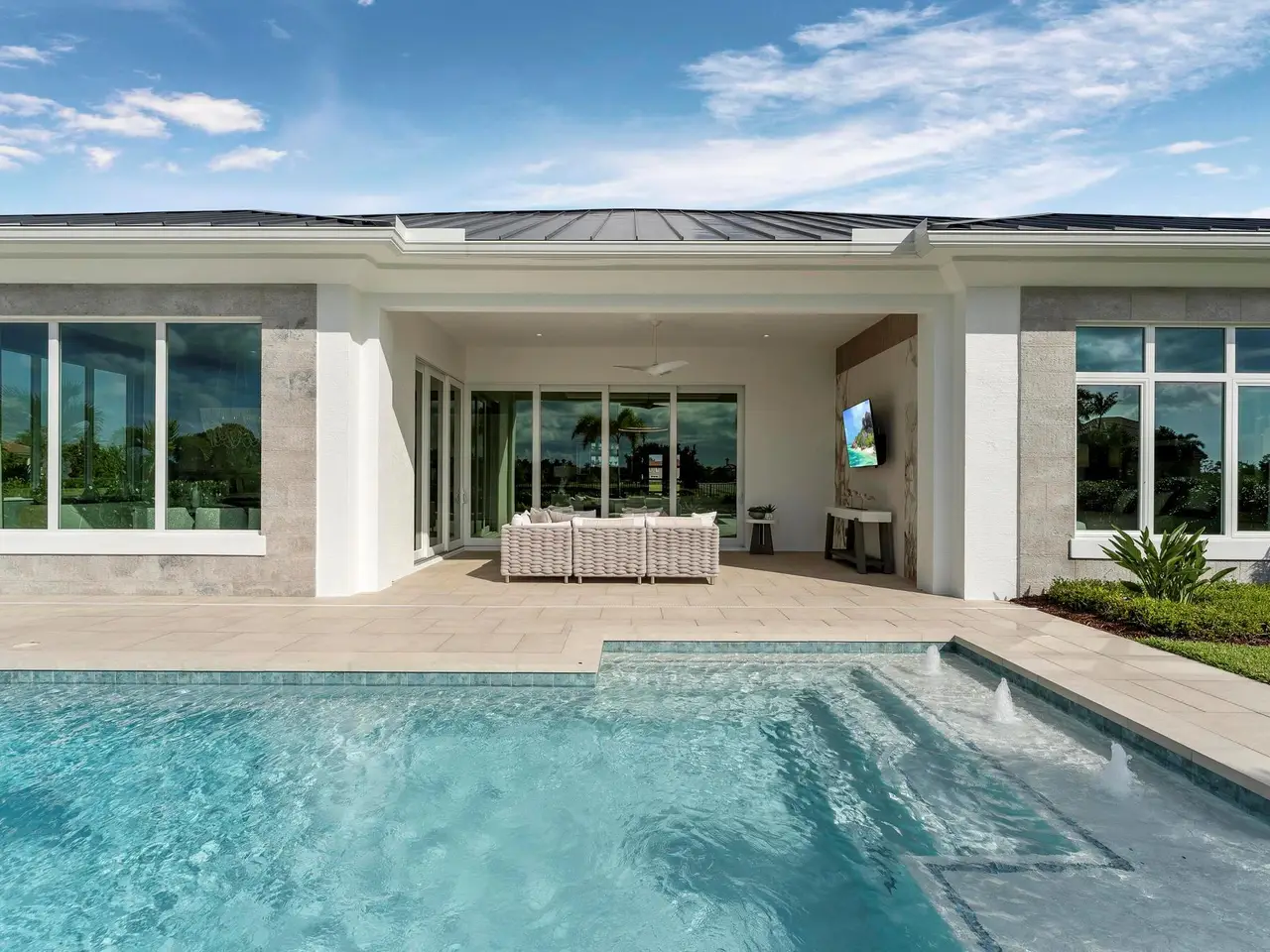 As you enter the gates of Tesoro, you are welcomed into a realm of luxury living. Elevate your lifestyle with a beautifully appointed model home from Ecclestone Signature Homes, featuring breathtaking views of the golf course and serene water. This residence offers three bedrooms, along with a den or flexible space, and is adorned with high-quality upgrades and finishes. The Coastal Modern Design promotes an open-concept layout with soaring ceilings, creating an ideal environment for entertaining. A spacious patio, complete with a custom-built TV wall, enhances outdoor living. With impact windows and doors throughout, homeownership is effortless. This residence has been meticulously decorated by one of South Florida's most esteemed designers, making it a true turnkey opportunity.