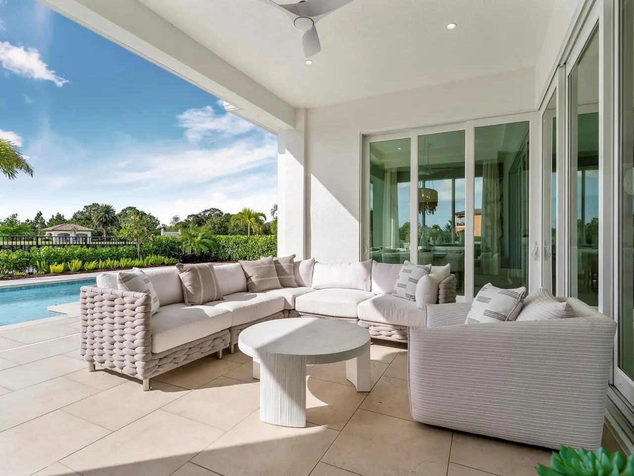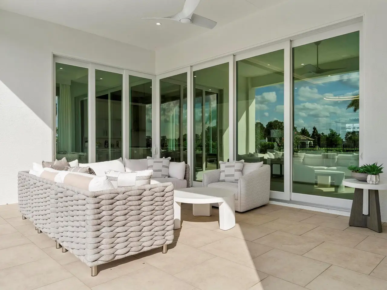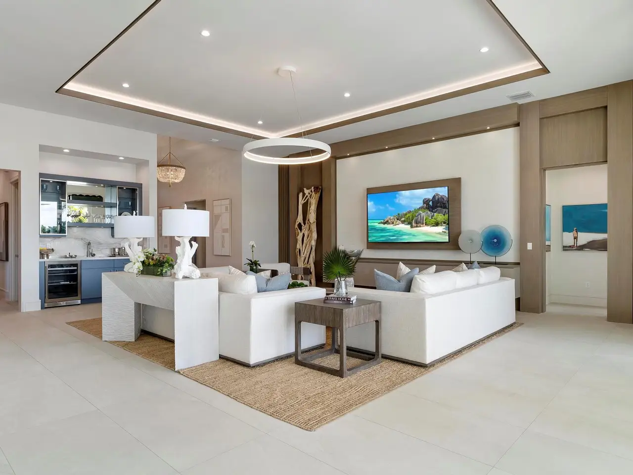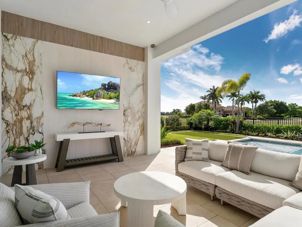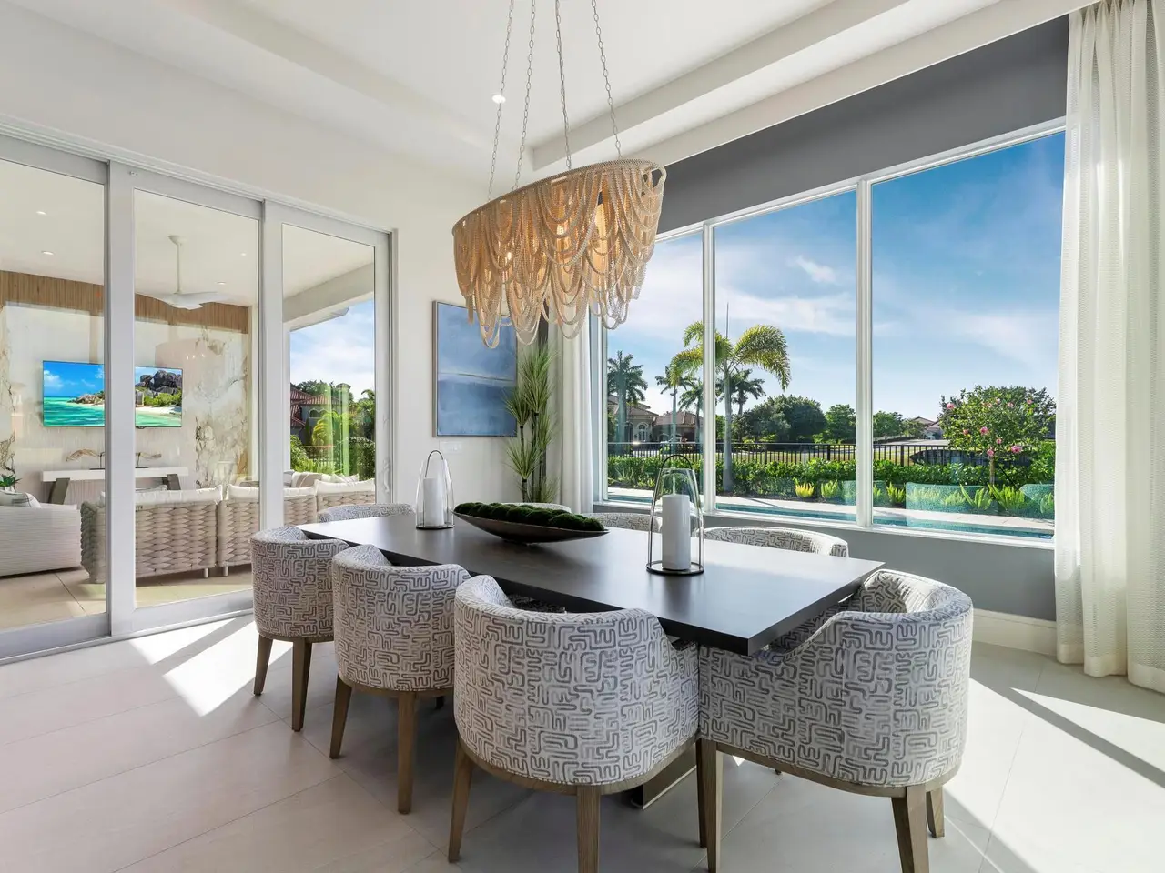 As you enter the gates of Tesoro, you are welcomed into a realm of luxury living. Elevate your lifestyle with a beautifully appointed model home from Ecclestone Signature Homes, featuring breathtaking views of the golf course and serene water. This residence offers three bedrooms, along with a den or flexible space, and is adorned with high-quality upgrades and finishes. The Coastal Modern Design promotes an open-concept layout with soaring ceilings, creating an ideal environment for entertaining. A spacious patio, complete with a custom-built TV wall, enhances outdoor living. With impact windows and doors throughout, homeownership is effortless. This residence has been meticulously decorated by one of South Florida's most esteemed designers, making it a true turnkey opportunity.