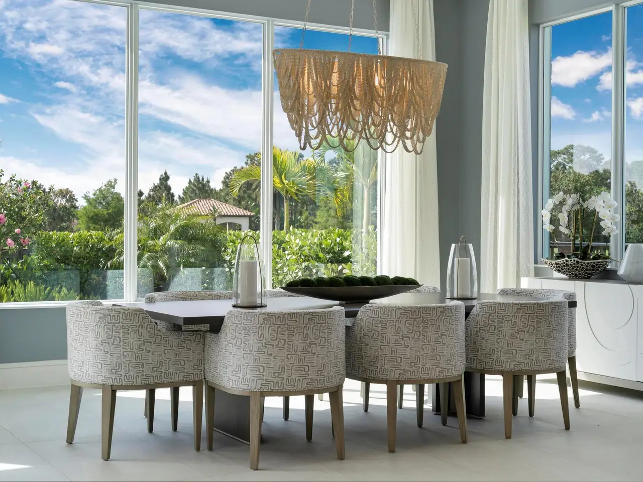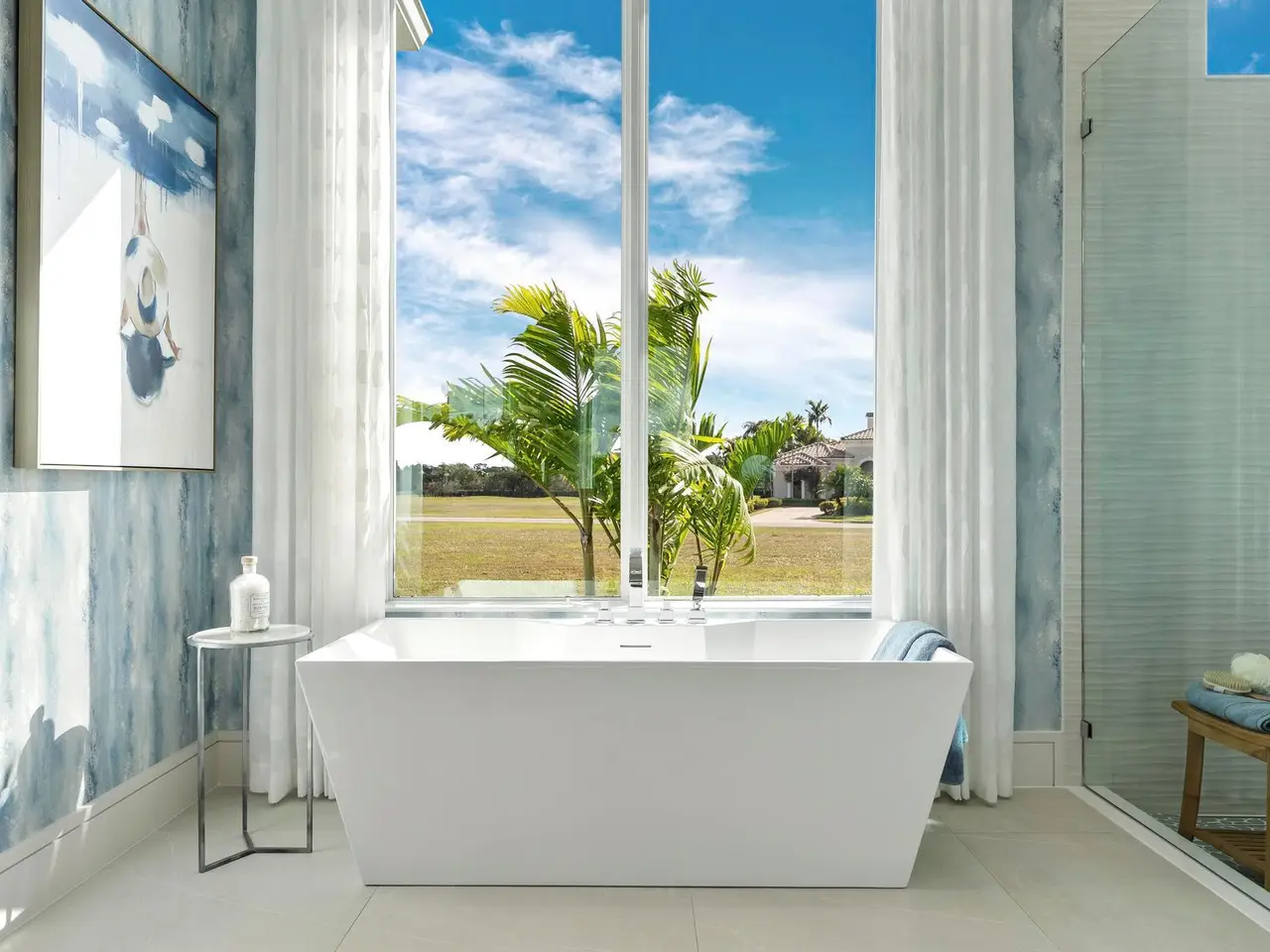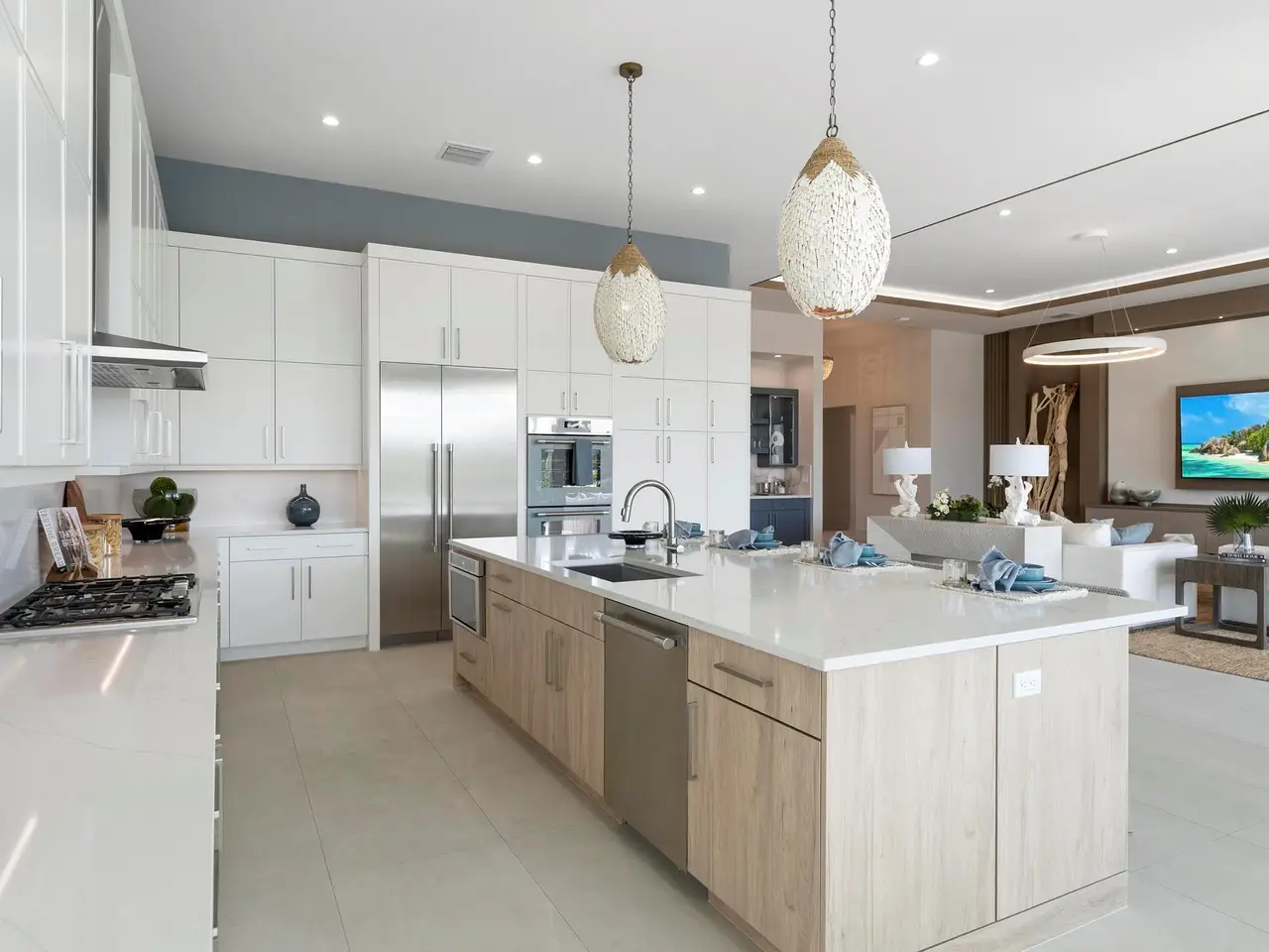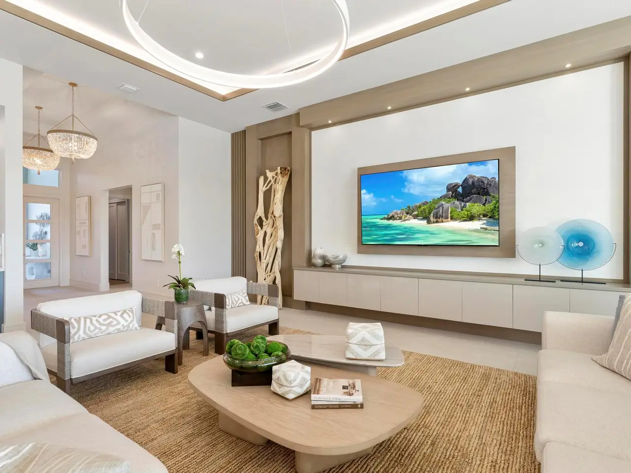 As you enter the gates of Tesoro, you are welcomed into a realm of luxury living. Elevate your lifestyle with a beautifully appointed model home from Ecclestone Signature Homes, featuring breathtaking views of the golf course and serene water. This residence offers three bedrooms, along with a den or flexible space, and is adorned with high-quality upgrades and finishes. The Coastal Modern Design promotes an open-concept layout with soaring ceilings, creating an ideal environment for entertaining. A spacious patio, complete with a custom-built TV wall, enhances outdoor living. With impact windows and doors throughout, homeownership is effortless. This residence has been meticulously decorated by one of South Florida's most esteemed designers, making it a true turnkey opportunity.