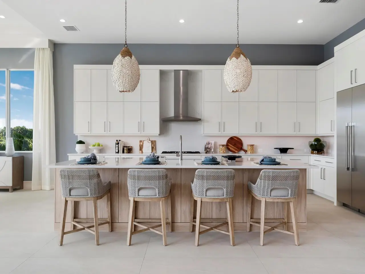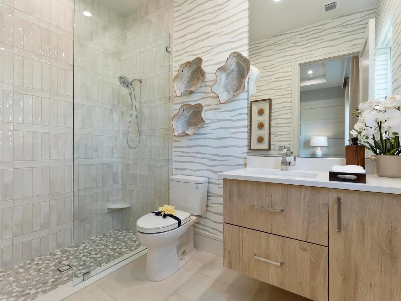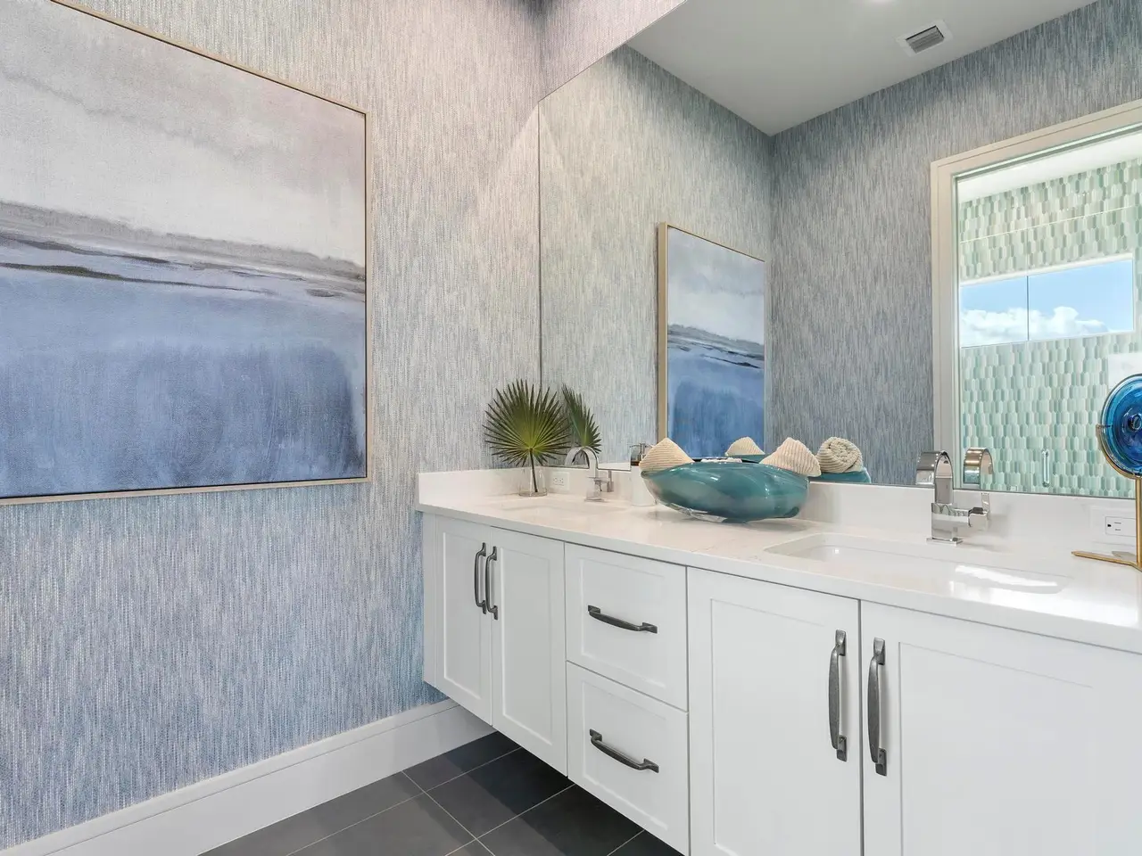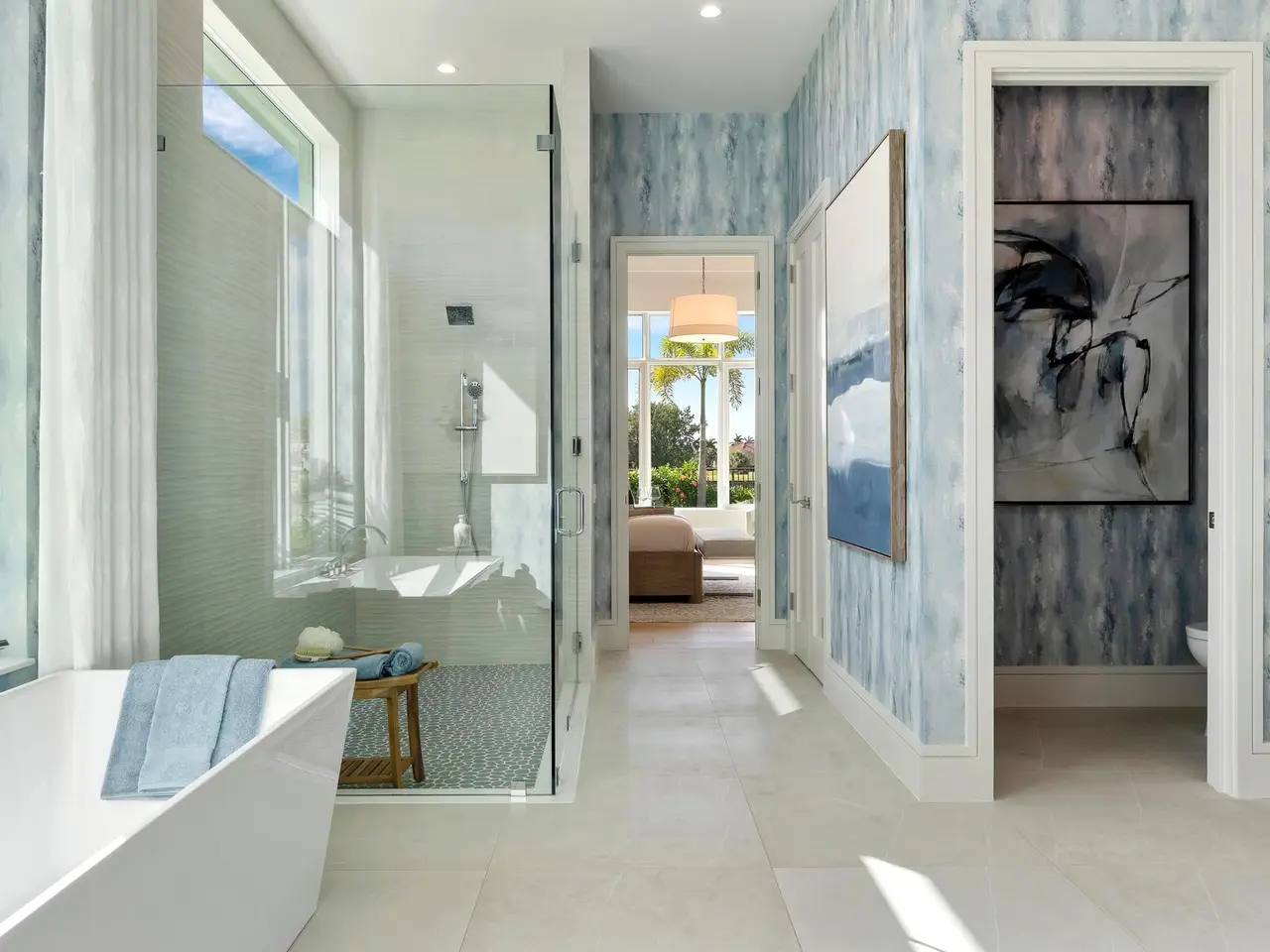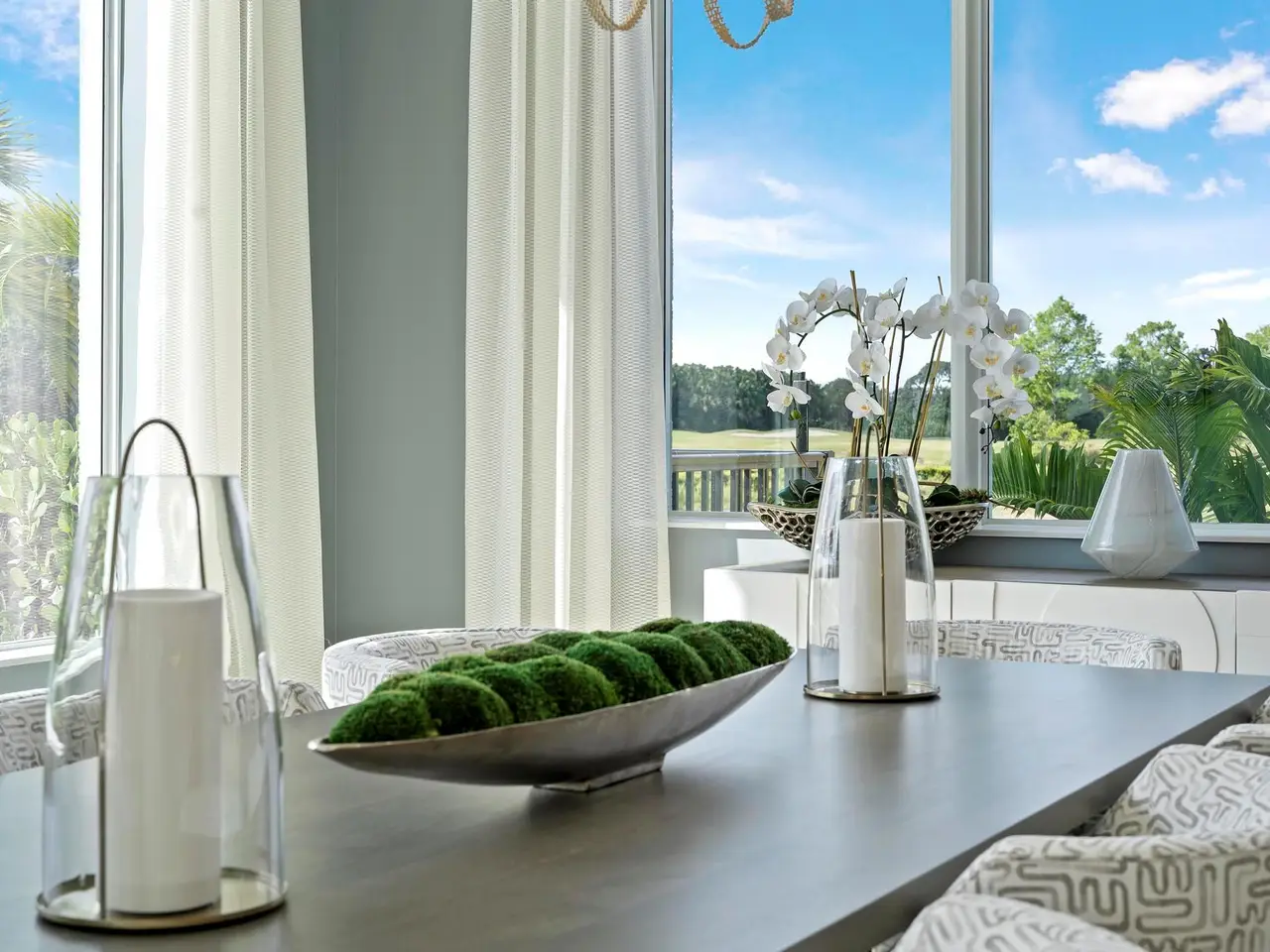 As you enter the gates of Tesoro, you are welcomed into a realm of luxury living. Elevate your lifestyle with a beautifully appointed model home from Ecclestone Signature Homes, featuring breathtaking views of the golf course and serene water. This residence offers three bedrooms, along with a den or flexible space, and is adorned with high-quality upgrades and finishes. The Coastal Modern Design promotes an open-concept layout with soaring ceilings, creating an ideal environment for entertaining. A spacious patio, complete with a custom-built TV wall, enhances outdoor living. With impact windows and doors throughout, homeownership is effortless. This residence has been meticulously decorated by one of South Florida's most esteemed designers, making it a true turnkey opportunity.