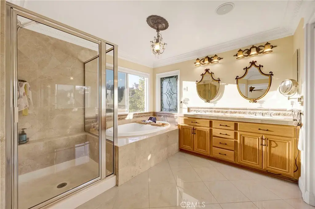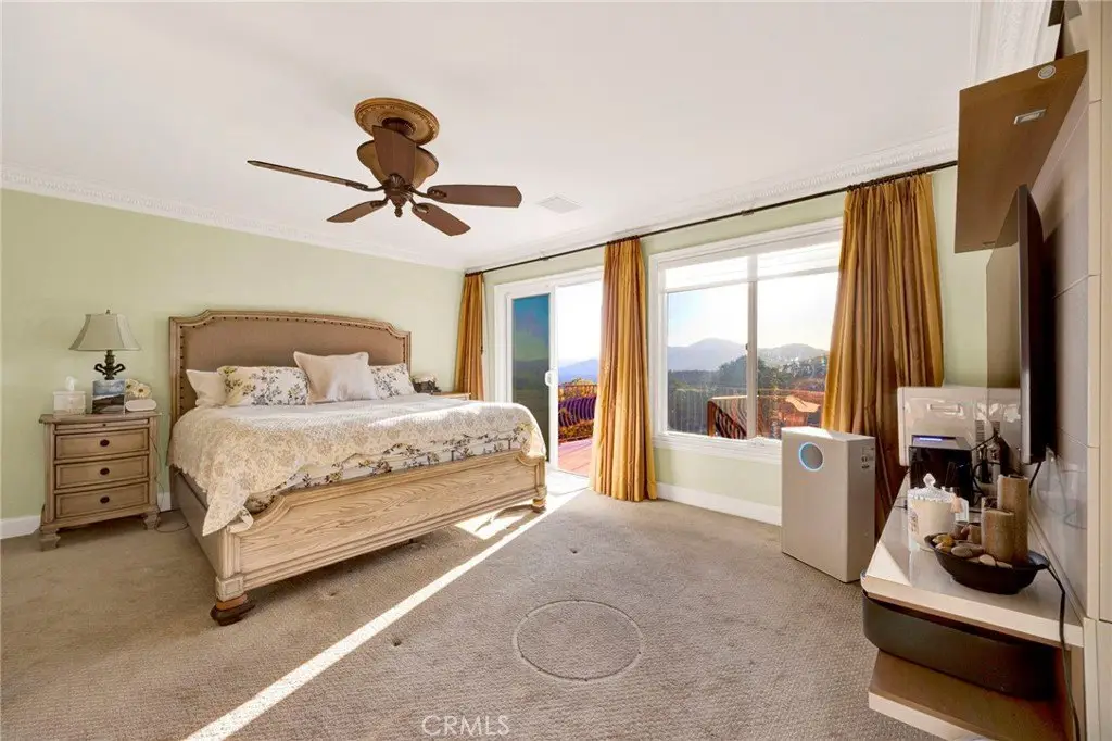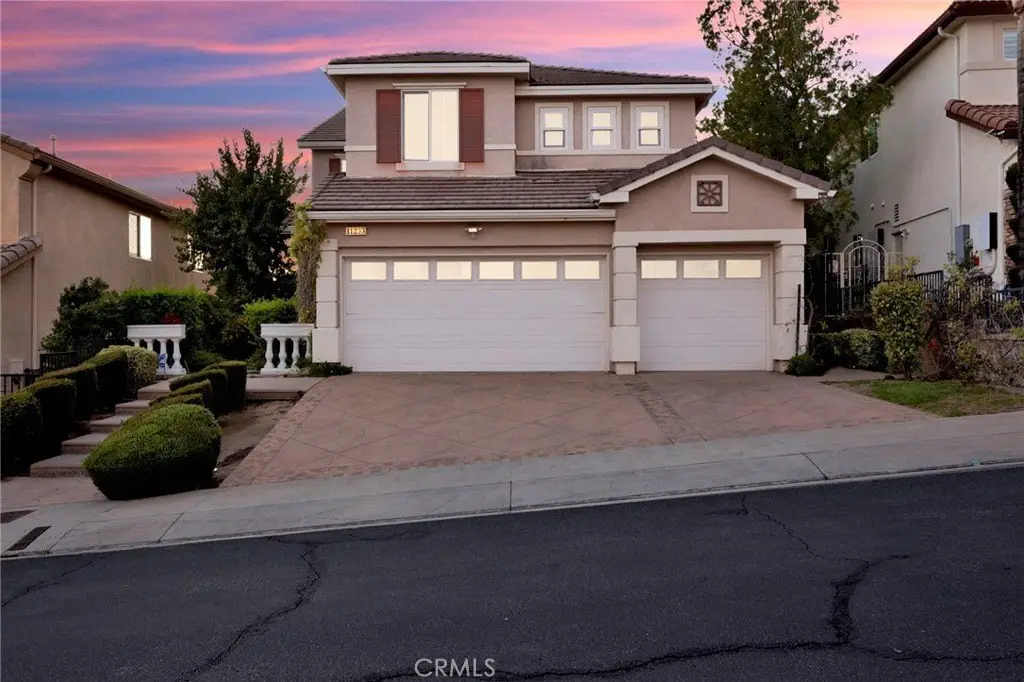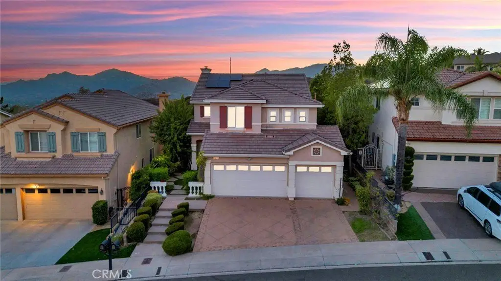 Unrivaled Views – Sorrento Living at Its Finest. DO THE COMPARISON! Unmatched value in the exclusive, guard-gated Sorrento community of Porter Ranch with sweeping city views. Elegant two story home, manicured landscaping and a serene sunset backdrop. 2,702 square feet of elegant & bright living space featuring striking curved staircase with wooden banister. The two story foyer highlights the beautiful chandelier and tiled flooring with decorative inlays. The walls are painted a warm, light yellow, complemented by custom white crown moldings. Adjacent to the living room is the dining section and a family room that seamlessly flows into a gourmet kitchen with granite counter tops, light wood cabinetry, large center island, custom backsplash and built in appliances like fridge, stainless steel double oven, cooktop, and dishwasher. Abundance of windows plus sliding door leads to the backyard from the family room to a resort backyard + paved patio area under a pergola supported by columns. An inviting spa among decorative rocks and unbelievable sunsets! First floor includes 1 bedroom, 1 full bathroom and a separate room for laundry adjacent to a direct access three car garage. Ascend to the second floor and you will find 5 bedrooms and 2 bathrooms. Spacious second floor landing is bathed in natural light from well placed high custom windows, natural toned carpet and expansive transition to the bedrooms and the private primary suite. 3 spacious bedrooms and a primary bedroom. The primary suite is the highlight of this home, the major highlight is the direct access to the private terrace with views of the hills and city. Views all the way to Santa Monica mountains, Santa Susana mountain, and the entire the valley. The primary en suite bathroom features tiled walk in shower and deep soaking tub with a perfect window placement to absorb in all the views. The dual sink vanity with ample counter space highlighted by two ornate, matching mirrors and stylish sconce lighting. Also not to forget the generous walk in closet ensuring a high end primary suite experience. Additional property feature includes solar panels. The home is in a desirable 24-hour guard-gated community with a TWO community pool/spa with low HOA dues of $305 per month. Come experience the difference in Porter Ranch.