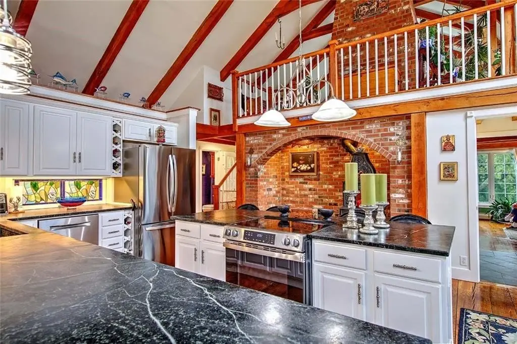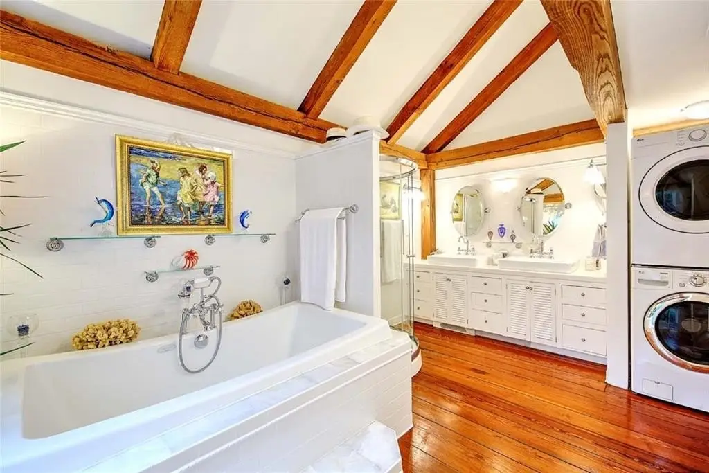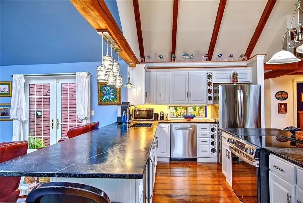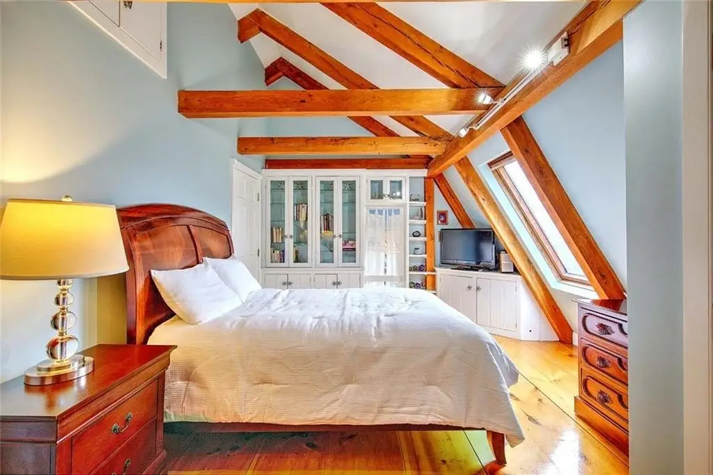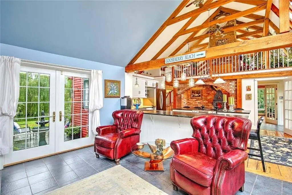 This one-of-a-kind hand-crafted post-and-beam home, named “Sakonnet Shores,” is a rare blend of artistry, sustainability, and connection to the land and sea. Built with traditional timber-frame techniques – without a single nail – the red oak beams were sourced from Massachusetts, hand-cut with wooden pegs, and raised on-site in the tradition of Amish barns. Red cedar siding, wide-plank antique pine floors milled from historic Fall River beams, and exposed timber throughout create warmth and timeless beauty. Built with SIP panels, solar design, and participation in the RI Energy program, the home is both efficient and income-generating. Natural light pours in through Pella and Andersen windows, French doors, sliders, and 10 skylights that frame saltwater views. Modern comforts include two dishwashers, dual laundry areas, a chef’s kitchen with cathedral ceilings, soapstone counters, bar seating for 12, and a walk-in pantry. The primary suite offers a spa bath, private patio, and outdoor shower, complemented by additional bedrooms, flexible office space, and multiple patios for entertaining. Fireplaces in the living room and upper salon invite cozy gatherings, while the lower-level gym doubles as a fifth bedroom with a sauna and steam shower. The 1.68-acre grounds feature flowering trees, hydrangeas, and saltwater frontage with rights to two moorings. Just minutes to Newport and 30 minutes to Providence, it’s a rare coastal retreat.