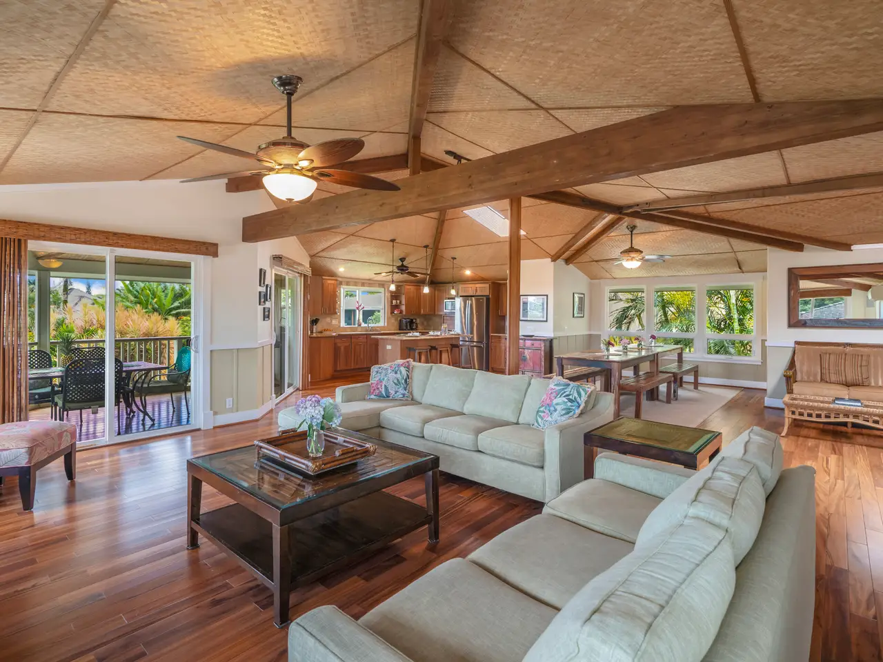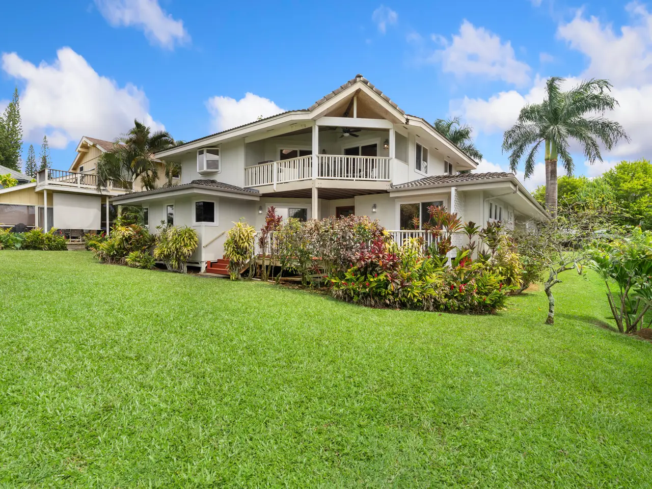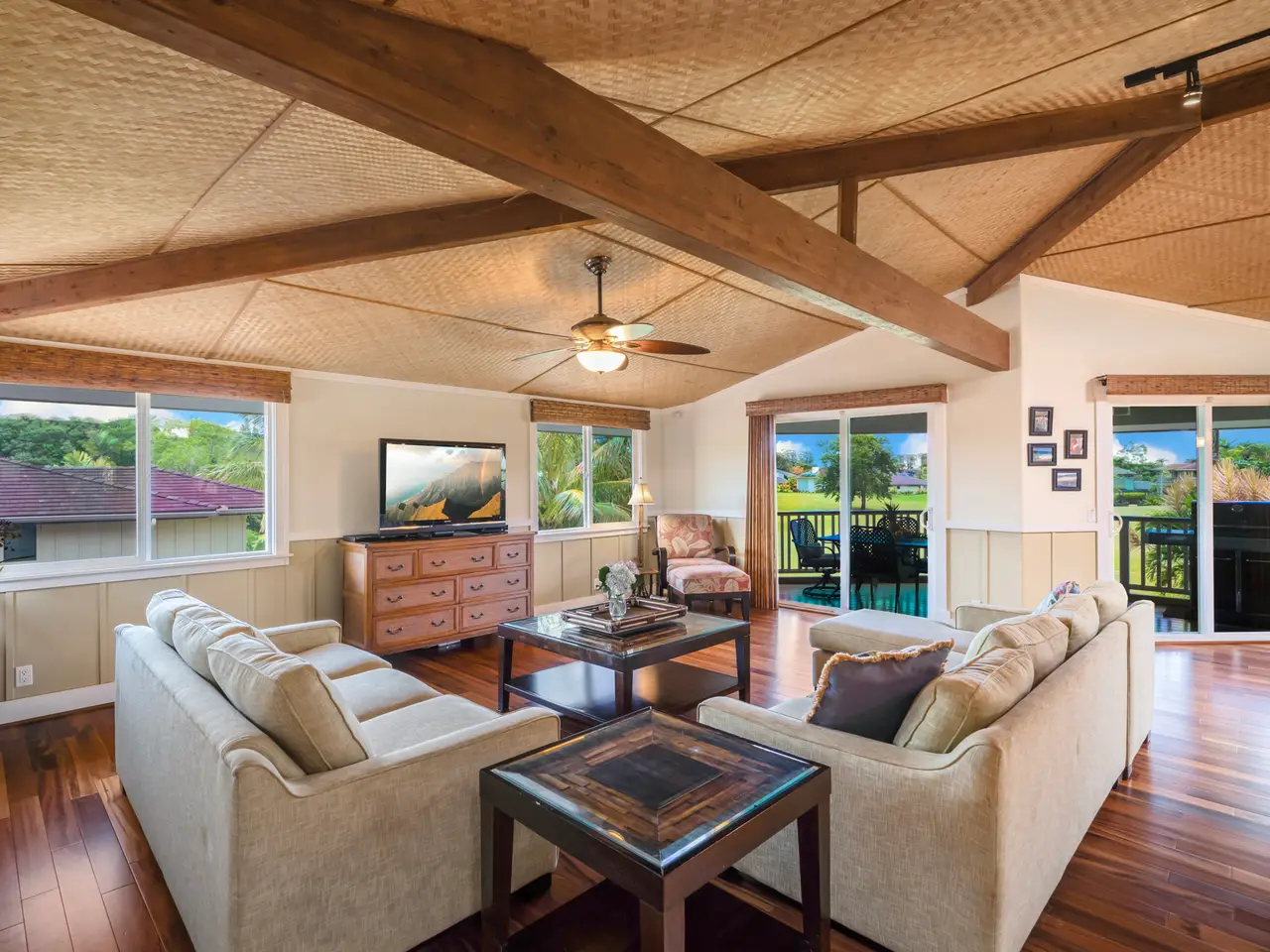 'Lola Hale' is located in central Princeville. This spacious 4 bedroom home sleeps 12. The upgraded two story home has hardwood floors, open beam ceilings and lanai on both floors. A large two car garage for all your beach and golf toys. The spacious kitchen has all the amenities for big family gatherings.There is a new hot tub and air conditioning throughout the house. With views of the Hanalei mountains and golf course you couldn't ask for more. Its just a short walk to Princeville Park and shopping center. A perfect family home or vacation home. .
