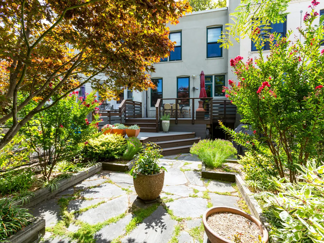 Landscaped rear garden with two decks