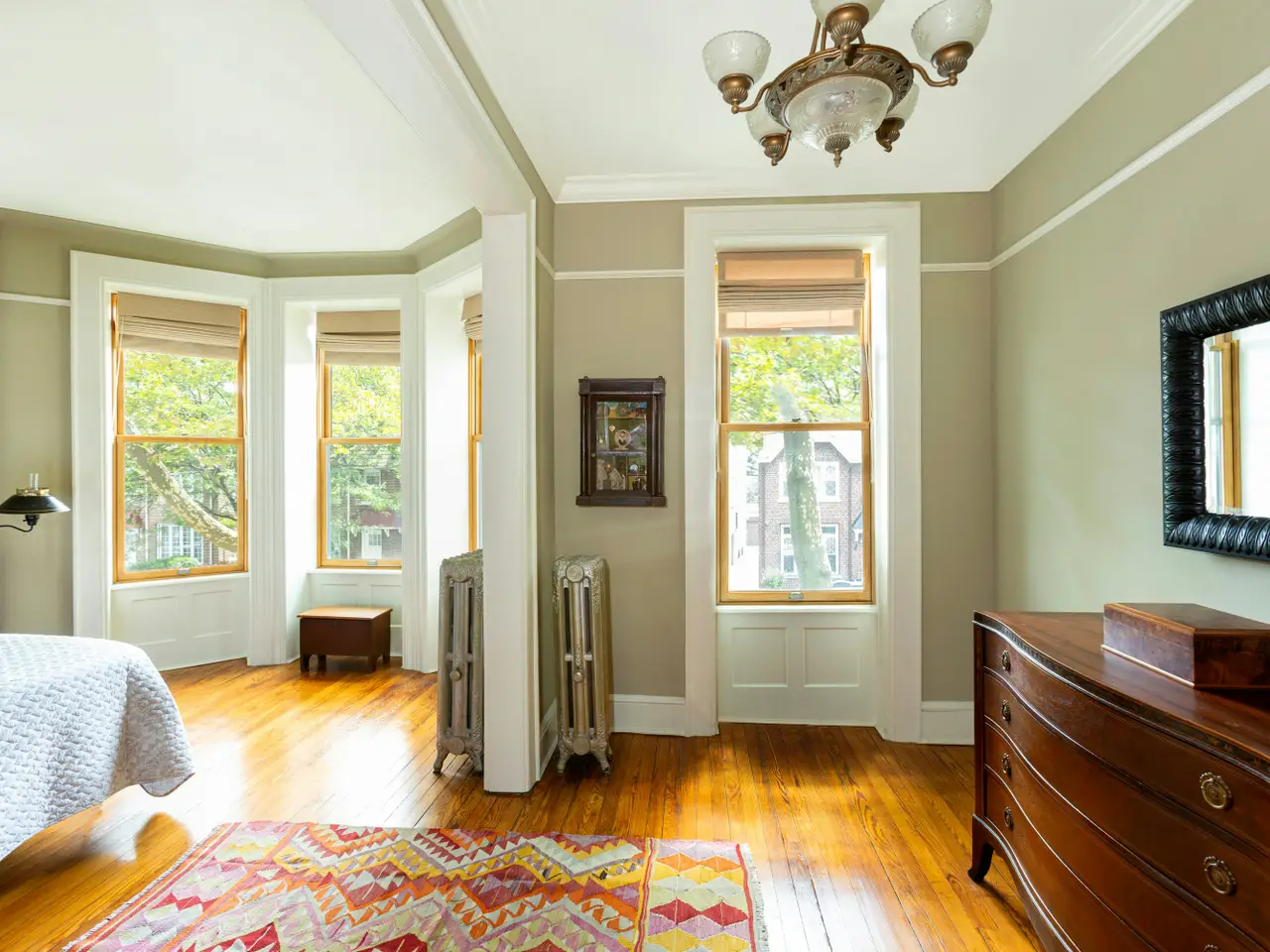 Gorgeous inside and out, this 1910 single-family townhouse is a winner! Lovingly cared for by the current owners over the last 20 years, it's small wonder that it has been included in the PLG House Tour. With its pretty limestone facade, the 1910 home is nestled on a leafy, tree-lined block. Beautifully maintained and preserved, the home retains its pre-war details: all wood moldings, doors, and window surrounds have been stripped and varnished. There are lovely glass-front built-in cabinets in the both the living room and formal dining room. The home's parlor vestibule welcomes you into the large south-facing front living room with its 11-foot-high ceilings and a bay window. There you'll find a handsome mantled decorative fireplace with twin arts and crafts glass-fronted cabinets on each side. Through this room's pocket door arch is the formal dining room with its coffered ceiling. Also on this floor is a split system for cooling in summer, with compressor cleverly hidden beneath the Trex and Ipe wood rear deck, accessed directly through the rear kitchen door. The renovated double-galley kitchen includes stainless steel appliances: Electrolux stove/oven, Samsung refrigerator and a dishwasher. On the corresponding island peninsula/pass-through counter is a small cocktail sink and plentiful storage in the cabinets beneath. The adjacent windowed dining room has views onto the landscaped rear garden and its two decks, one near and the other at the back of the property. On the second floor, you will find three bedrooms and a handsome renovated bath with soaking tub and shower, glass-tiled walls and marble accents, floor, and tub surround. There is also covered walls, an electric towel warmer and a pretty vintage-style porcelain pedestal sink. This floor has a stained-glass skylight above the staircase stairwell and three bedrooms, each with closets and a dressing passage with cabinetry between the two larger bedrooms. The finished basement level functions as a multi-use room, with a washer and dryer; a full second tiled bathroom with shower; a work area and slop sink; a closet and room for storage; multiple cupboards; and a separate entrance under the front stoop entrance. A door at the rear of the basement provides access to the rear garden. The property boasts mature, well-established gardens in the front and back, all on automated drip systems to minimize your time watering.