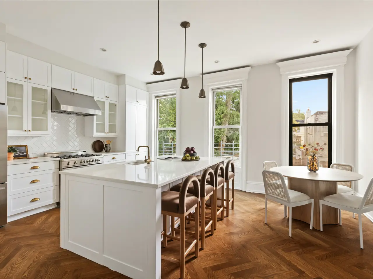 With a two-car garage and long driveway with space for four additional parking spots, an expansive backyard patio, and a full lounge level with a wet bar, 36 Rutland Road is designed for effortless entertaining both indoors and out. The home offers a rare combination of historic charm, modern luxury, and unmatched space in the heart of Prospect-Lefferts Gardens. On the parlor level, original details and antique brass lighting frame an airy, open layout ideal for hosting. At the rear, the eat-in kitchen is a chef's dream-professionally outfitted with a gas range and hood, refrigerator, dishwasher, and Summit wine cooler, all set against Caesarstone quartz countertops and custom cabinetry. A large center island anchors the space, while luminous hardwood floors flow seamlessly throughout. The garden level offers a spacious bedroom with an original fireplace mantel, an oversized walk-in closet, and an en-suite bath. Toward the back, a fully equipped wet bar-complete with an under-counter wine cooler and refrigerator-connects to a casual lounge and mudroom with backyard access, creating the ultimate gathering space. Occupying the full second floor, the primary suite is a private retreat with over 100 square feet of closet space, a dressing area, and abundant light streaming through multiple windows. Two fireplace mantels add character, while a flexible alcove is perfect for a sitting room, home office, or yoga space. The en-suite bath and dedicated laundry room complete this serene hideaway. The top floor offers two additional bedrooms, each with custom walk-in closets and en-suite baths. One features a soaking tub, standing shower, double vanity, and a skylight that floods the space with natural light. Additional storage, a second laundry area, radiant heated bathroom floors, central air conditioning, and a new intercom and security system ensure modern comfort and convenience throughout. Set on a picturesque tree-lined street in the Prospect-Lefferts Gardens Historic District, just steps from Prospect Park, this location offers the best of Brooklyn living. The Prospect Park Zoo, Brooklyn Botanic Garden, and Brooklyn Museum are moments away, along with neighborhood dining favorites. With the B, Q, S, 2, and 5 trains nearby, you can be anywhere in the city in minutes.