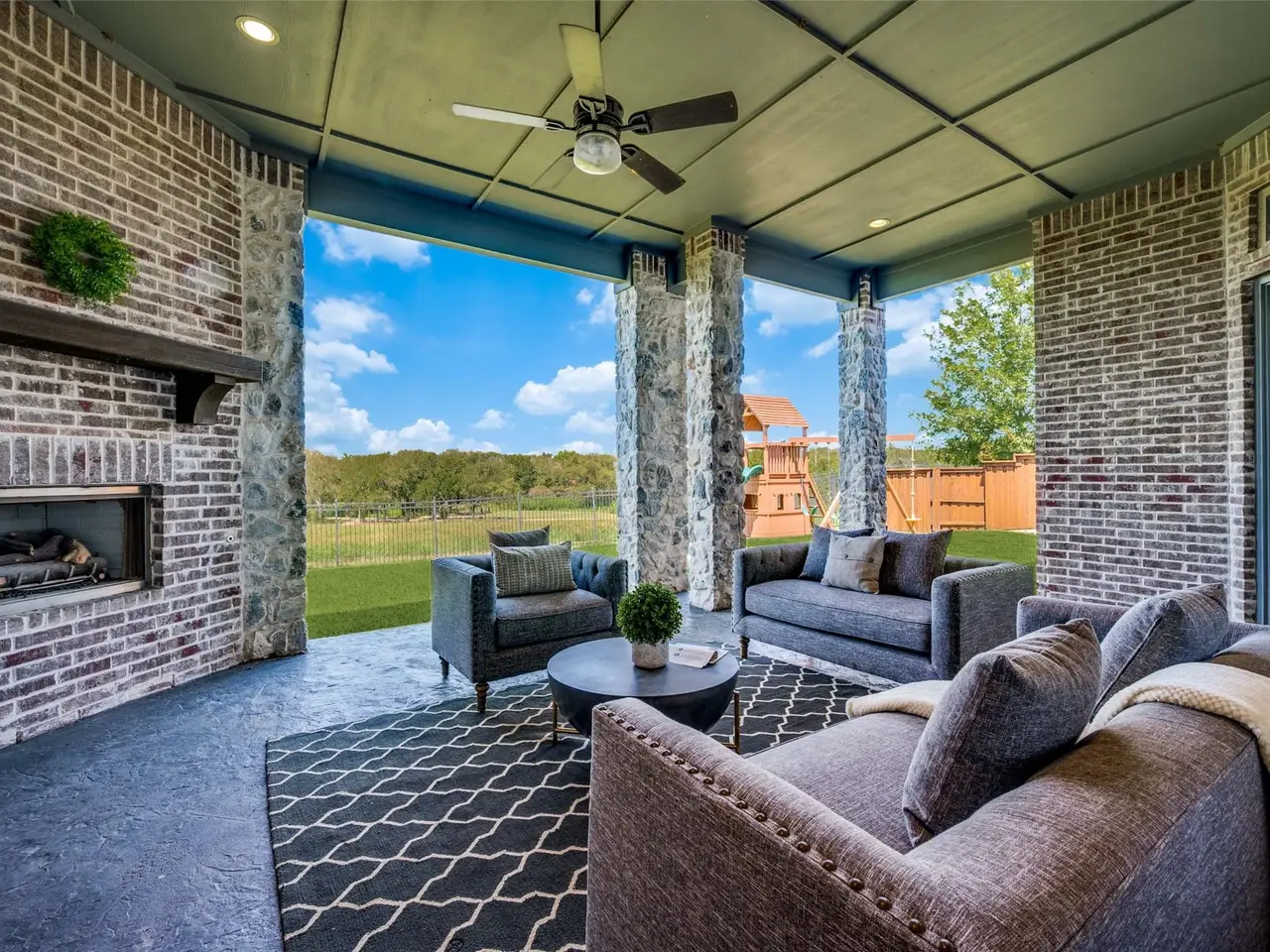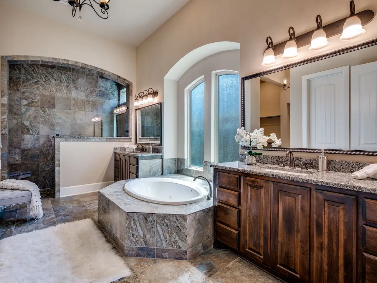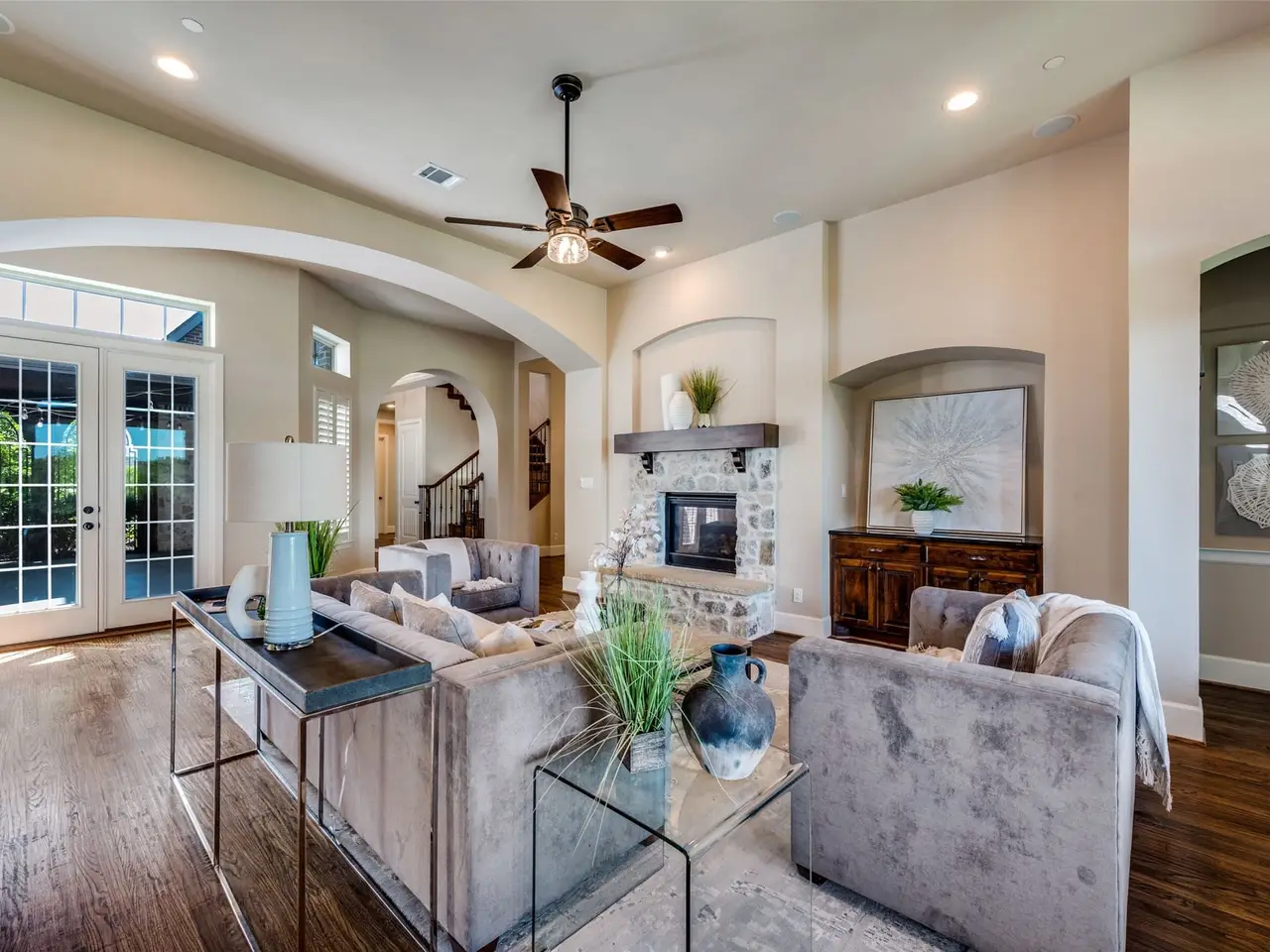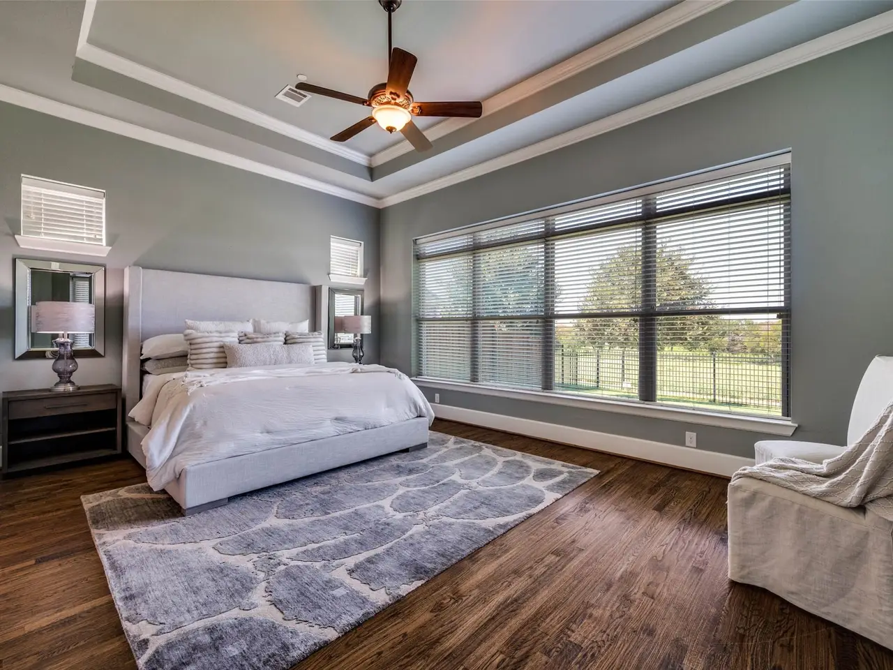 Stunning home by the lake at the end of a tranquil cul-de-sac in sought after Windsong Ranch. This distinguished residence backs to lush greenbelt visible from the expansive back windows and large covered veranda which features charming brick fireplace perfect for relaxation or relax in the beautiful front courtyard enclosed by elegant iron gate. Inside the chef’s kitchen is a true centerpiece, with a breakfast bar that opens seamlessly to the family room and a spacious adjoining breakfast area complete with a coffee bar, perfect for casual gatherings or morning routines. The luxurious owner's retreat provides a spa like bath with walk in shower, jetted tub and two walk-in closets. A secondary bedroom on the main floor provides comfortable accommodation for guests, while a private study with French doors offers a quiet workspace. Upstairs you will find generously sized bedrooms with en-suite baths, a dedicated kids retreat and a large game-media room. Home features front and back staircases for convenience. Additional highlights include an oversized garage designed to accommodate a average 4x8 sized golf cart. This residence perfectly blends comfort, elegance and functionality an entertainers dream in Windsong Ranch. This amenity-filled community is renowned for its crystal-clear Lagoon, pickleball courts, and jogging trails.