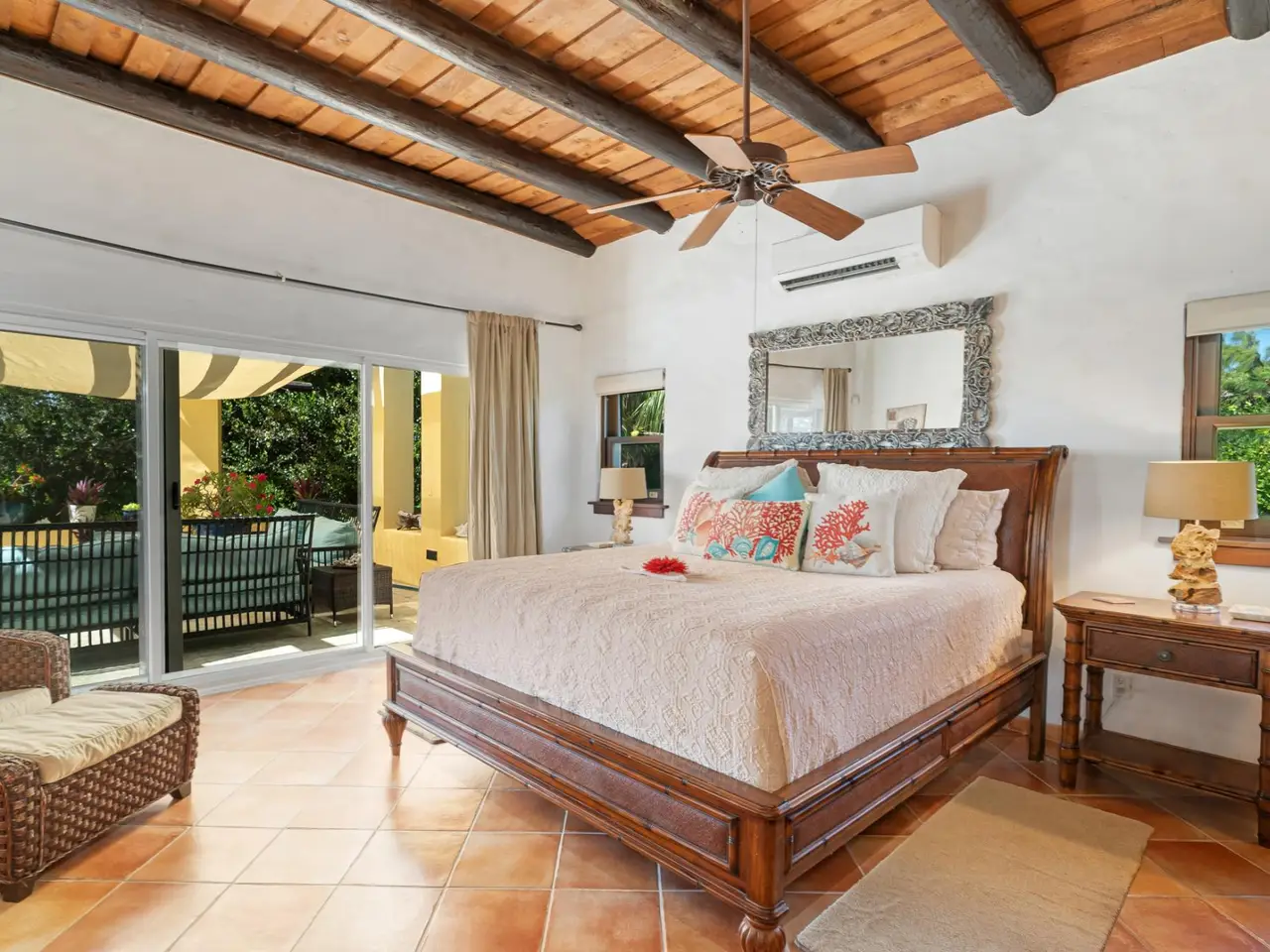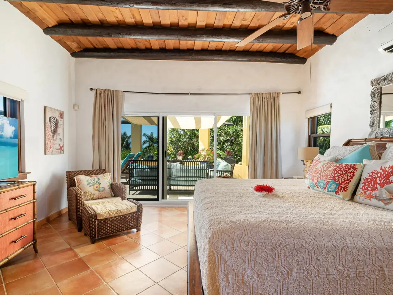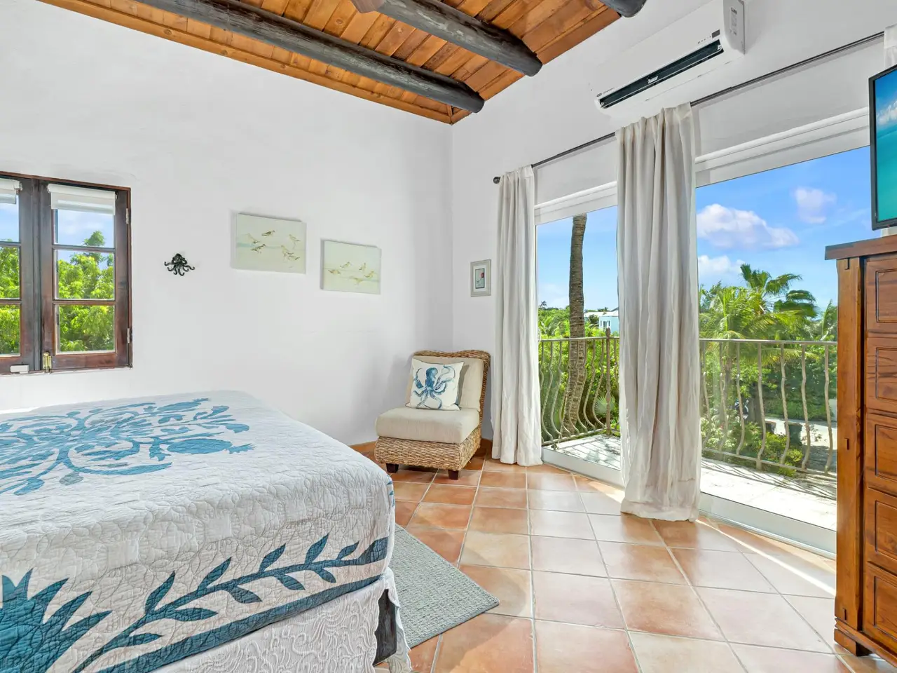Villa Jasmine is an enchanting 4-bedroom home nestled on an elevated hillside in Taylor Bay, just steps from Taylor Bay Beach and the community's private-access tennis courts. Situated on 0.86 acres, this villa is perfectly positioned to enjoy cool trade winds year-round. The spacious pool deck and private rooftop terrace provide breathtaking views, making it the ideal spot to savor TCI sunsets. The main floor is designed around the villa's large pool and expansive decks, which feature ample seating and an outdoor dining area. Upon entering from the pool deck, you are welcomed into a spacious dining area that comfortably seats eight adults. Adjacent to the dining space is a fully equipped kitchen, complete with a propane range and stainless-steel appliances. The Master Suite occupies the entire left wing of the villa, offering a king bed, two large closets, a water closet, dual sinks, and a luxurious walk-in shower. On the right side of the kitchen and common area, you’ll find Guest Bedrooms 1 and 2. Each guest room features an en-suite bathroom, a king bed, and large sliding doors that fill the space with natural light. The 4th bedroom is a self-contained suite located on the villa's lower level. This private retreat includes a king bed, an en-suite bathroom, and its own entrance for ultimate privacy. Contact Claudius@GraceBayRealty.com to schedule a tour of Villa Jasmine.