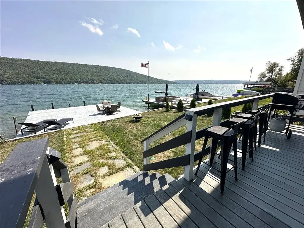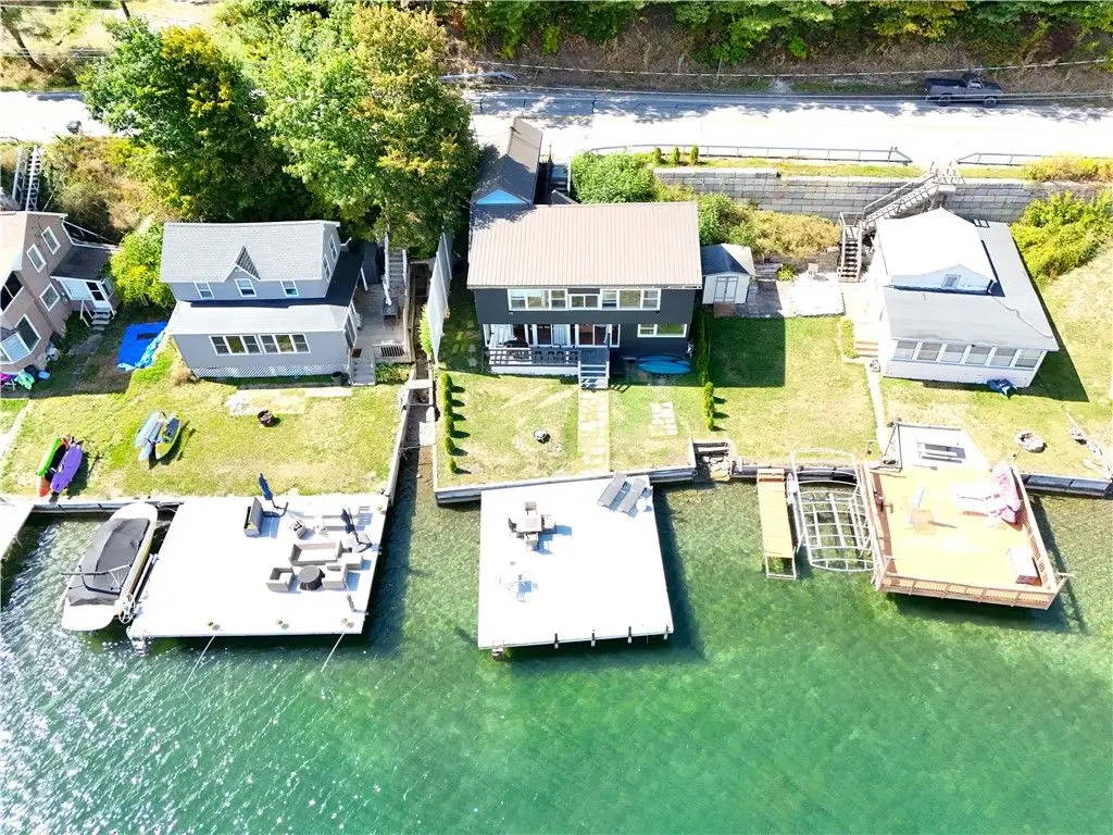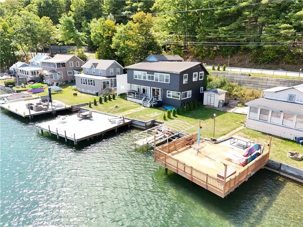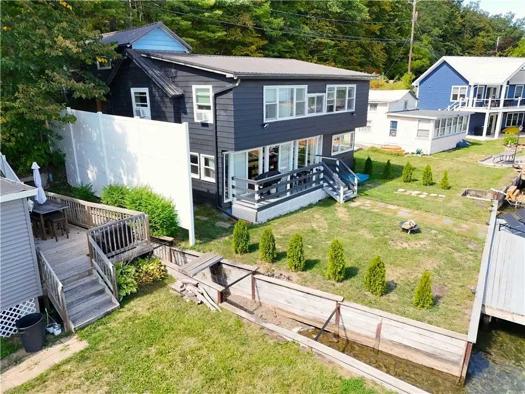 Experience the best of Keuka Lake living in this beautifully upgraded year-round residence with panoramic lake views. Thoughtfully improved over the past year, the home offers three bedrooms plus a versatile office/bonus room, two full bathrooms, and an open floor plan designed to maximize light and lakefront views.The main floor features a spacious living and dining area with panoramic lake views through floor-to-ceiling windows. The kitchen, once closed off, has been reconfigured into a more open, eat-in style layoutC/B?B=creating a brighter, more welcoming space. Throughout the home, brand-new drywall, ceilings, and fresh paint replace the dated finishes, giving every room a refreshed feel. Upstairs, a newly added full bathroom with spa-like finishes near the bedrooms enhances comfort and convenience. Downstairs, a remodeled walk-in shower and a newly added laundry unit add everyday functionality.Exterior upgrades include fresh paint, new wooden entry stairs, updated landscaping with tree plantings, and a stabilized shed with added structural posts. A permanent dock (2009), level lakefront, and fire pit make for the ideal summer retreat and year-round enjoyment.Whether as a full-time residence, vacation home, or proven rental, this property offers flexibility and lasting value. Ideally located between Penn Yan and Hammondsport, you're just minutes from the region's award-winning wineries, breweries, and dining.