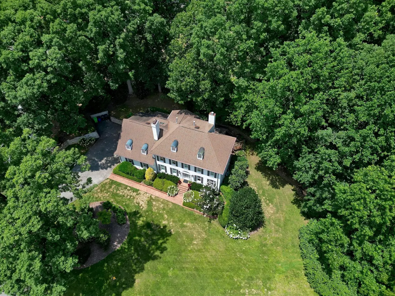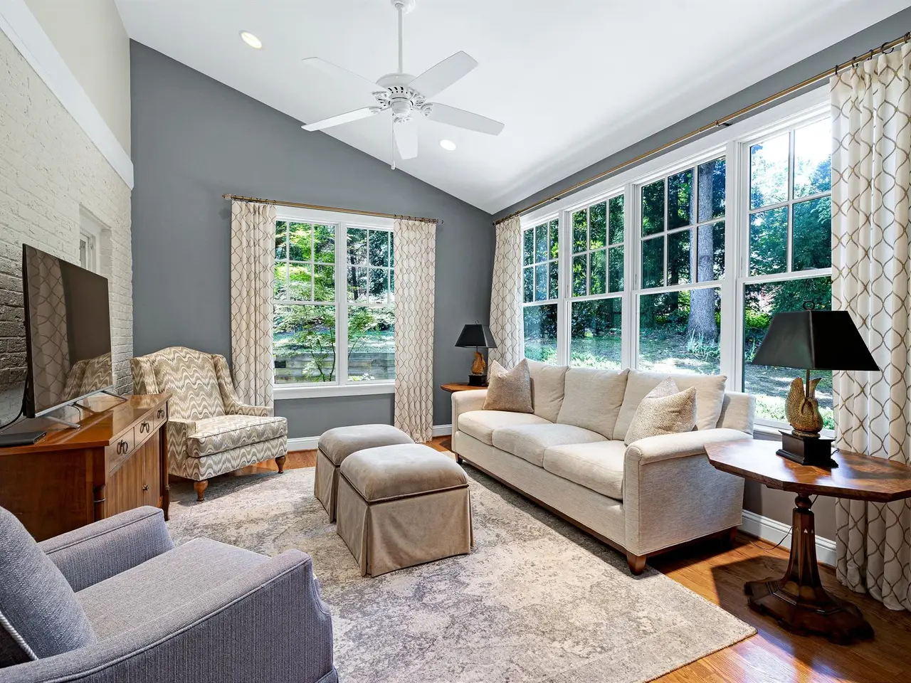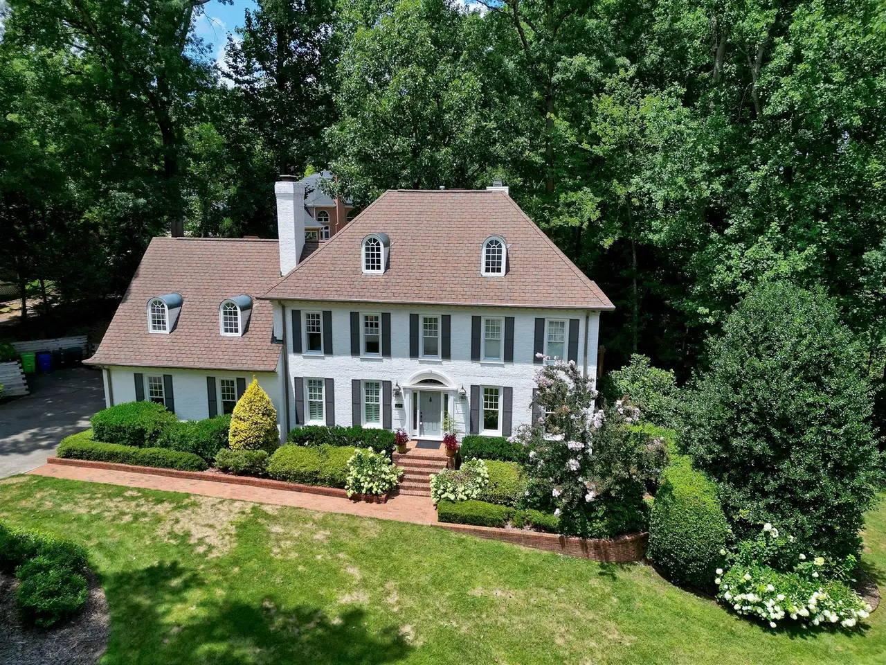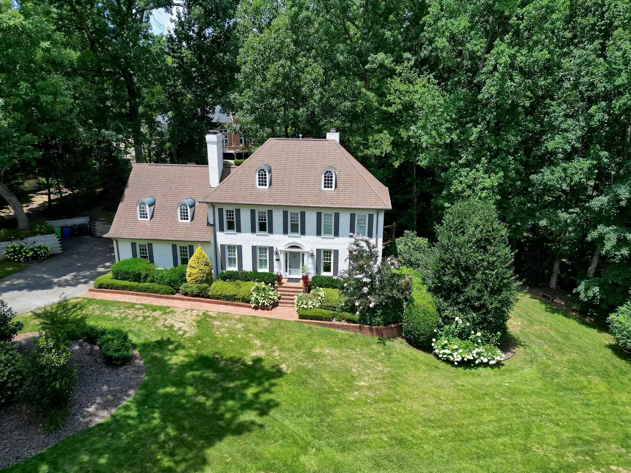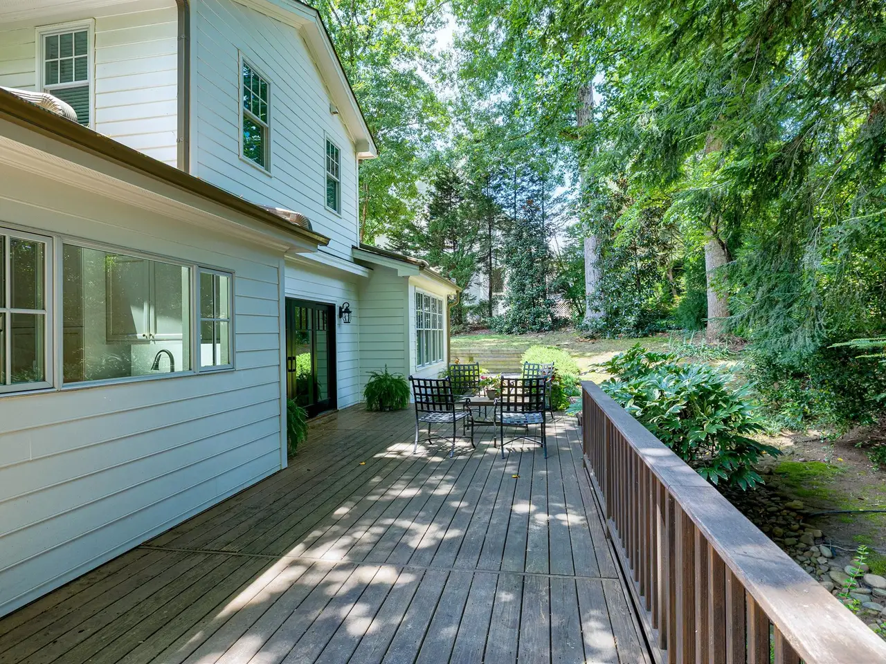 Set on a peaceful cul-de-sac with no through traffic, this 4-bed, 4-bath home offers nearly 4,300 sq ft of beautifully updated living. A major two-story rear addition expands the living space with a renovated kitchen and double sunrooms. All new Pella windows, new skylights, updated HVAC systems on every level, and major plumbing replacement mean the big projects are done. Quiet location, quality finishes, and a strong price point make this one of the best values in North Raleigh.Light-filled interiors begin with a welcoming foyer and continue into a versatile living/billiards room with built-ins and a gas fireplace. The formal dining room features a beamed ceiling and space to host a crowd. The kitchen includes a center island, gas cooktop, wet bar, granite counters, new skylights, and a sunny breakfast banquette. Two adjoining sunrooms create relaxed spaces for reading, entertaining, or enjoying the quiet setting. The primary suite offers a fireplace, double closets, and a newly renovated bath. Upstairs are two additional bedrooms, a full bath, and a spacious bonus room with rear-stair access. The third floor provides a private guest suite with full bath. Outside, a two-level deck overlooks a landscaped yard with magnolias, hydrangeas, and towering oaks, backing to a creek and forest.
