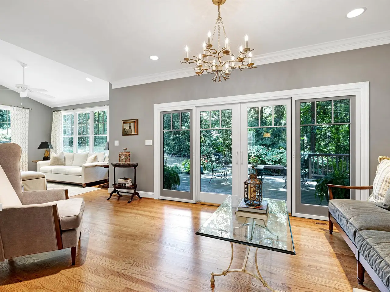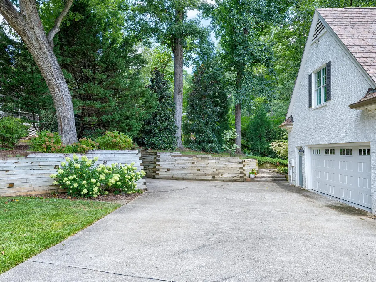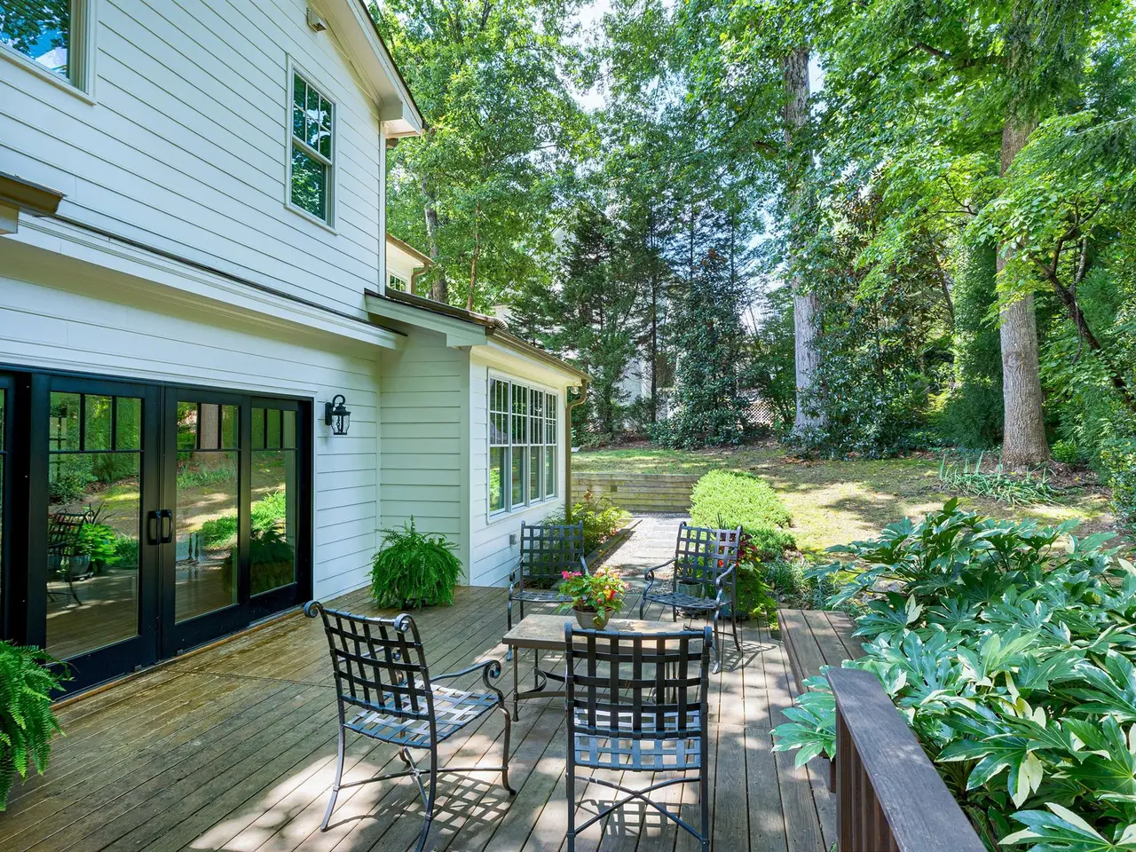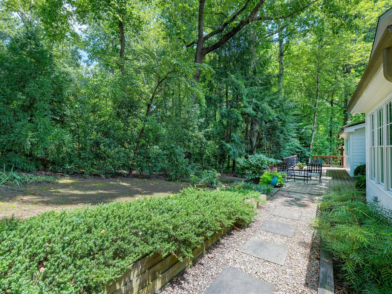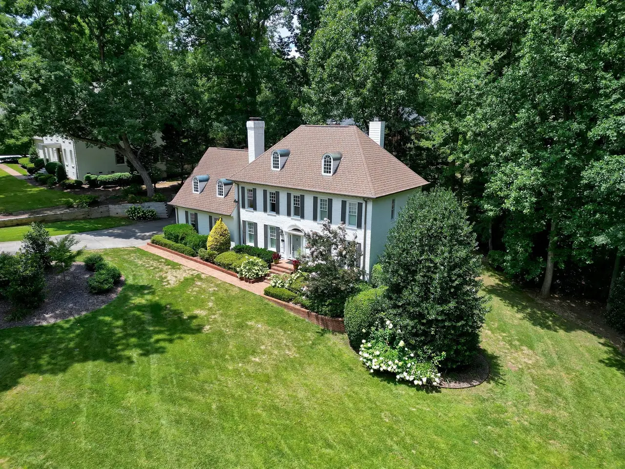 Set on a peaceful cul-de-sac with no through traffic, this 4-bed, 4-bath home offers nearly 4,300 sq ft of beautifully updated living. A major two-story rear addition expands the living space with a renovated kitchen and double sunrooms. All new Pella windows, new skylights, updated HVAC systems on every level, and major plumbing replacement mean the big projects are done. Quiet location, quality finishes, and a strong price point make this one of the best values in North Raleigh.Light-filled interiors begin with a welcoming foyer and continue into a versatile living/billiards room with built-ins and a gas fireplace. The formal dining room features a beamed ceiling and space to host a crowd. The kitchen includes a center island, gas cooktop, wet bar, granite counters, new skylights, and a sunny breakfast banquette. Two adjoining sunrooms create relaxed spaces for reading, entertaining, or enjoying the quiet setting. The primary suite offers a fireplace, double closets, and a newly renovated bath. Upstairs are two additional bedrooms, a full bath, and a spacious bonus room with rear-stair access. The third floor provides a private guest suite with full bath. Outside, a two-level deck overlooks a landscaped yard with magnolias, hydrangeas, and towering oaks, backing to a creek and forest.