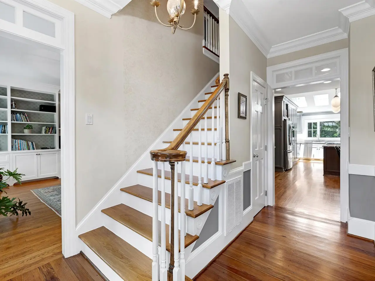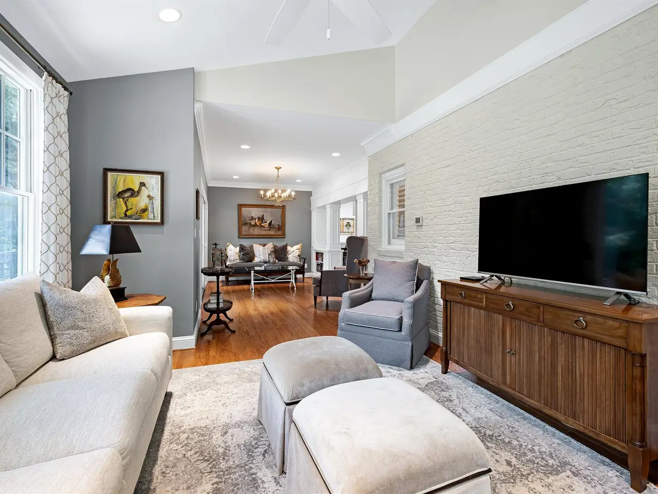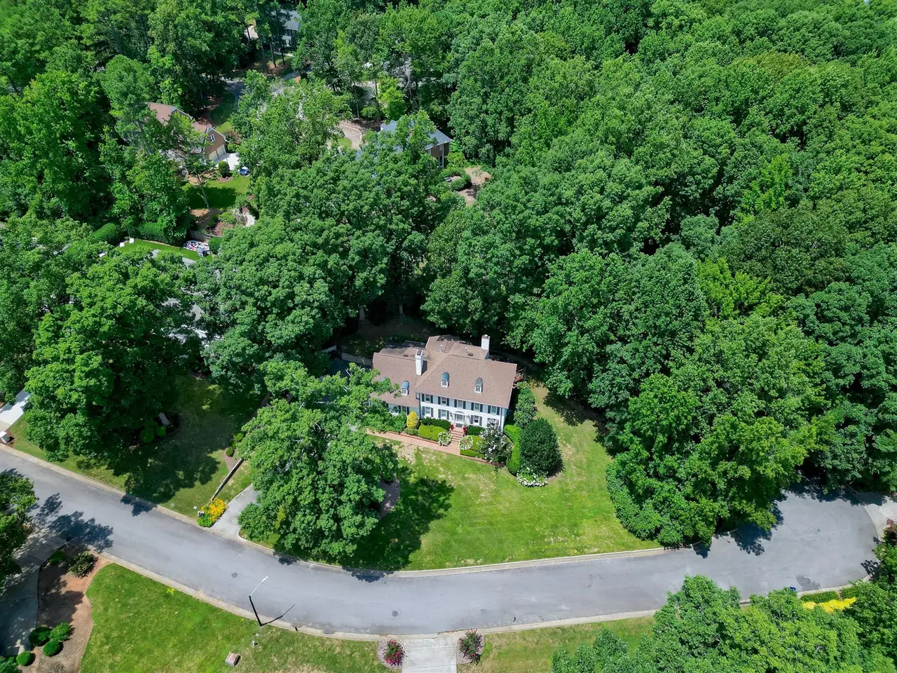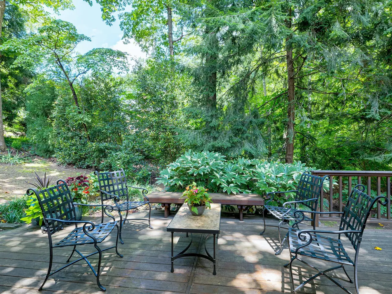 Set on a peaceful cul-de-sac with no through traffic, this 4-bed, 4-bath home offers nearly 4,300 sq ft of beautifully updated living. A major two-story rear addition expands the living space with a renovated kitchen and double sunrooms. All new Pella windows, new skylights, updated HVAC systems on every level, and major plumbing replacement mean the big projects are done. Quiet location, quality finishes, and a strong price point make this one of the best values in North Raleigh.Light-filled interiors begin with a welcoming foyer and continue into a versatile living/billiards room with built-ins and a gas fireplace. The formal dining room features a beamed ceiling and space to host a crowd. The kitchen includes a center island, gas cooktop, wet bar, granite counters, new skylights, and a sunny breakfast banquette. Two adjoining sunrooms create relaxed spaces for reading, entertaining, or enjoying the quiet setting. The primary suite offers a fireplace, double closets, and a newly renovated bath. Upstairs are two additional bedrooms, a full bath, and a spacious bonus room with rear-stair access. The third floor provides a private guest suite with full bath. Outside, a two-level deck overlooks a landscaped yard with magnolias, hydrangeas, and towering oaks, backing to a creek and forest.