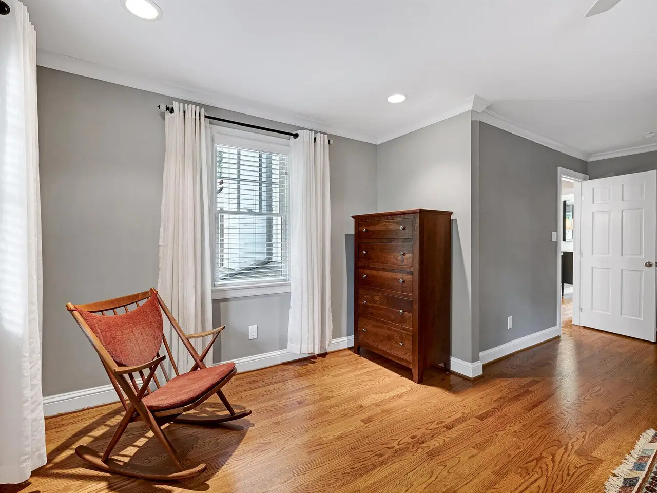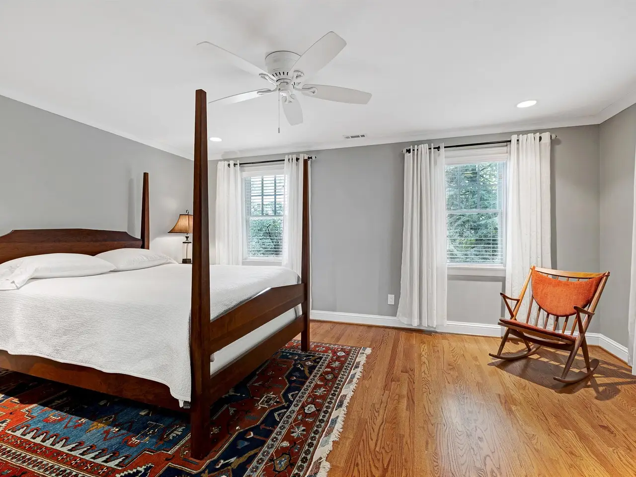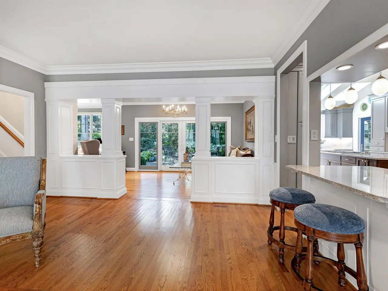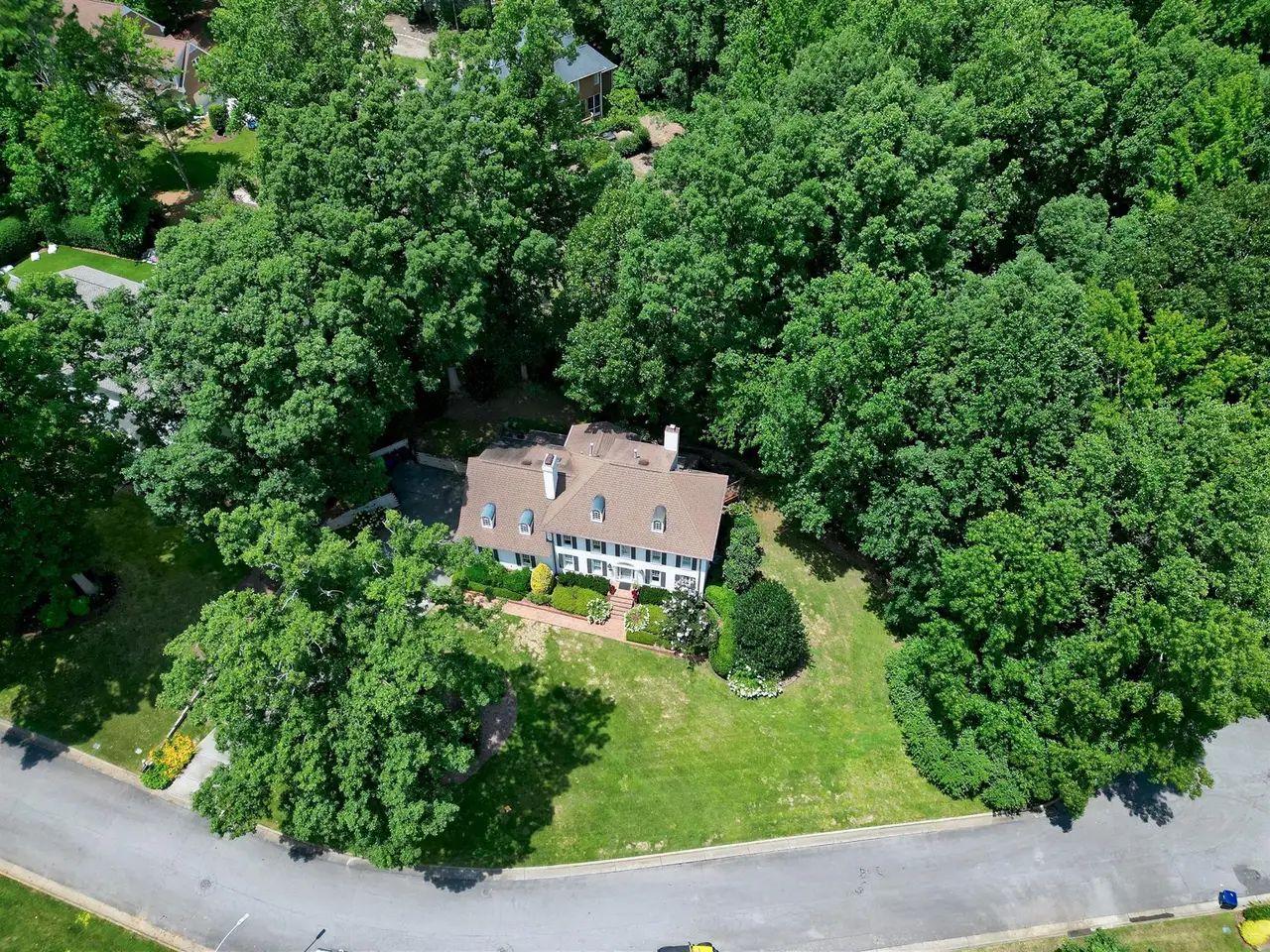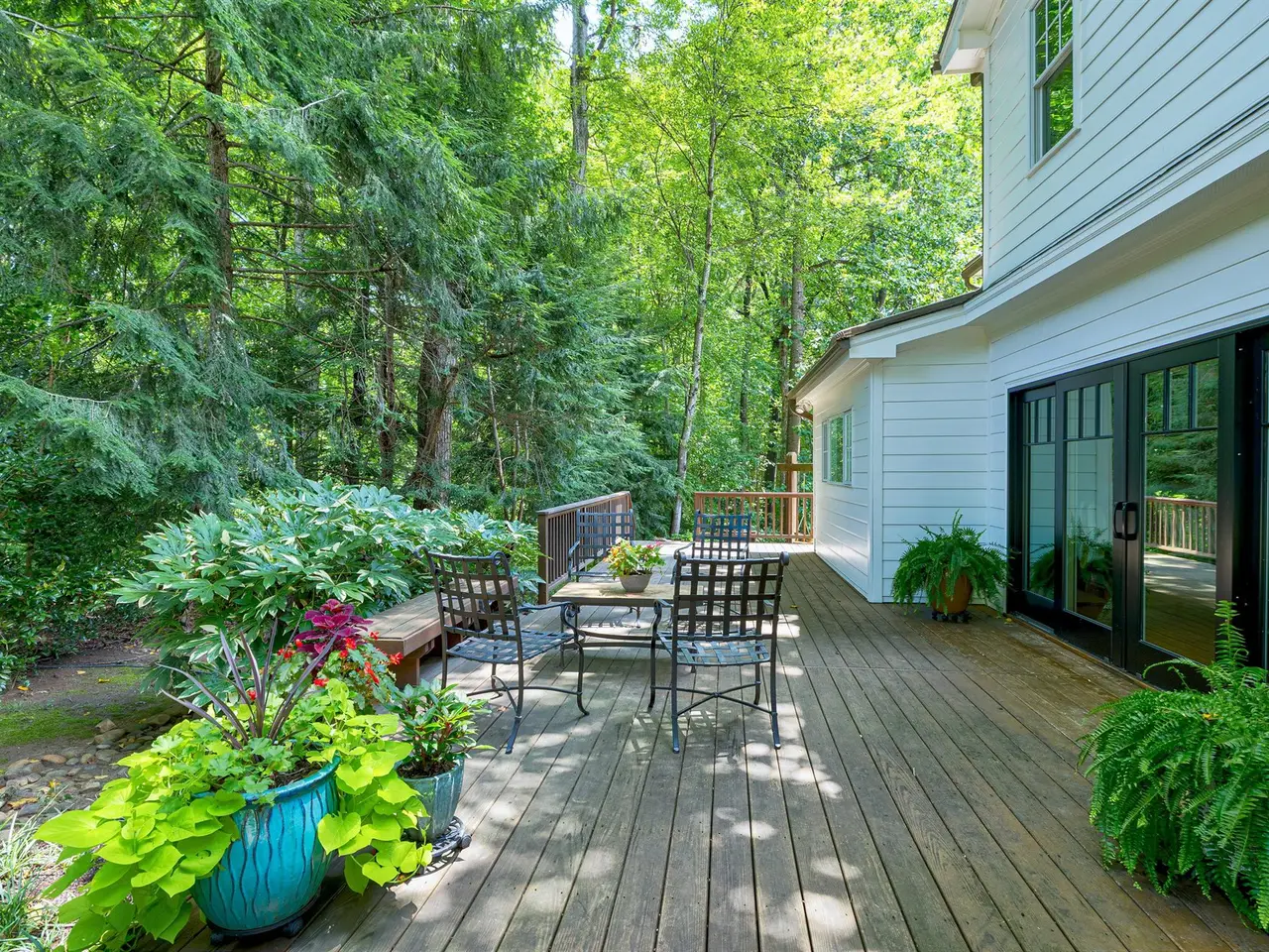Set on a peaceful cul-de-sac with no through traffic, this 4-bed, 4-bath home offers nearly 4,300 sq ft of beautifully updated living. A major two-story rear addition expands the living space with a renovated kitchen and double sunrooms. All new Pella windows, new skylights, updated HVAC systems on every level, and major plumbing replacement mean the big projects are done. Quiet location, quality finishes, and a strong price point make this one of the best values in North Raleigh.Light-filled interiors begin with a welcoming foyer and continue into a versatile living/billiards room with built-ins and a gas fireplace. The formal dining room features a beamed ceiling and space to host a crowd. The kitchen includes a center island, gas cooktop, wet bar, granite counters, new skylights, and a sunny breakfast banquette. Two adjoining sunrooms create relaxed spaces for reading, entertaining, or enjoying the quiet setting. The primary suite offers a fireplace, double closets, and a newly renovated bath. Upstairs are two additional bedrooms, a full bath, and a spacious bonus room with rear-stair access. The third floor provides a private guest suite with full bath. Outside, a two-level deck overlooks a landscaped yard with magnolias, hydrangeas, and towering oaks, backing to a creek and forest.