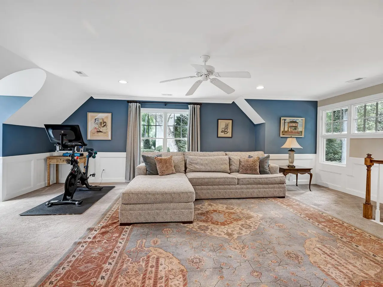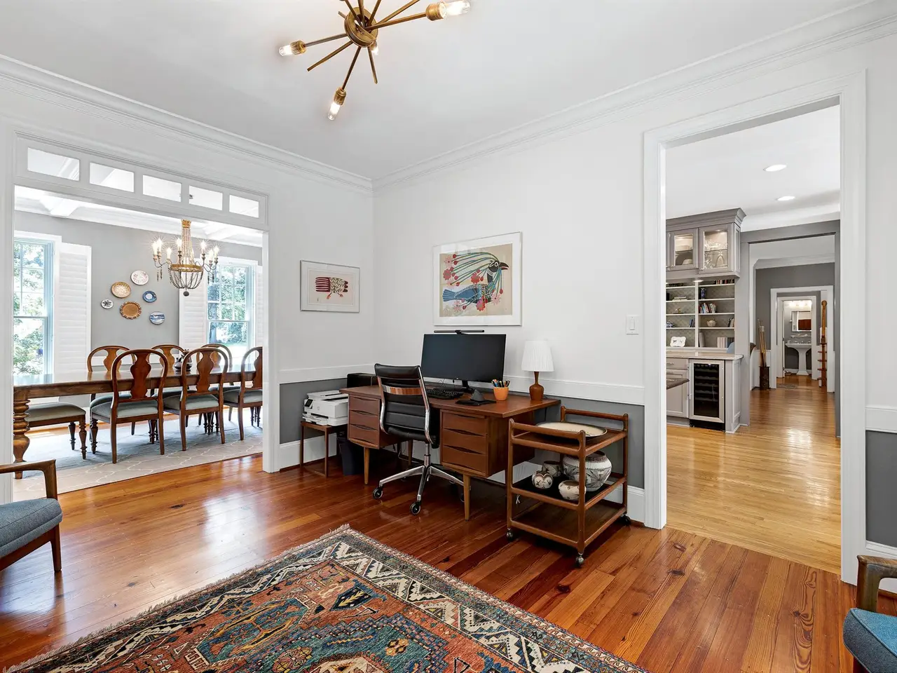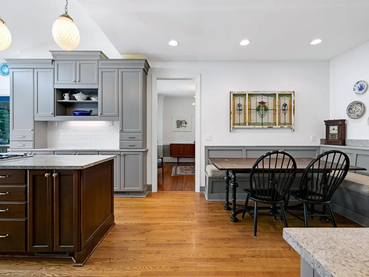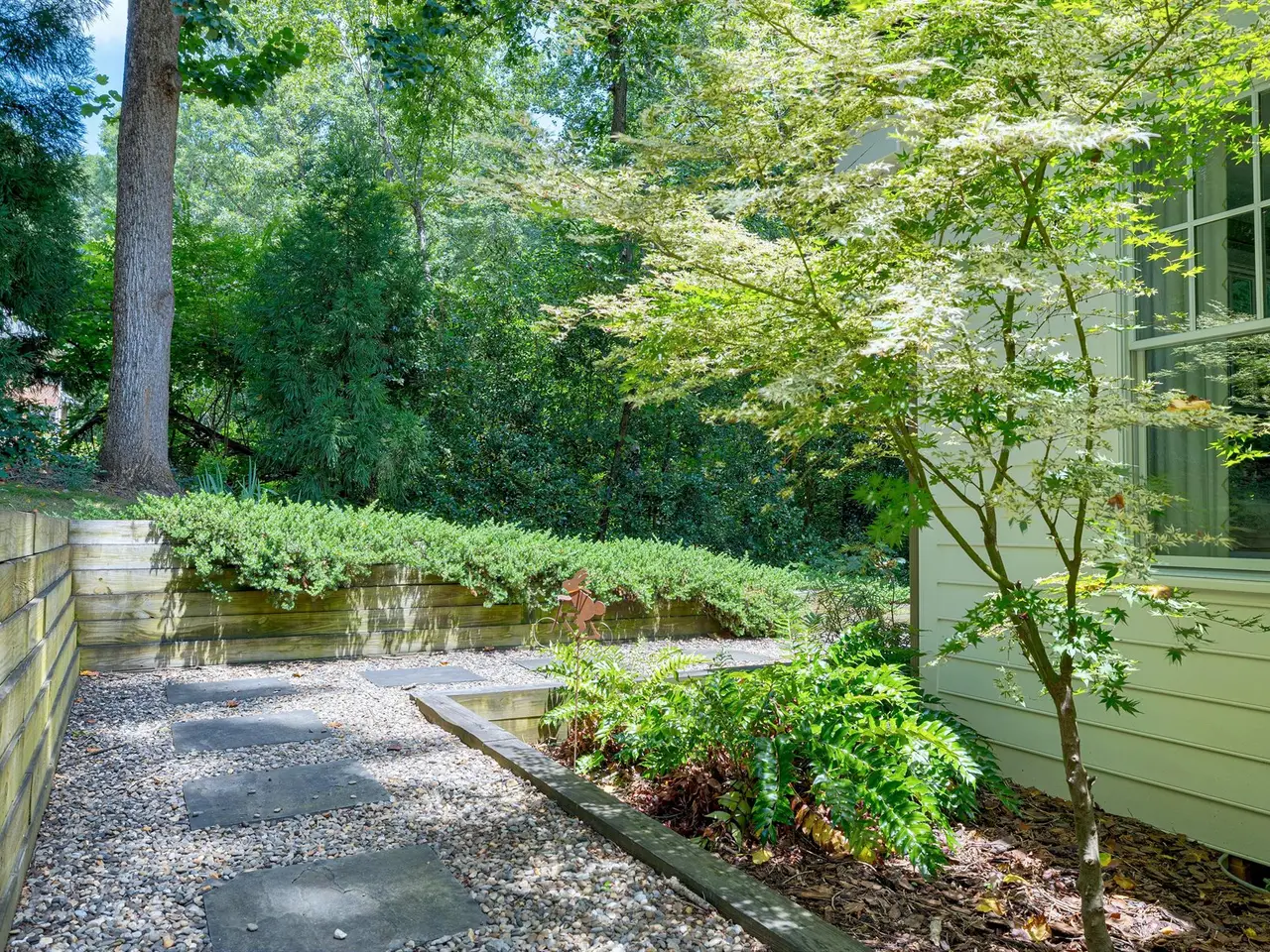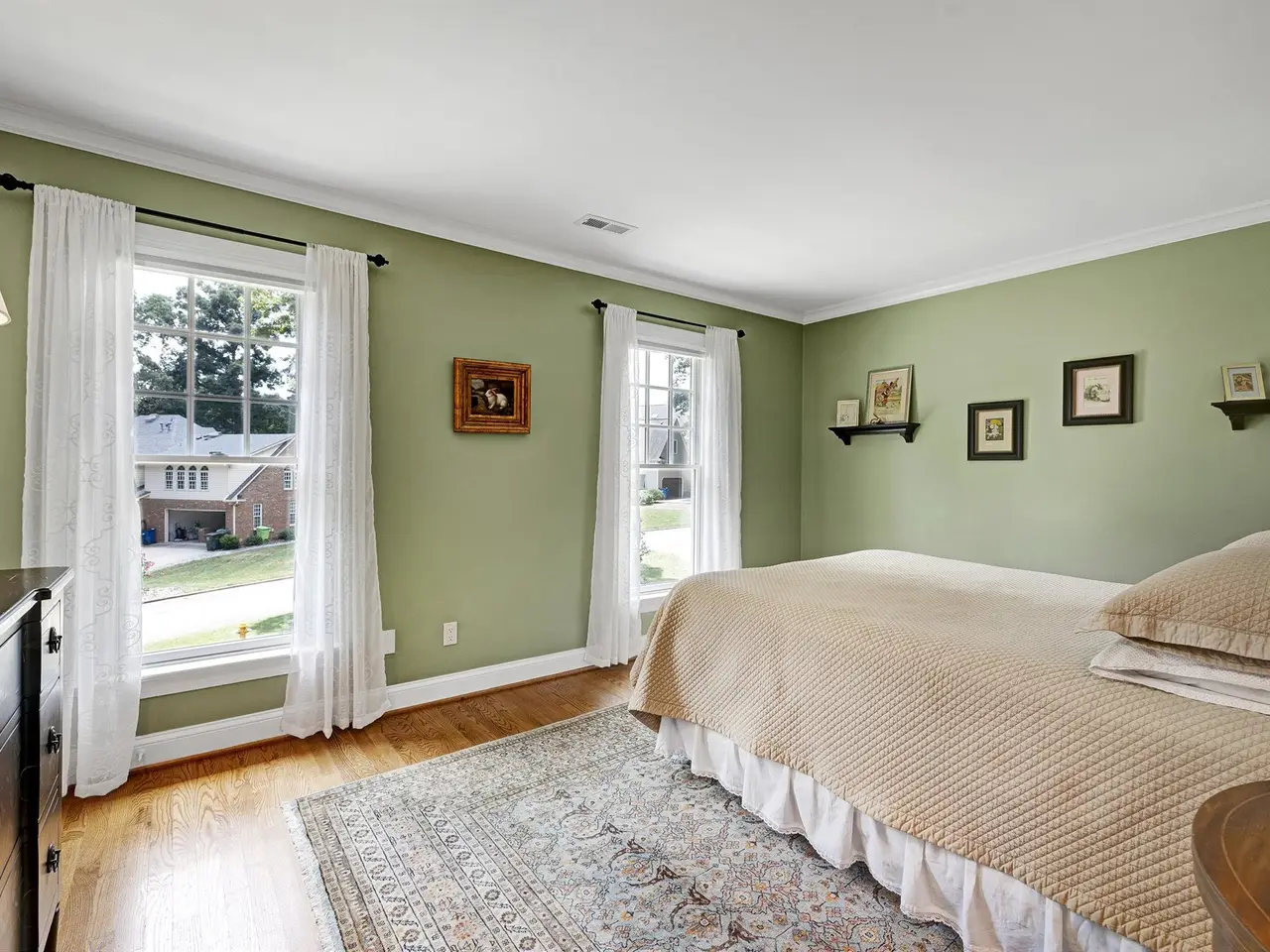 Set on a peaceful cul-de-sac with no through traffic, this 4-bed, 4-bath home offers nearly 4,300 sq ft of beautifully updated living. A major two-story rear addition expands the living space with a renovated kitchen and double sunrooms. All new Pella windows, new skylights, updated HVAC systems on every level, and major plumbing replacement mean the big projects are done. Quiet location, quality finishes, and a strong price point make this one of the best values in North Raleigh.Light-filled interiors begin with a welcoming foyer and continue into a versatile living/billiards room with built-ins and a gas fireplace. The formal dining room features a beamed ceiling and space to host a crowd. The kitchen includes a center island, gas cooktop, wet bar, granite counters, new skylights, and a sunny breakfast banquette. Two adjoining sunrooms create relaxed spaces for reading, entertaining, or enjoying the quiet setting. The primary suite offers a fireplace, double closets, and a newly renovated bath. Upstairs are two additional bedrooms, a full bath, and a spacious bonus room with rear-stair access. The third floor provides a private guest suite with full bath. Outside, a two-level deck overlooks a landscaped yard with magnolias, hydrangeas, and towering oaks, backing to a creek and forest.