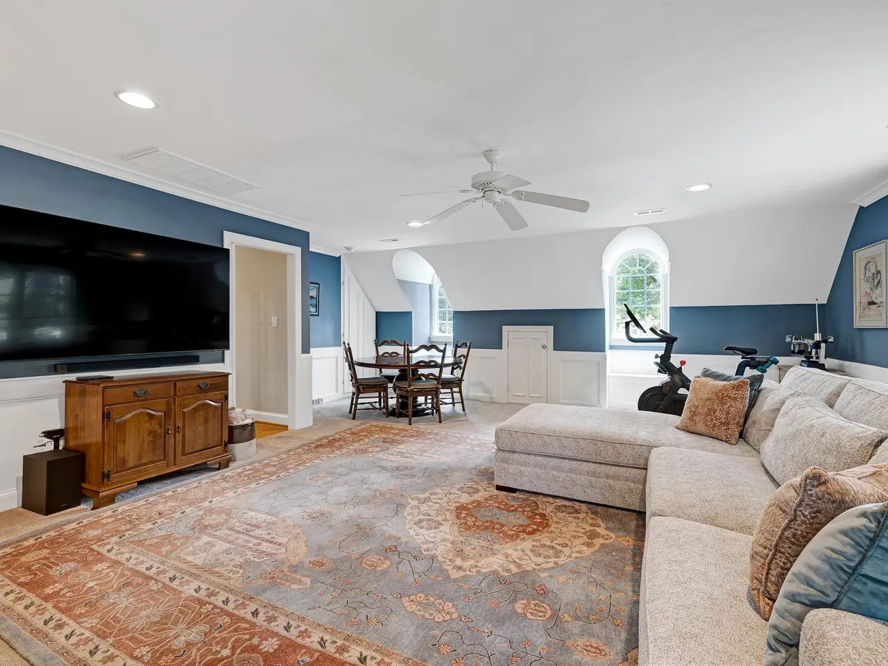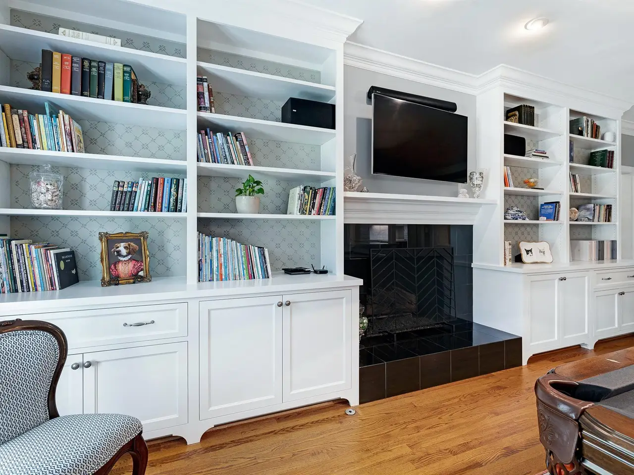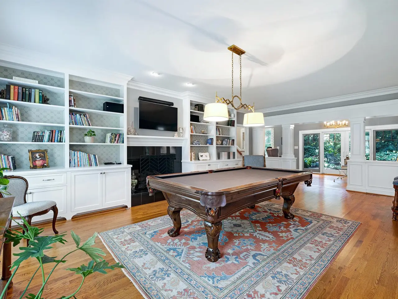 Versatile living/billiards room with built-ins