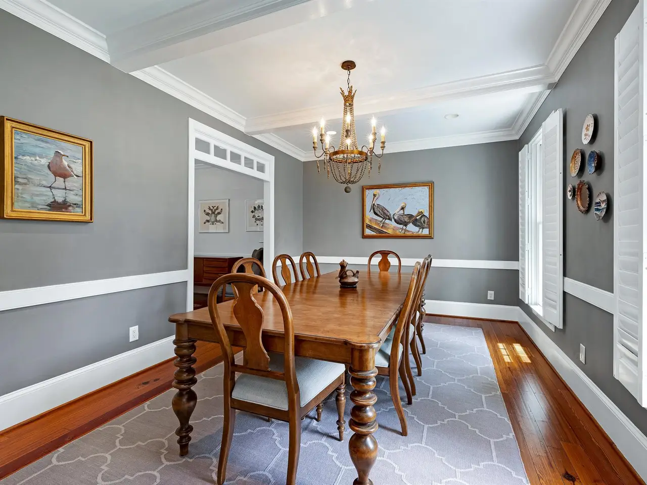 Formal dining room with beamed ceiling