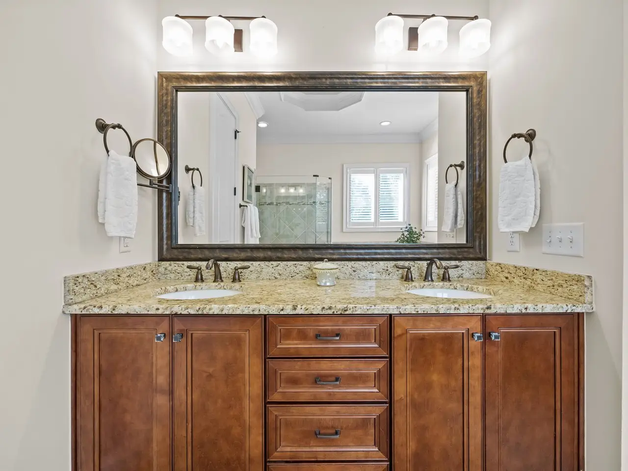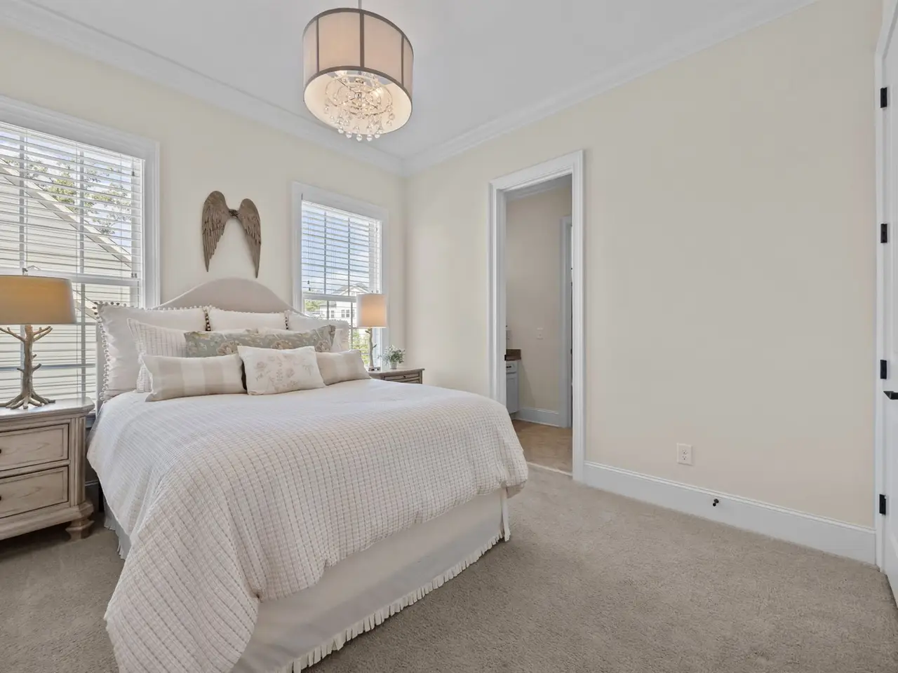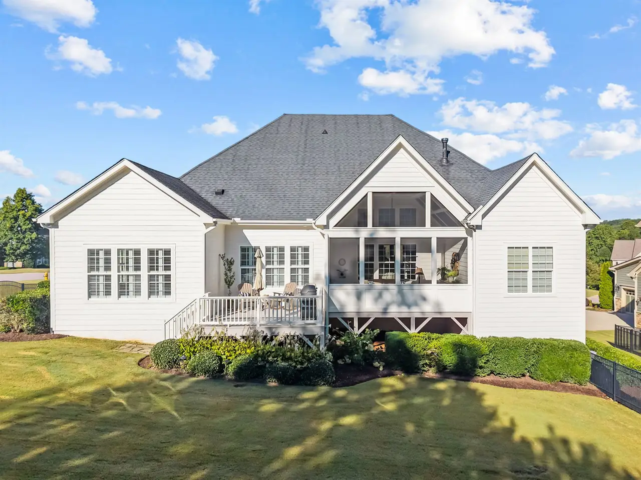 This stunning 1.5-story home lives like a ranch offering the primary suite and two additional bedrooms on the main floor. Perfectly positioned on a beautifully landscaped lot in The Hamptons at Umstead, this property combines elegance, comfort, and thoughtful design. Step into the welcoming foyer flanked by a private home office on one side and a formal dining room on the other. The dedicated office features glass French doors and a full wall of built-ins - ideal for today's work-from-home lifestyle. A tray ceiling and gorgeous millwork accentuate the dining room. The spacious family room impresses with 14-foot ceilings, a wall of windows that flood the space with natural light, and a stunning stacked-stone fireplace with gas logs. The gourmet kitchen is a chef's delight, featuring a gas cooktop, wall oven, large center island, and an expansive walk-in pantry. The primary suite is tucked privately at the rear of the home and offers a generous walk-in closet with custom shelving and direct access to the laundry room. Upstairs you'll find a fourth bedroom, full bath, and a versatile bonus/media room - plus three large unfinished storage areas kept comfortable year-round by spray foam insulation. Enjoy crisp fall evenings on the screened porch with its soaring ceiling or fire up the grill on the deck with a dedicated gas line. Both spaces overlook the fenced, flat backyard surrounded by lush landscaping.Additional highlights include a three-car garage, extensive custom millwork, a sealed crawlspace, and access to community amenities such as a clubhouse and pool. Enjoy easy access to Umstead State Park trails just steps away from your front door. This one is truly a charmer - don't miss it!