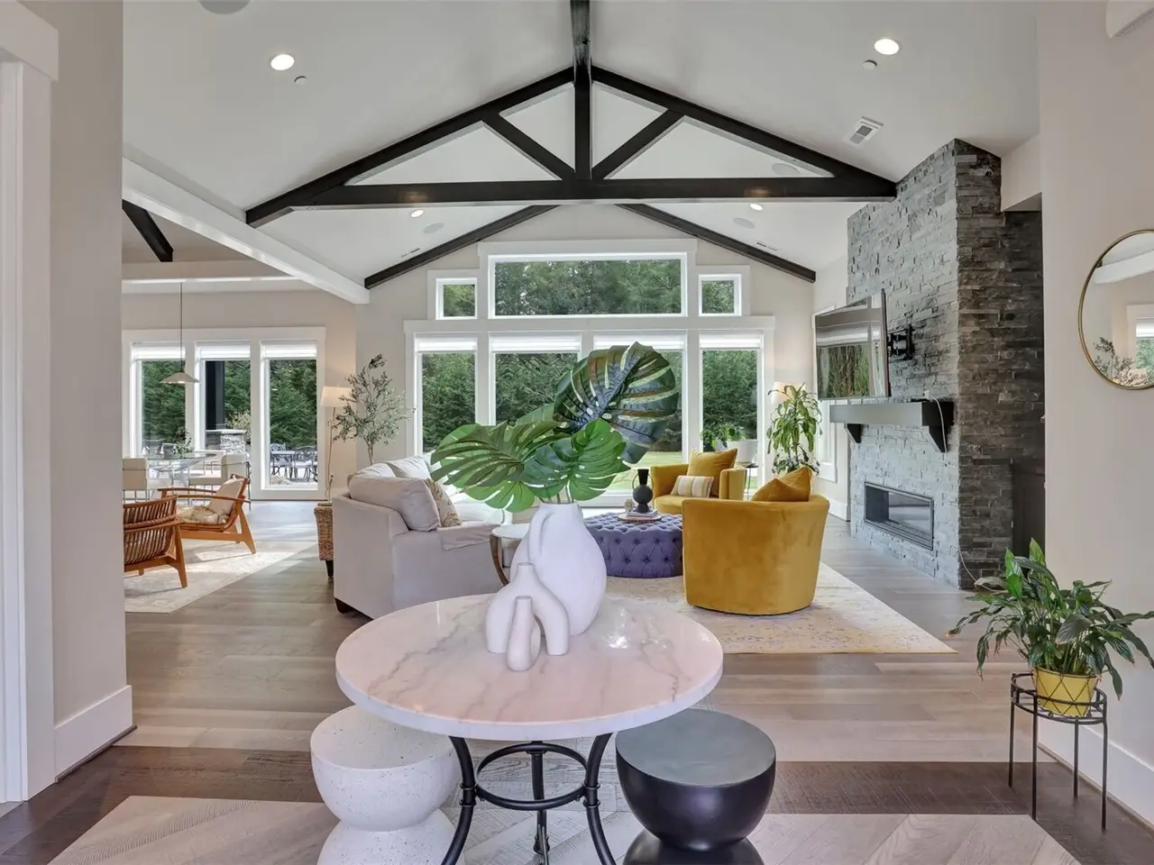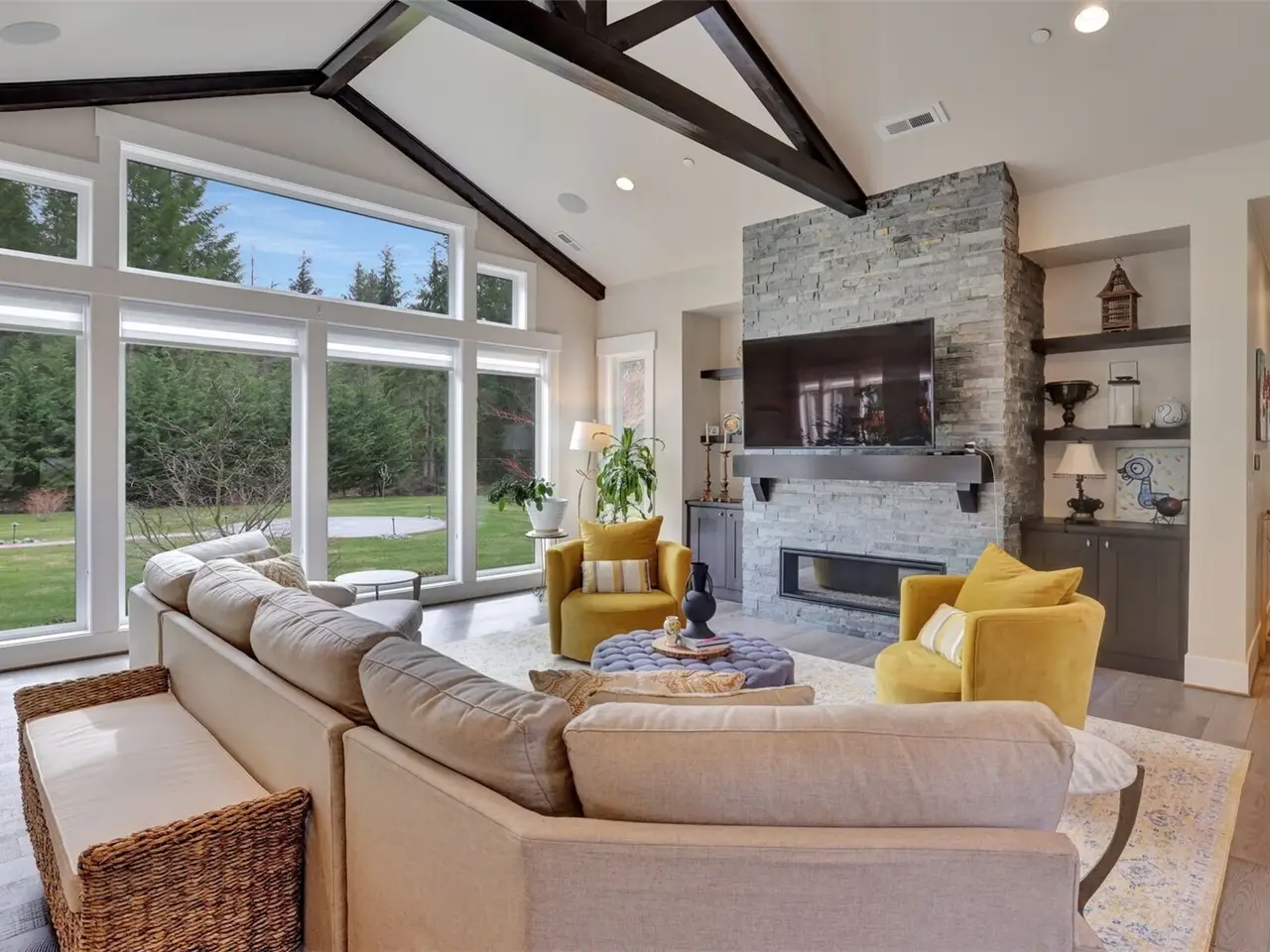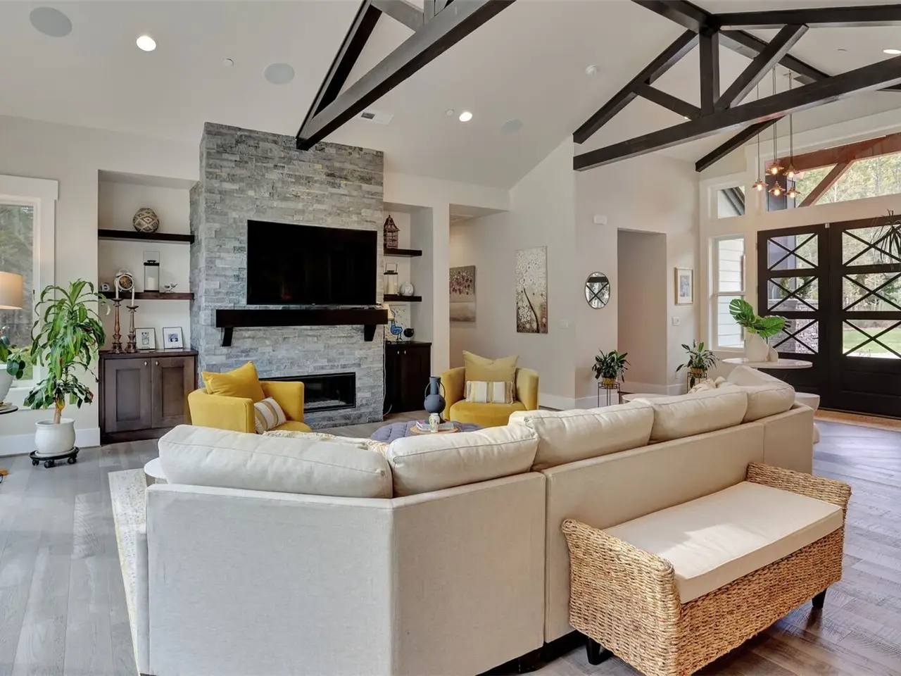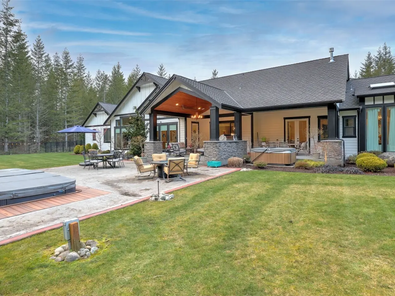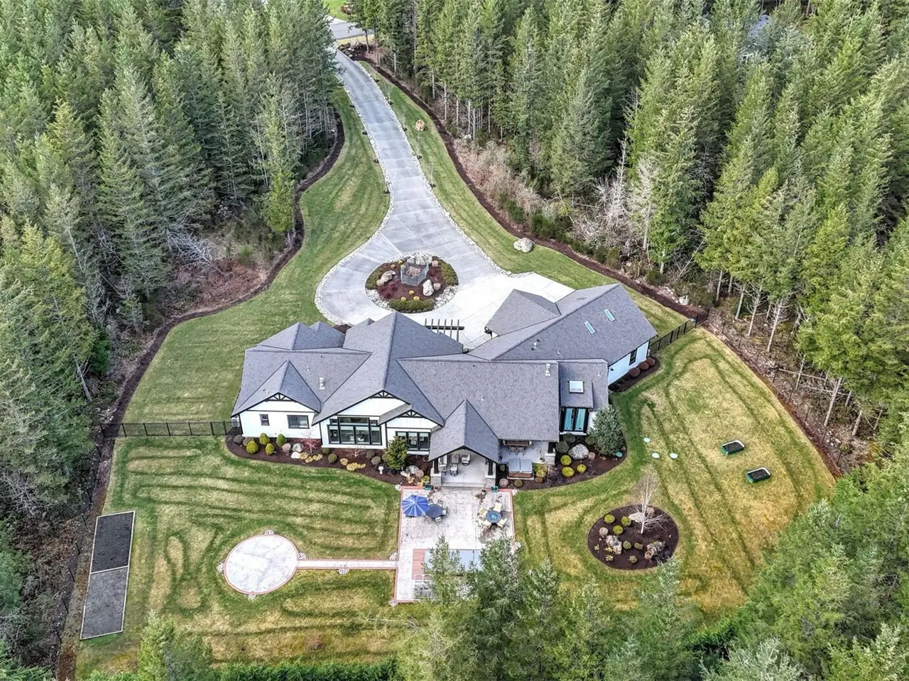 This stunning 4,560 sq.ft. custom-built home on nearly 5 acres offers contemporary elegance at its finest. A grand, surfaced driveway leads you to this magnificent home. Enter to a great room w/ vaulted ceilings, wood beams, & floor-to-ceiling windows showcasing a professionally landscaped backyard oasis. The chef's kitchen boasts Wolf appliances, dual islands, & a SubZero Pro Refrigerator. The formal dining room features a temperature-controlled wine wall. The opulent primary suite offers a fireplace & spa-like ensuite. Additional bedrooms w/ private baths, a flex room, & a spacious rec room above the 5-car garage. Enjoy a swim spa, hot tub, & covered/heated outdoor kitchen. Ideal for those craving privacy, luxury, & top-tier amenities.