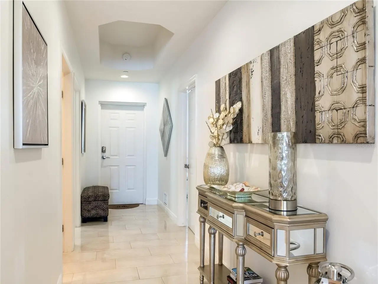 Tray ceilings, designer lighting, and polished tile floors throughout