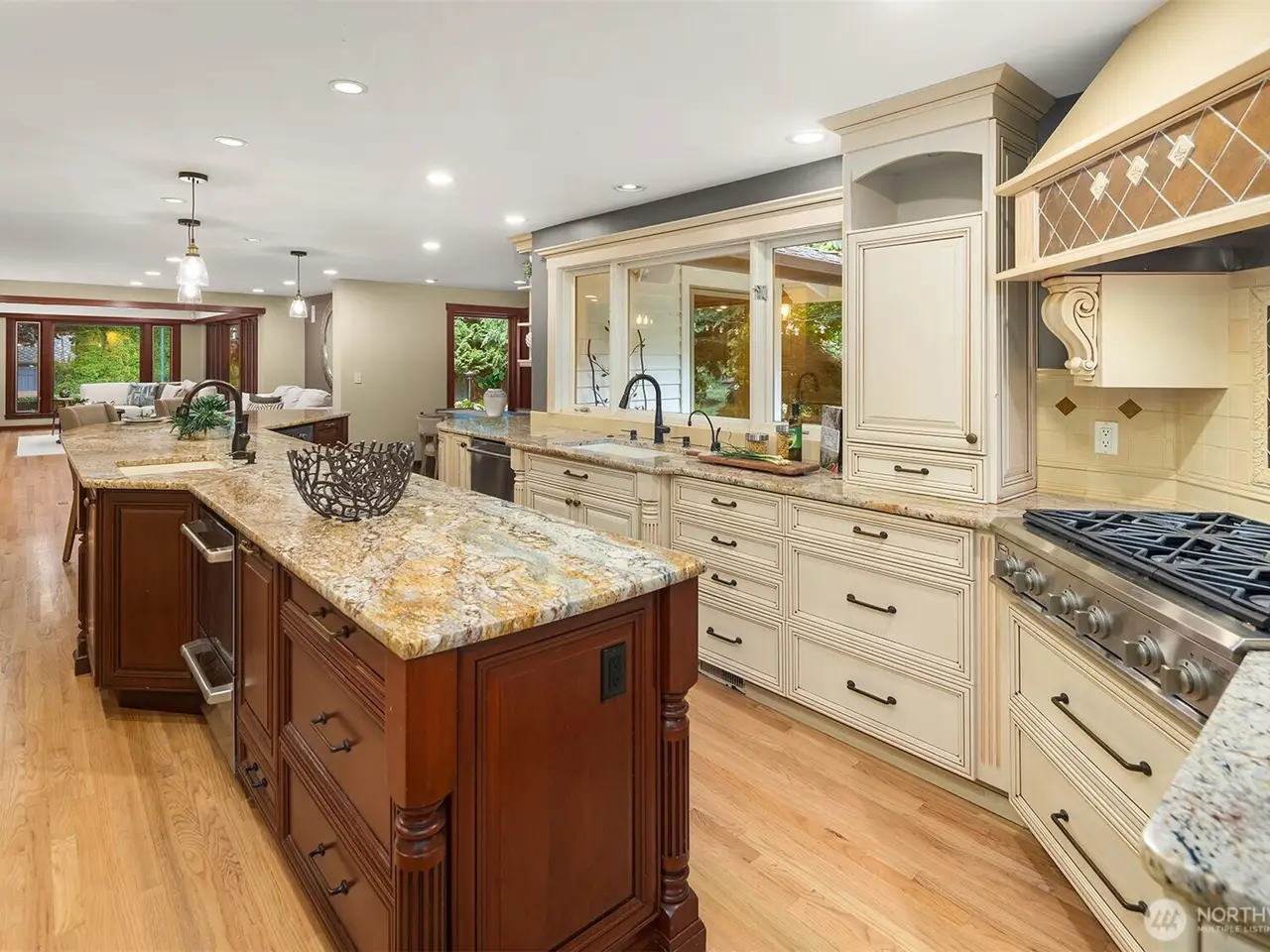 Custom chef's kitchen with double ovens and banquet island