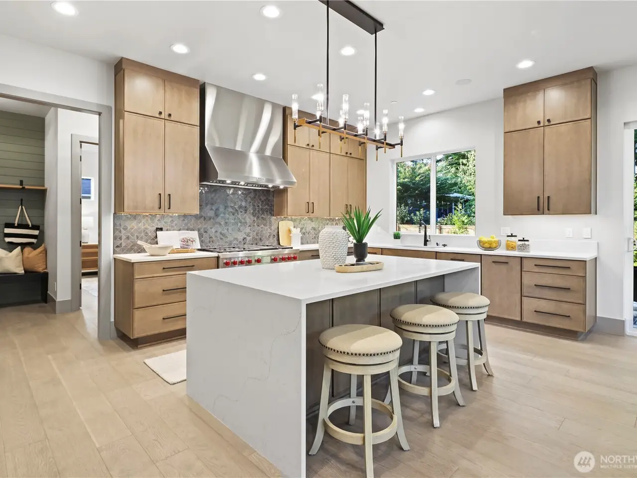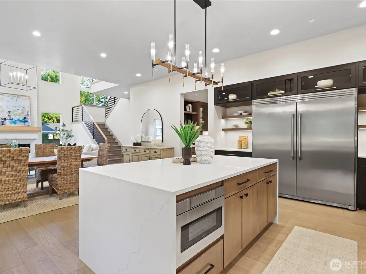 Entertainer's kitchen with quartz waterfall island