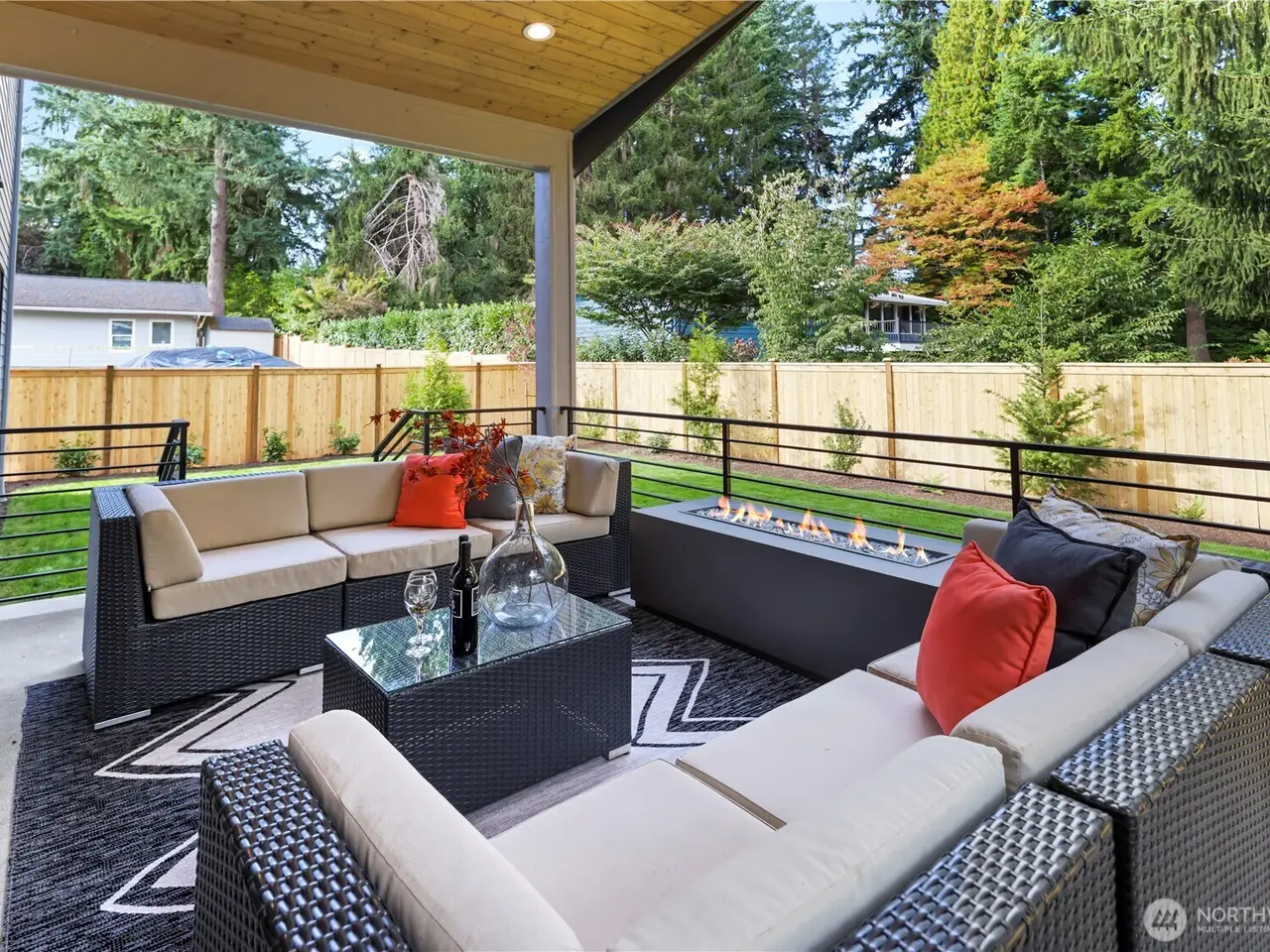 Vaulted outdoor living with gas fire table