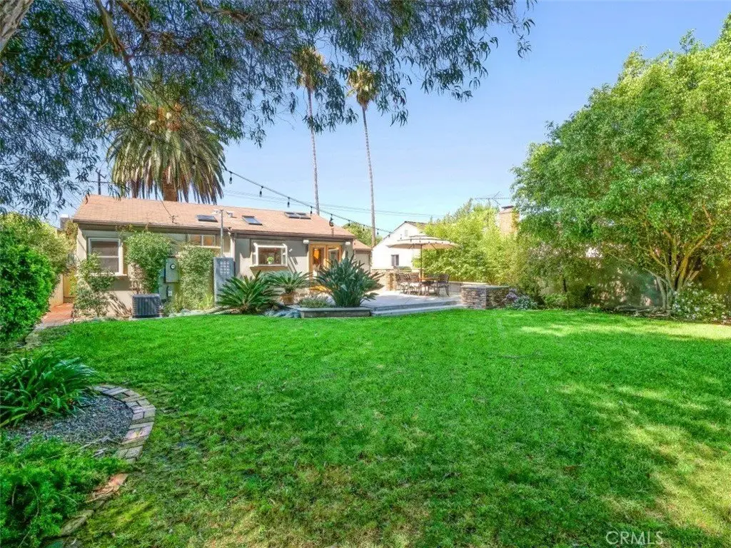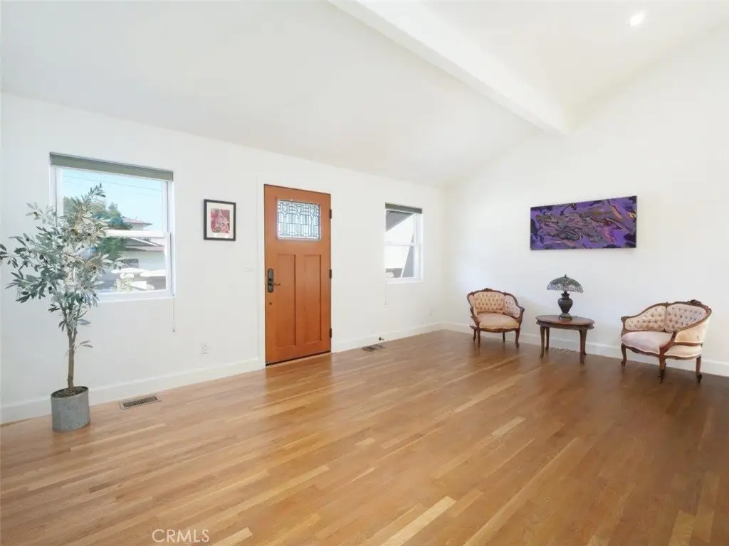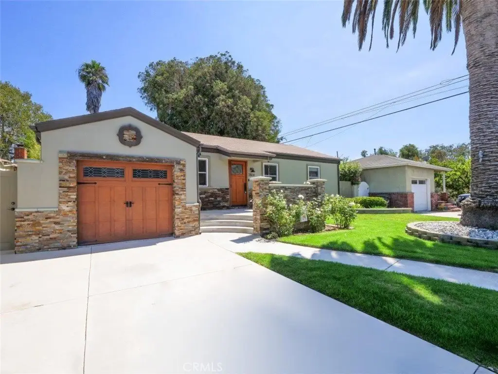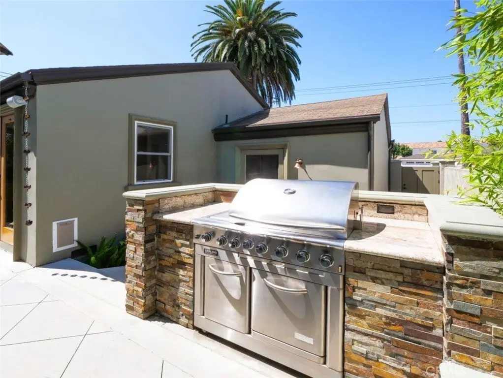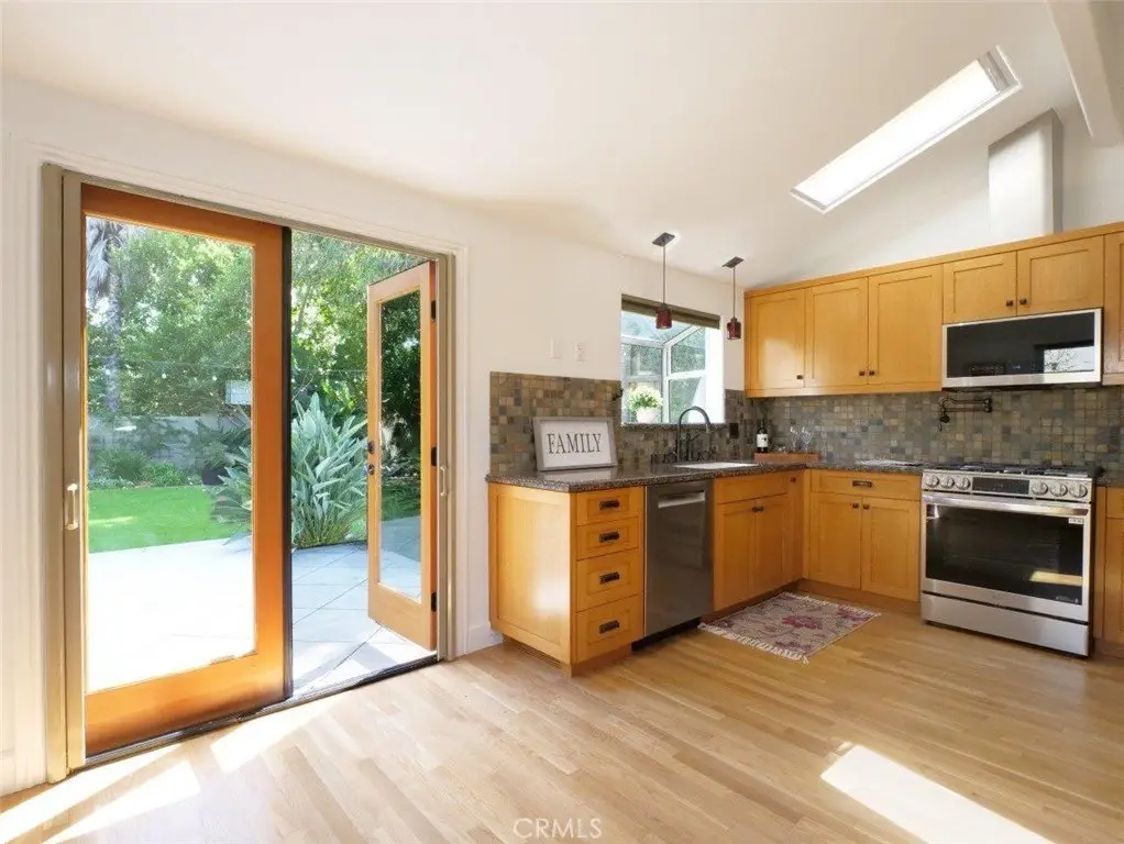 Welcome Home! Step into this charming home featuring soaring ceilings and gorgeous hardwood floors throughout. Stay comfortable year-round with air conditioning and Milgard double-pane windows that fill the home with natural light. The updated kitchen is a chef’s dream, boasting granite counters, custom soft-close cabinetry, a pot-filler, and premium appliances including a Bosch dishwasher, LG refrigerator, newer stove, and microwave. Skylights in both the kitchen and bathroom add extra brightness. Dual glass doors open to a private backyard oasis with mature trees, a built-in grill, and a dining area—perfect for California indoor-outdoor living. Bedrooms are appointed with Hunter fans, blackout blinds, and custom closets with beveled glass. The bathroom features an antique vanity, bidet, dual showerheads, and beautiful slate walls with tiled flooring. Additional highlights include cherry wood interior doors, LED lighting throughout, and a garage with washer/dryer hookups, sink, cabinetry, and an automatic roll-up door.