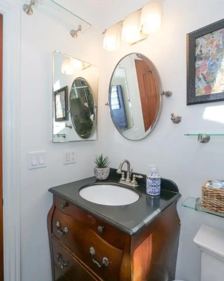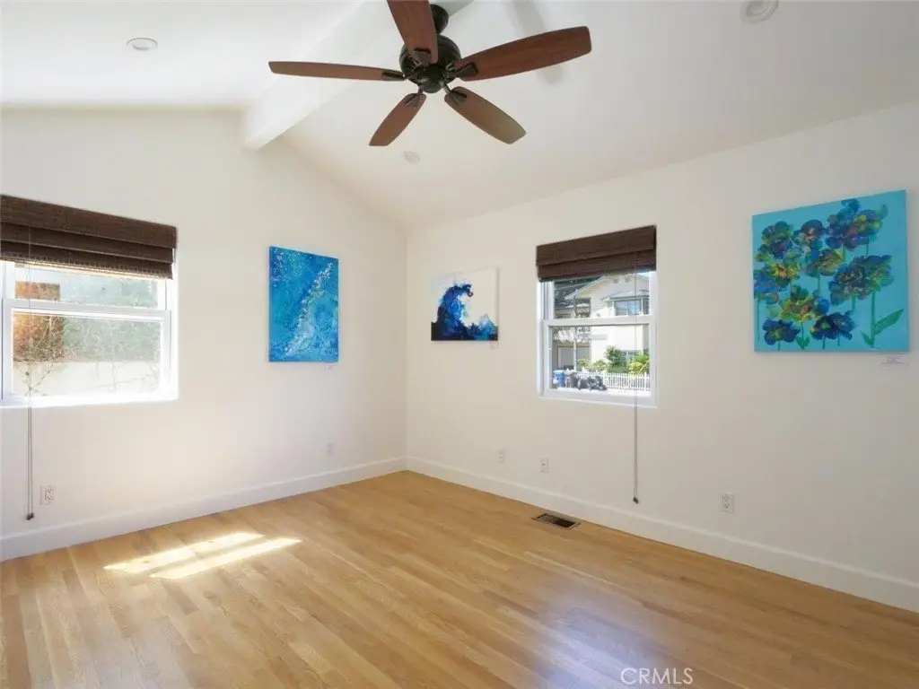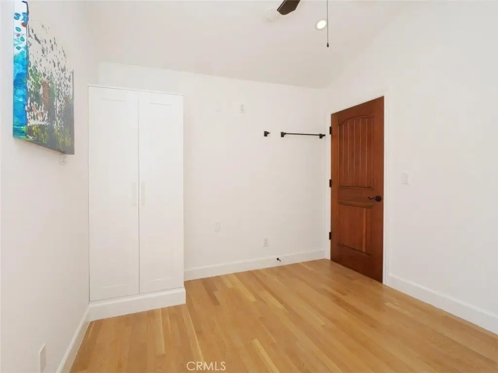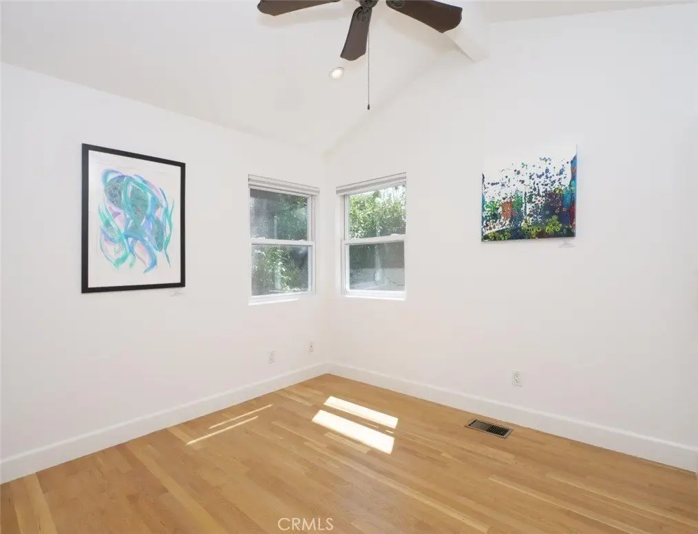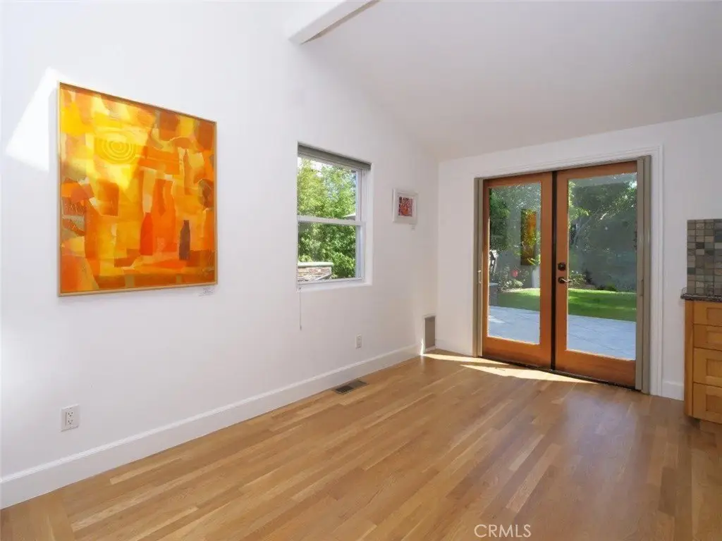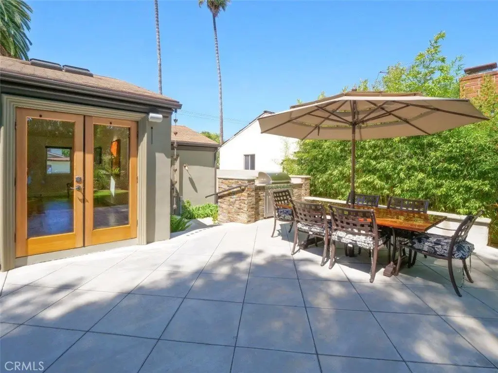 Welcome Home! Step into this charming home featuring soaring ceilings and gorgeous hardwood floors throughout. Stay comfortable year-round with air conditioning and Milgard double-pane windows that fill the home with natural light. The updated kitchen is a chef’s dream, boasting granite counters, custom soft-close cabinetry, a pot-filler, and premium appliances including a Bosch dishwasher, LG refrigerator, newer stove, and microwave. Skylights in both the kitchen and bathroom add extra brightness. Dual glass doors open to a private backyard oasis with mature trees, a built-in grill, and a dining area—perfect for California indoor-outdoor living. Bedrooms are appointed with Hunter fans, blackout blinds, and custom closets with beveled glass. The bathroom features an antique vanity, bidet, dual showerheads, and beautiful slate walls with tiled flooring. Additional highlights include cherry wood interior doors, LED lighting throughout, and a garage with washer/dryer hookups, sink, cabinetry, and an automatic roll-up door.