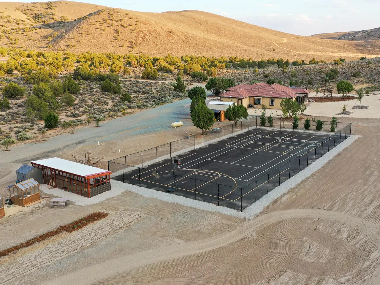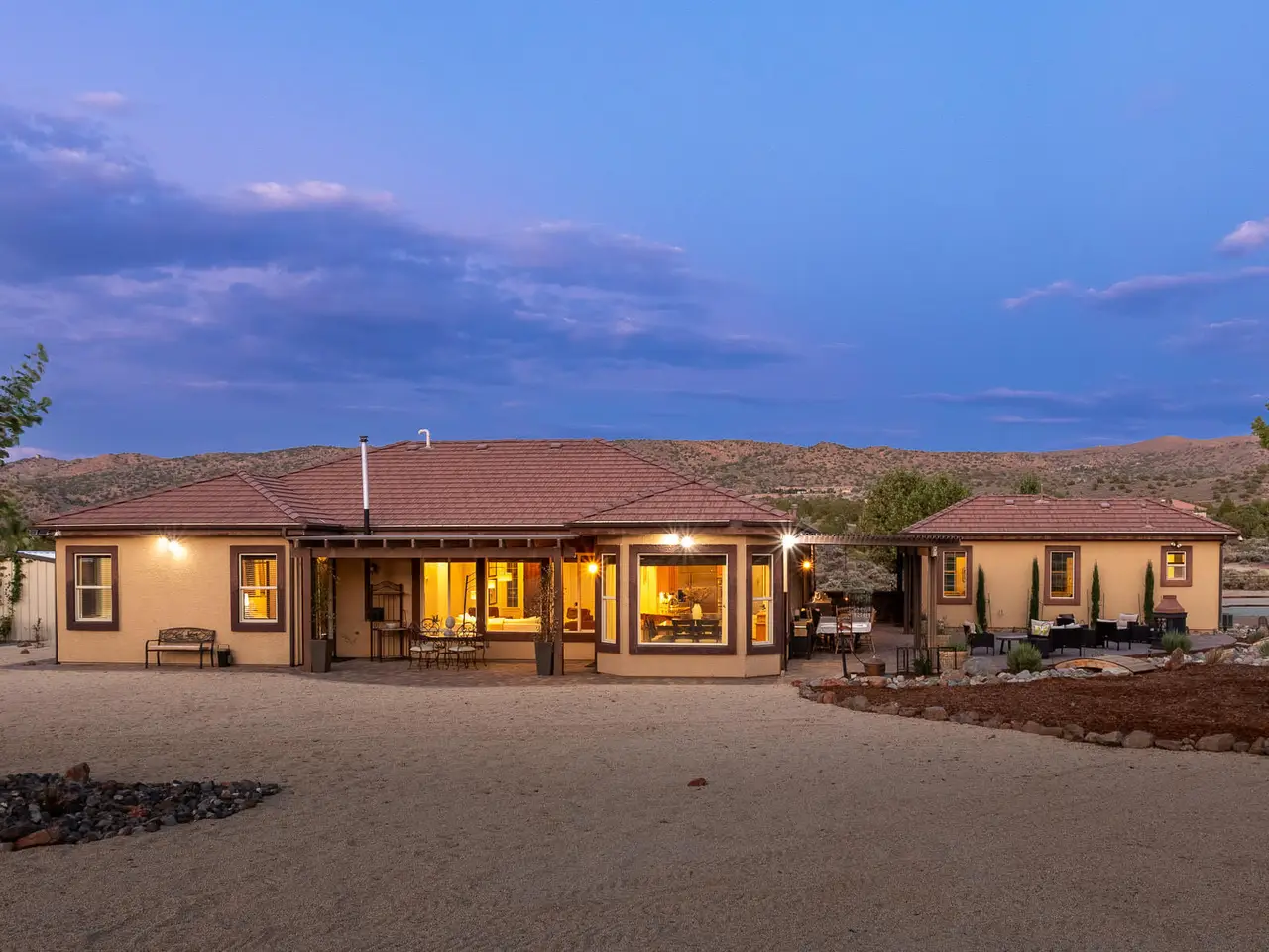 A taste of Italy awaits! Nestled on a serene 45+ acre estate, this custom-built, single-story home is Exceptionally Private being surrounded by picturesque mountains! With 2701+-sq ft. which includes a charming, detached Casita/in-law suite for additional privacy, Plus a 5-Car Garage. The gourmet kitchen is a chef's dream w/ slab marble, high end GE Monogram appliances, including a 48" built in fridge, double ovens, 5 burner gas stove, solid wood cabinetry, walk in pantry, large eating bar & an adjacent dining area spacious enough for 8 w/ sweeping mountain views! Relax and unwind in the expansive living room, under tall ceilings, where custom built shelving adds a modern look. Large bright windows throughout the home invite an abundance of natural light and frame the pleasing views. Your Primary suite offers a spa-like bathroom featuring a jetted soaking tub & separate steam shower to relax and rejuvenate. The unique stained concrete floors are an unexpected flare throughout & help keep the home naturally cool during hot summer months. Wait until you see the grounds! Between the Casita and the house, you'll find an expansive paver patio with a covered hot tub, outdoor dining table, perfect for meals under the star filled skies. Tennis, Pickle Ball or Basketball enthusiasts? Enjoy your Professional fenced Outdoor Sport Court! Ensuring fun for everyone. The estate also boasts over 25 fruit trees-including cherries, apples, pears, peaches, plums & grapes-along with 2 greenhouses equipped w/ water/electric, extra-large chicken run/coop & multiple outbuildings. The wide-ranging land offers ample room for a large arena, barn, or equestrian set up. Whether you are envisioning a boutique farm or a hobby ranch, this property can accommodate it all! If you are ready to leave the fast pace behind and embrace the tranquility of this exceptional property, this is the perfect place to start your next chapter. Schedule a visit today & discover why this stunning estate could be your perfect new home.