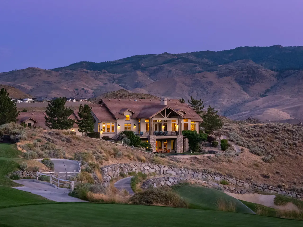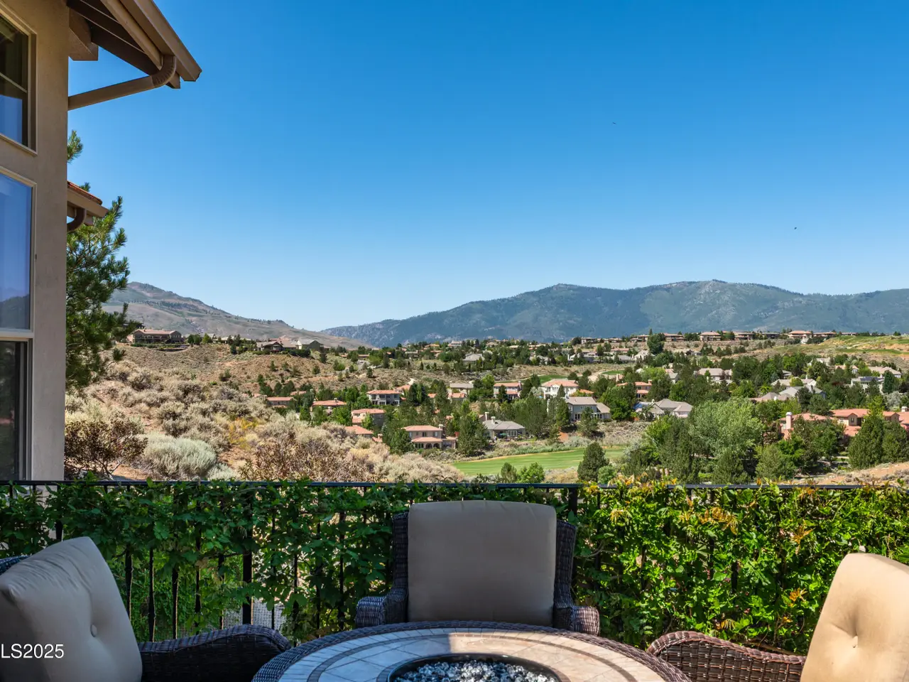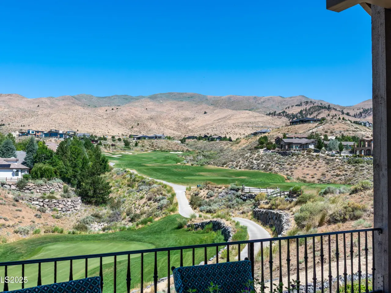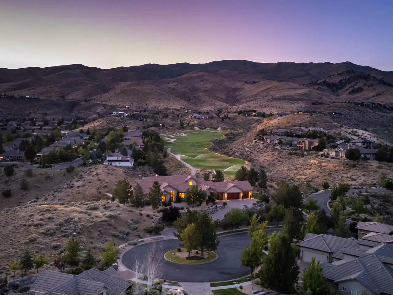 Welcome to luxury living in a small gated enclave within Reno's Somersett Community. Just off the 4th roundabout, this custom home overlooks the signature 3rd hole and 4th tee of the Tom Kite designed Somersett Golf course. Enjoy stunning sunsets from the wisteria-covered deck that spans the great room, kitchen, and primary suite. The spacious primary suite with panoramic mountain and golf course views is complete with reading nook, coffee bar, soaking tub with fireplace and a glamorously sized closet. The den and powder room are just off the foyer. A charming guest suite flows into the enclosed courtyard with a barbecue and seating area. Downstairs, discover two guest suites, a family room with wet bar and wine storage, and a six-seat movie theater. The .86-acre lot includes a 4-car, 1,400 sq. ft. garage with workspace and attic storage. Don't golf? Visit the town square for dining or wander to the HOA rec center with amenities including two pools, tennis & pickleball, a gym and Canyon Nine Golf Course. Trails and Parks are featured throughout the community. This is refined, relaxed living in one Reno's most desirable settings—where views, privacy, and comfort come together seamlessly.