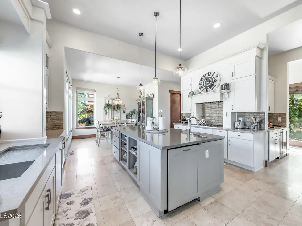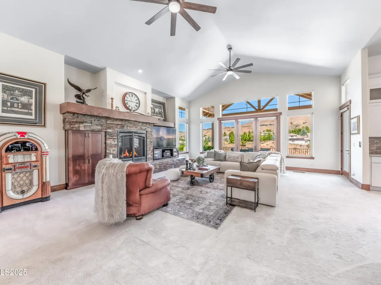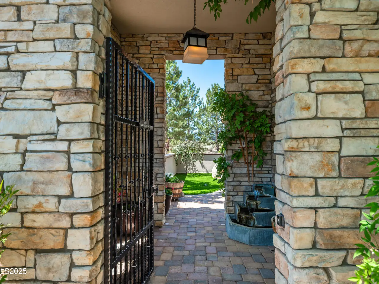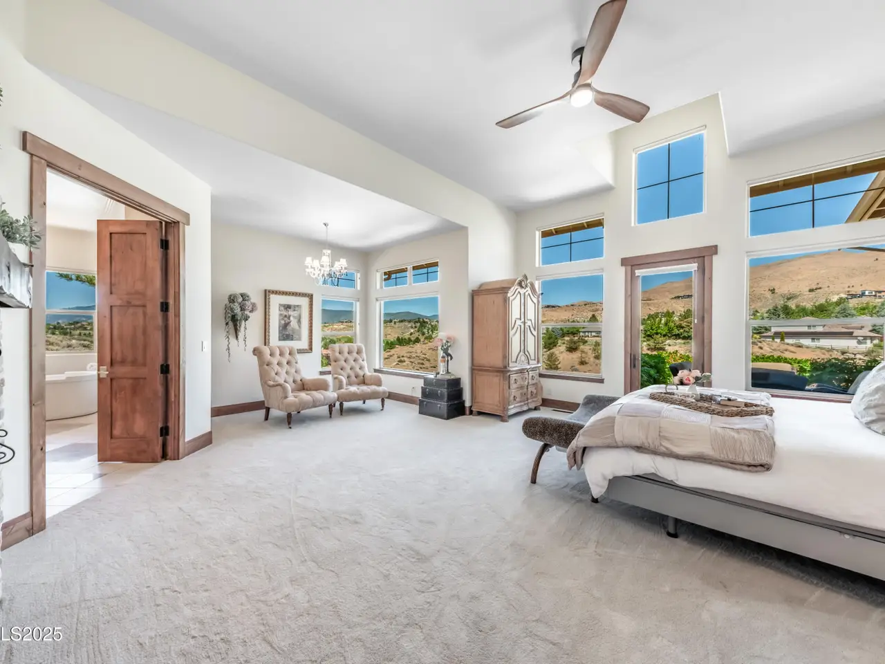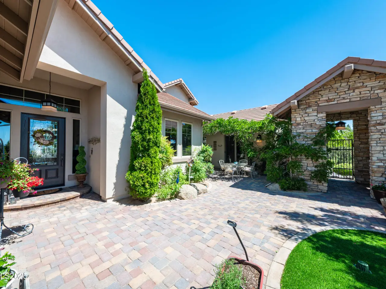 Welcome to luxury living in a small gated enclave within Reno's Somersett Community. Just off the 4th roundabout, this custom home overlooks the signature 3rd hole and 4th tee of the Tom Kite designed Somersett Golf course. Enjoy stunning sunsets from the wisteria-covered deck that spans the great room, kitchen, and primary suite. The spacious primary suite with panoramic mountain and golf course views is complete with reading nook, coffee bar, soaking tub with fireplace and a glamorously sized closet. The den and powder room are just off the foyer. A charming guest suite flows into the enclosed courtyard with a barbecue and seating area. Downstairs, discover two guest suites, a family room with wet bar and wine storage, and a six-seat movie theater. The .86-acre lot includes a 4-car, 1,400 sq. ft. garage with workspace and attic storage. Don't golf? Visit the town square for dining or wander to the HOA rec center with amenities including two pools, tennis & pickleball, a gym and Canyon Nine Golf Course. Trails and Parks are featured throughout the community. This is refined, relaxed living in one Reno's most desirable settings—where views, privacy, and comfort come together seamlessly.