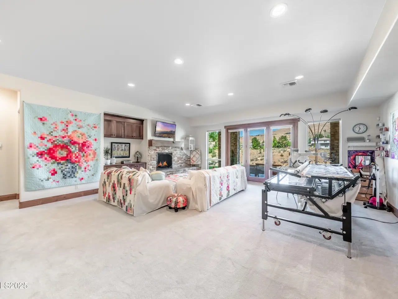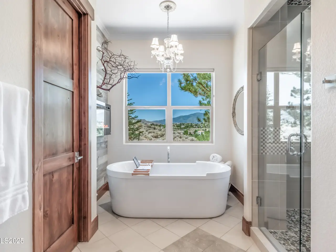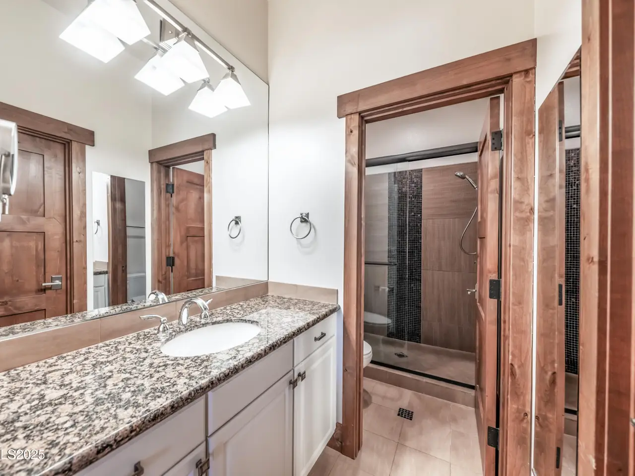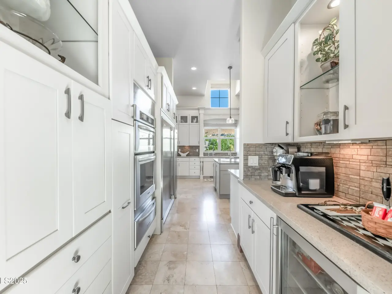 Welcome to luxury living in a small gated enclave within Reno's Somersett Community. Just off the 4th roundabout, this custom home overlooks the signature 3rd hole and 4th tee of the Tom Kite designed Somersett Golf course. Enjoy stunning sunsets from the wisteria-covered deck that spans the great room, kitchen, and primary suite. The spacious primary suite with panoramic mountain and golf course views is complete with reading nook, coffee bar, soaking tub with fireplace and a glamorously sized closet. The den and powder room are just off the foyer. A charming guest suite flows into the enclosed courtyard with a barbecue and seating area. Downstairs, discover two guest suites, a family room with wet bar and wine storage, and a six-seat movie theater. The .86-acre lot includes a 4-car, 1,400 sq. ft. garage with workspace and attic storage. Don't golf? Visit the town square for dining or wander to the HOA rec center with amenities including two pools, tennis & pickleball, a gym and Canyon Nine Golf Course. Trails and Parks are featured throughout the community. This is refined, relaxed living in one Reno's most desirable settings—where views, privacy, and comfort come together seamlessly.