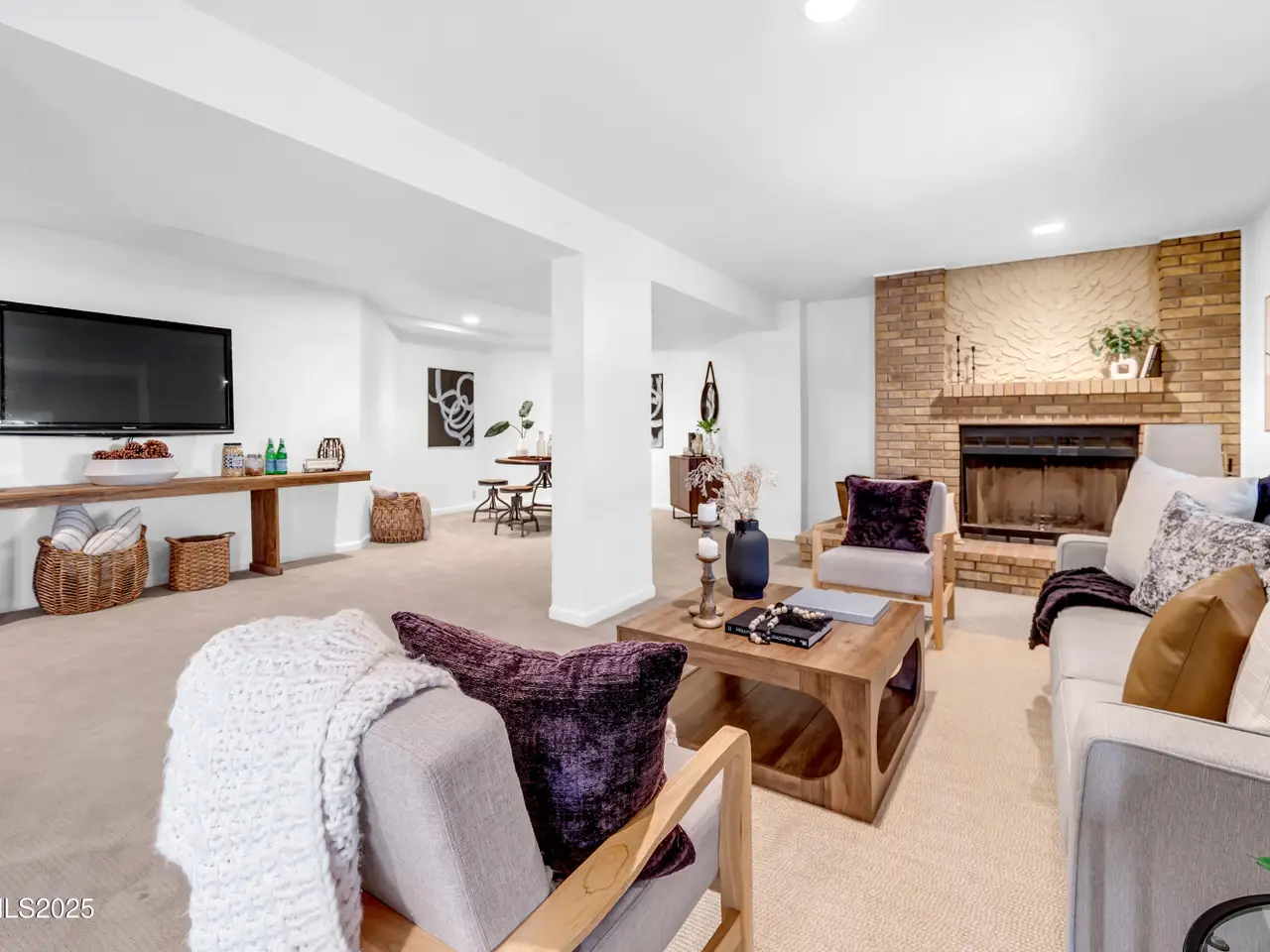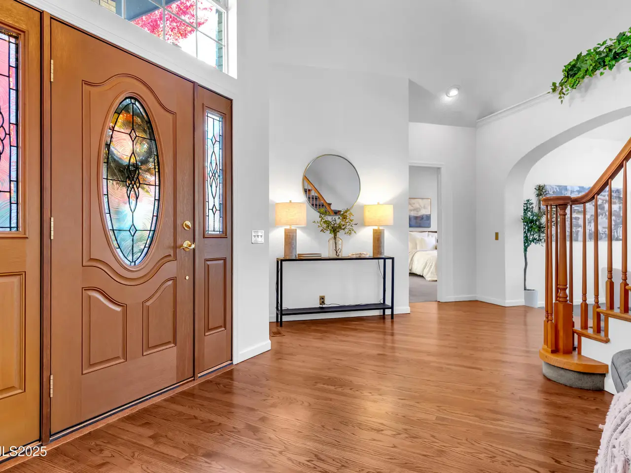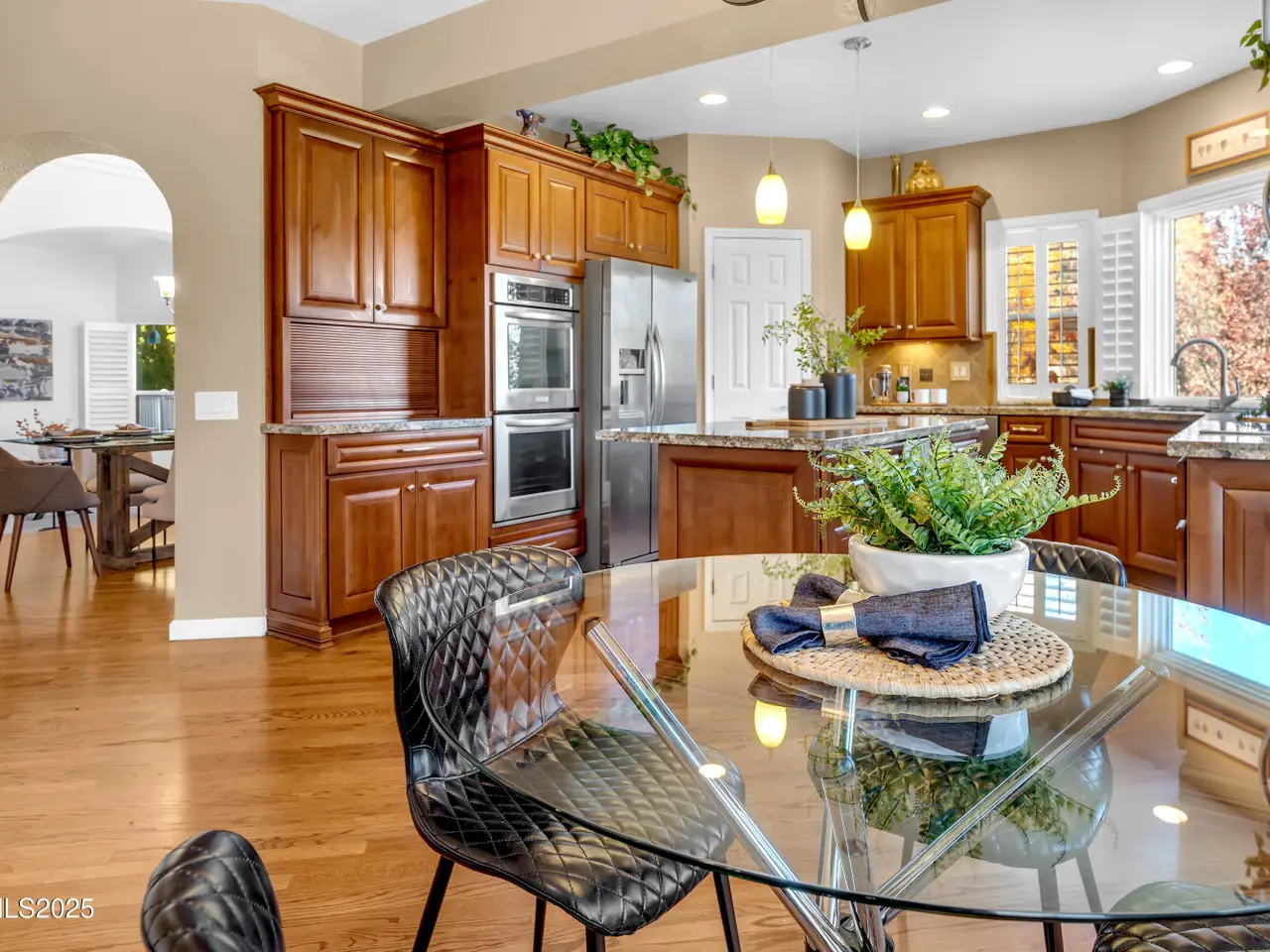 This majestic home, nestled on one of Reno's most picturesque streets, offers an unparalleled living experience. Centrally located in SW Reno, it provides convenient access to all the amenities and attractions you desire. Step into quality craftsmanship and custom details in this meticulously maintained home. The main level boasts beautiful wood floors, plantation shutters, and high ceilings. An inviting entry features a sweeping staircase beneath a dramatic cathedral ceiling. The living and dining rooms are open yet defined, offering tree views through large windows and deck access through French doors. The kitchen is a chef's dream, featuring a corner sink with windows overlooking mature trees, a walk-in pantry, a center island with a breakfast bar, an appliance garage, a trash compactor, a dining nook, and high-end appliances. It overlooks a warm and inviting family room, complete with a wood-burning fireplace and ceiling fan. A bar with display cabinets, a sink, and granite counters makes entertaining effortless - the perfect spot to relax and enjoy a game or movie. The large primary bedroom, conveniently located on the main floor, offers tall ceilings, ceiling fan, and French doors leading to the deck. Its spacious en-suite bathroom includes a soaking tub, a roomy shower, and an extensive vanity with two sinks, complemented by separate his and hers closets. The second story features a large loft/office with built-in shelves and double doors for privacy, along with three generous bedrooms and a full bathroom with a tub. The walk-out basement offers endless possibilities: multi-generational living, a teenage hangout, family entertainment space, a man cave, additional office space, or simply room to spread out. The spacious main area includes a wood-burning fireplace, a nook ideal for a game table, and easy access to the lower deck and backyard. There's also a large bedroom and full bathroom, plus a bonus room, perfect for an in-law unit or guest suite. Abundant storage is available in a huge laundry/utility room and additional storage closets. Outside, mature and well-maintained landscaping on the expansive half acre lot provides picturesque views from every window. Two beautiful Trex-style decks, one on the main level with convenient stairs to the ground level deck. A wonderful place for parties or relaxing afternoons. An extra-large, finished three-car garage features built-in cabinets and new paint. There is NO HOA. A private road maintenance agreement is 500 per year, and an access road easement in the back of the property is managed by the City of Reno. The kitchen refrigerator, washer, dryer and basement TV are included. The home also features a 2022 HVAC system and a newer water heater. Come visit this extraordinary home!