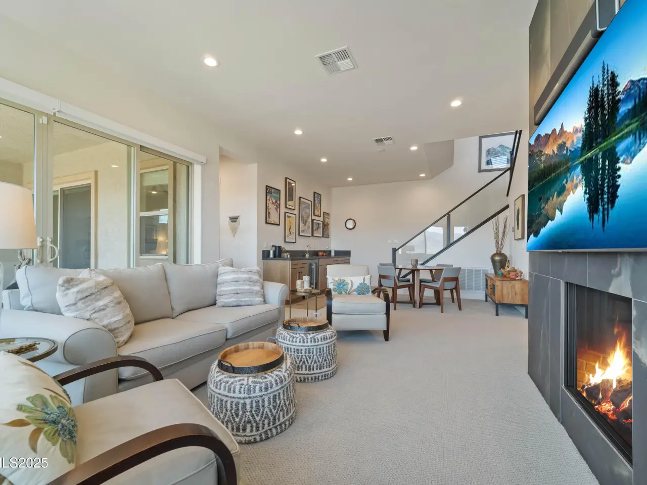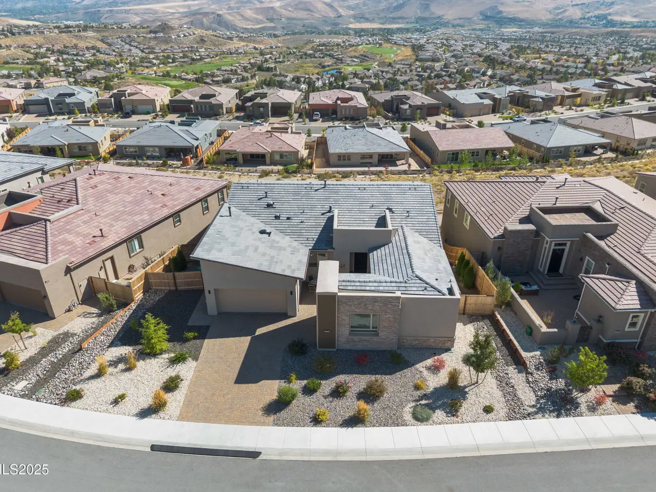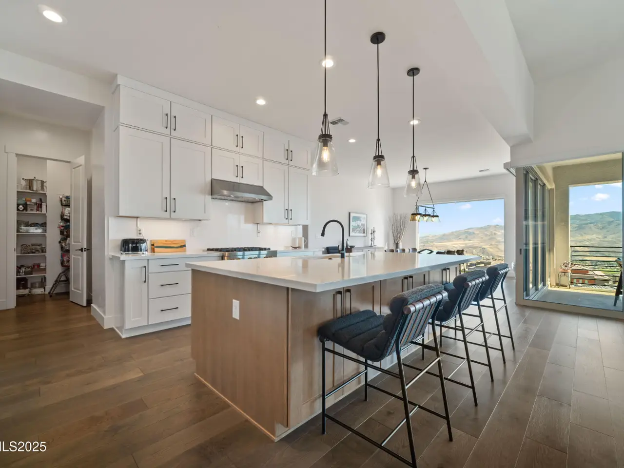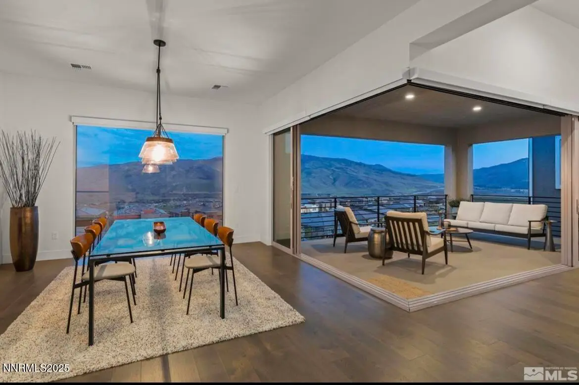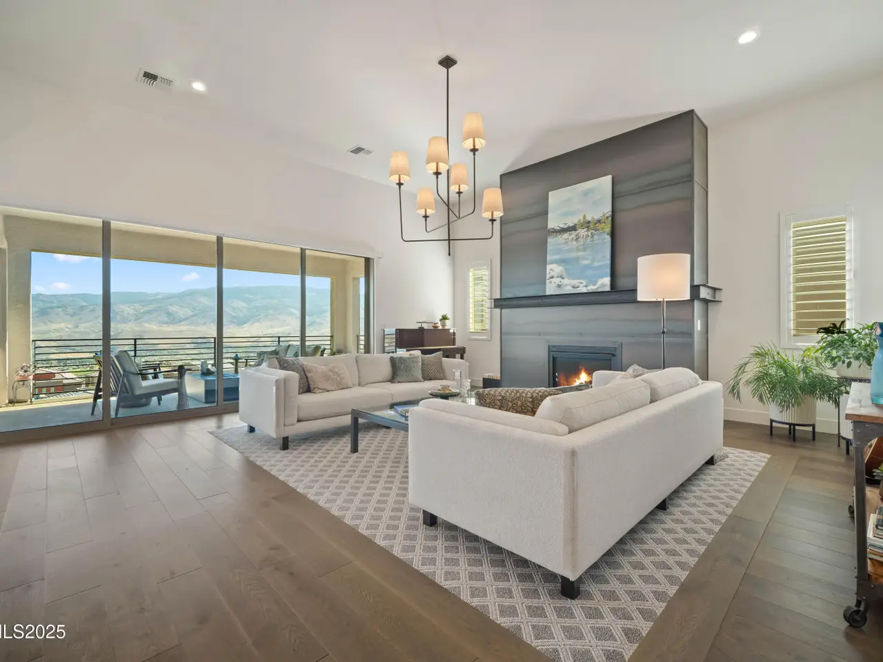 Stunning Modern Home in The Cliffs at Somersett. Discover luxury living in this exquisite 5-bedroom, 5.5-bathroom home located in the prestigious Cliffs community of Somersett. Perched on a premium 180-degree view lot, this meticulously designed residence boasts breathtaking mountain views, sophisticated architecture, and high-end finishes throughout. Enter through a private front courtyard into a spacious open floor plan highlighted by floor-to-ceiling picture windows, hand-troweled walls, and a striking rolled steel fireplace with I-beam detail. The custom glass and wood staircase sets a contemporary tone, while 7" white oak plank flooring adds warmth and elegance. The entertainer's kitchen is a showstopper, featuring a massive 9-foot quartz island, Sub-Zero refrigerator, JennAir appliances, double ovens, a walk-in pantry, and soft-close dovetail cabinetry. Designer light fixtures, black matte hardware, and Italian porcelain surfaces complete the sophisticated design. The walk-out basement includes a newly added fireplace with Italian tile surround, covered patio, and an in-ground hot tub overlooking stunning mountain vistas. Upstairs, enjoy seamless indoor-outdoor living with a multi-panel corner sliding door leading to a large deck—perfect for entertaining. The luxurious primary suite offers a cozy fireplace, spa-like walk-in shower, double vanities, and a spacious walk-in closet. Additional highlights include dual-zone HVAC with two furnaces and water heaters, smart home security, insulated interior walls for soundproofing, never-freeze roof de-icing system, TV/data smurf tubes, a pure water softener, and professionally designed WaterSense landscaping. With a 3-car garage, large laundry/mud room, and exceptional craftsmanship throughout, this home offers comfort, style, and functionality in one of Reno's most sought-after communities.